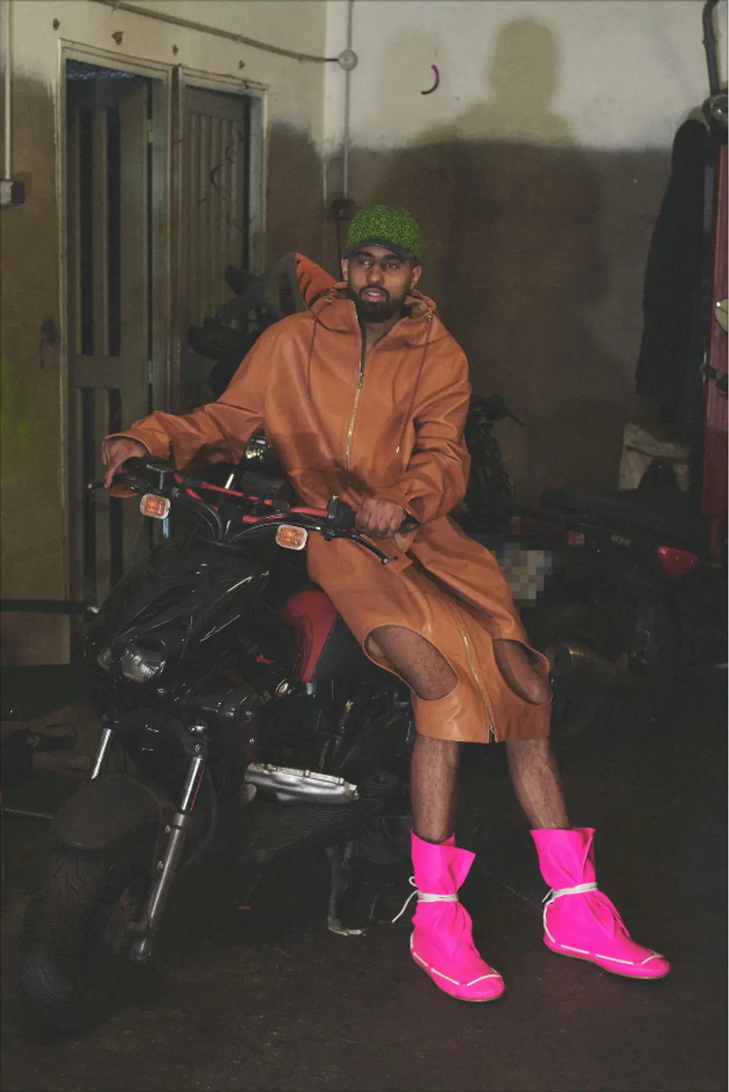 The looks are combined with equally bonkers accessories. Folded boots in hot pink or slime green tied at the ankles like a parcel, padded sliders in Day-Glo yellow and pink, and bumbags – the perfect night-out accompaniment – roll top backpacks for big weekenders and rounded glasses to conceal the wide-eyed sin.