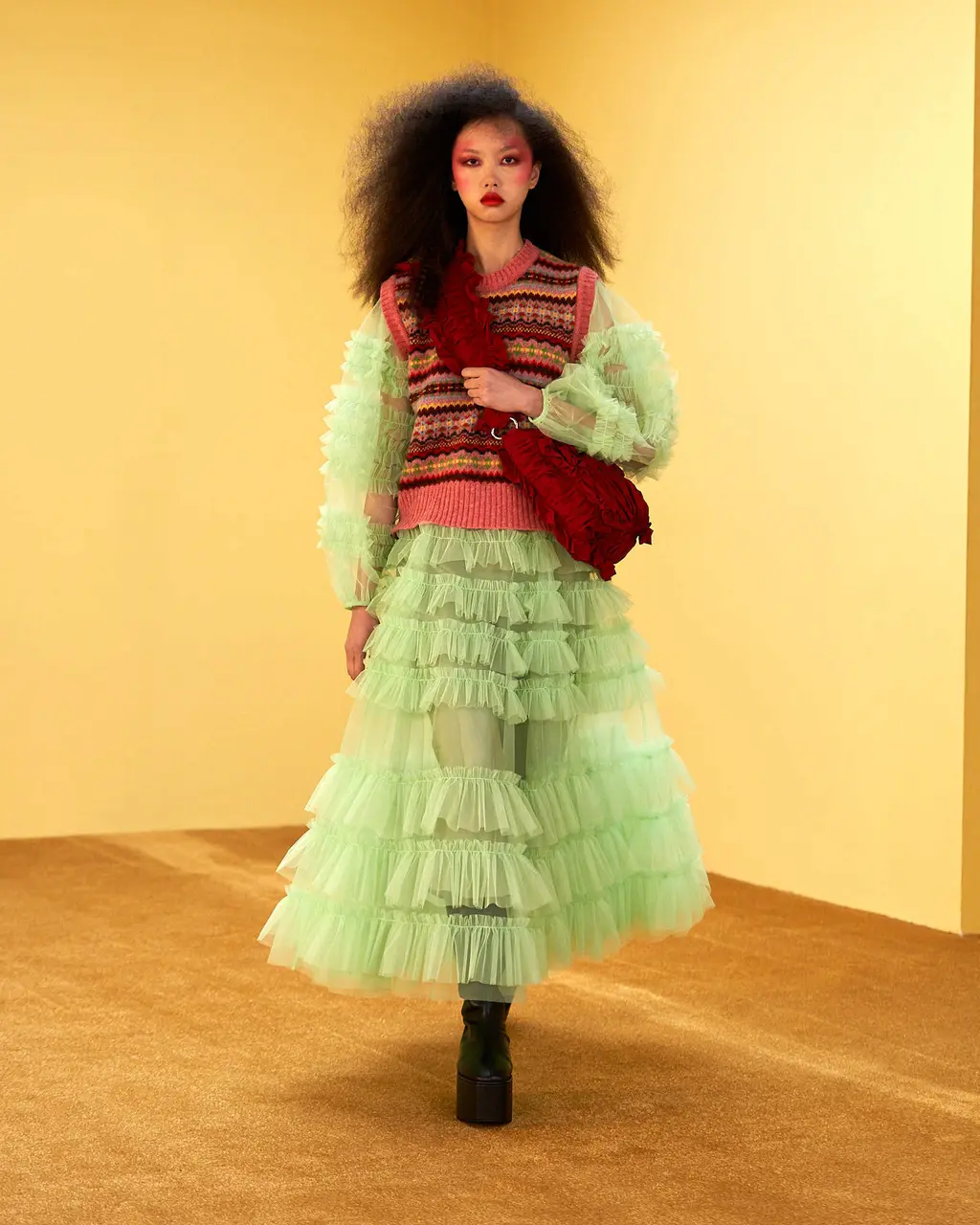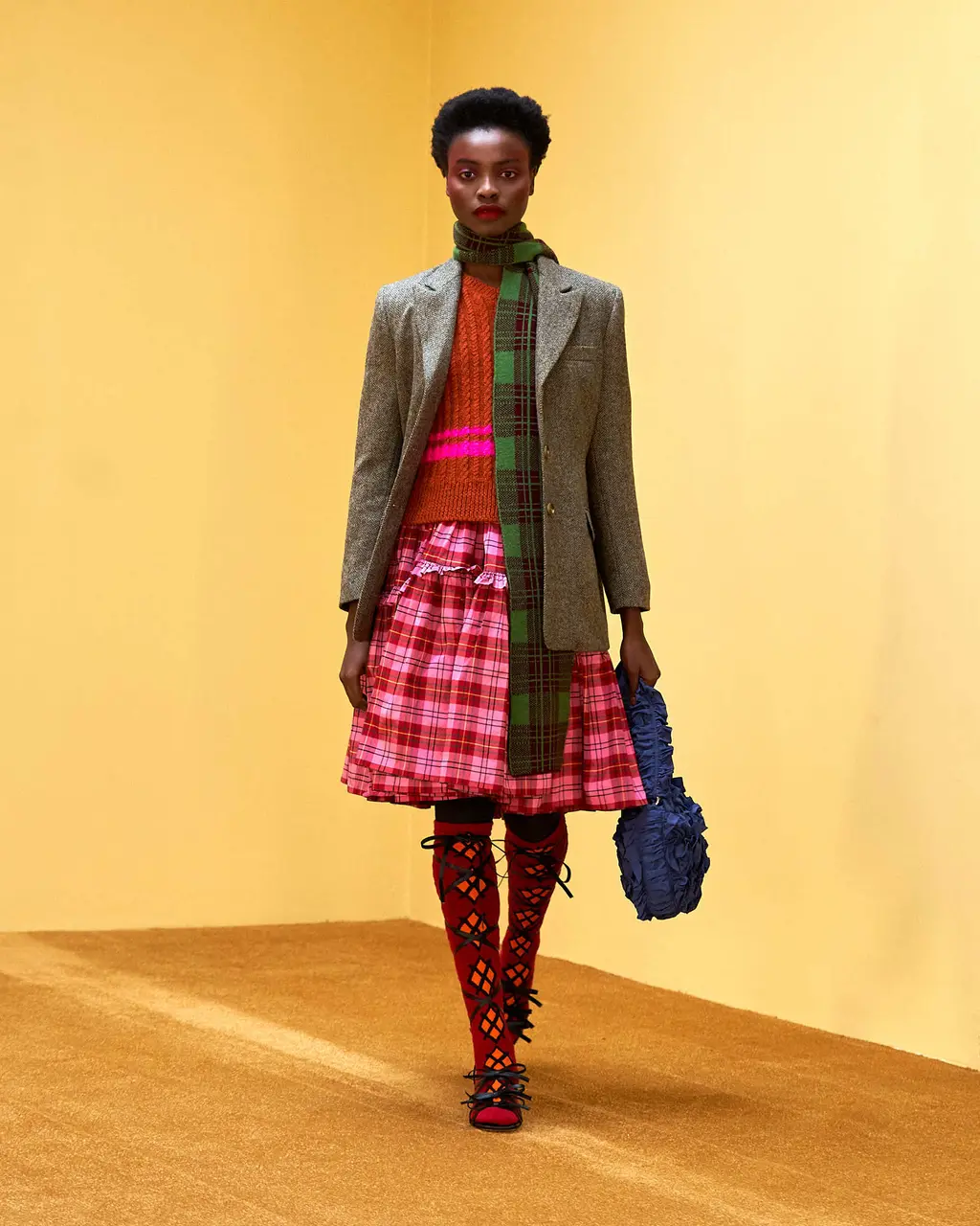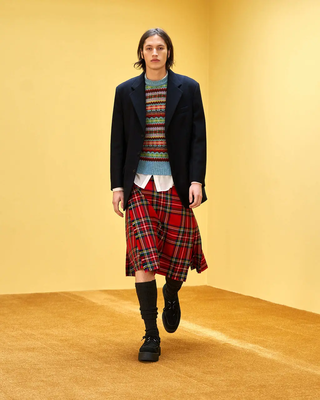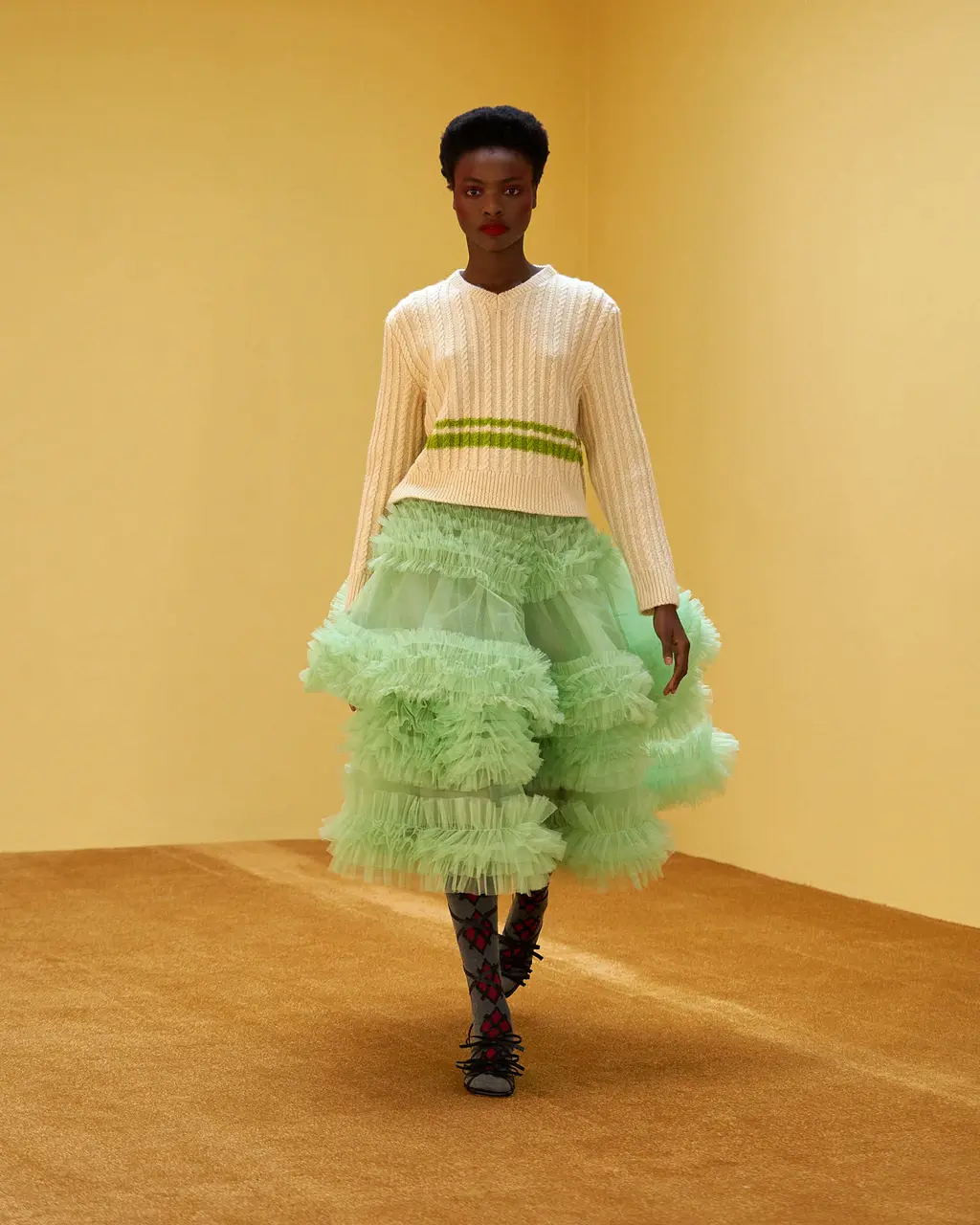 Molly Goddard’s co-ed collection was a boisterous lesson in subversion, reimagining wardrobe staples for an optimistic, post-pandemic future. With traditional knitwear shapes, boxy blazers and tartan coats and kilts – for both men and women – came vibrant, voluminous skirts and a welcome return to the designer’s signature dresses, frothily built from metres of tulle.