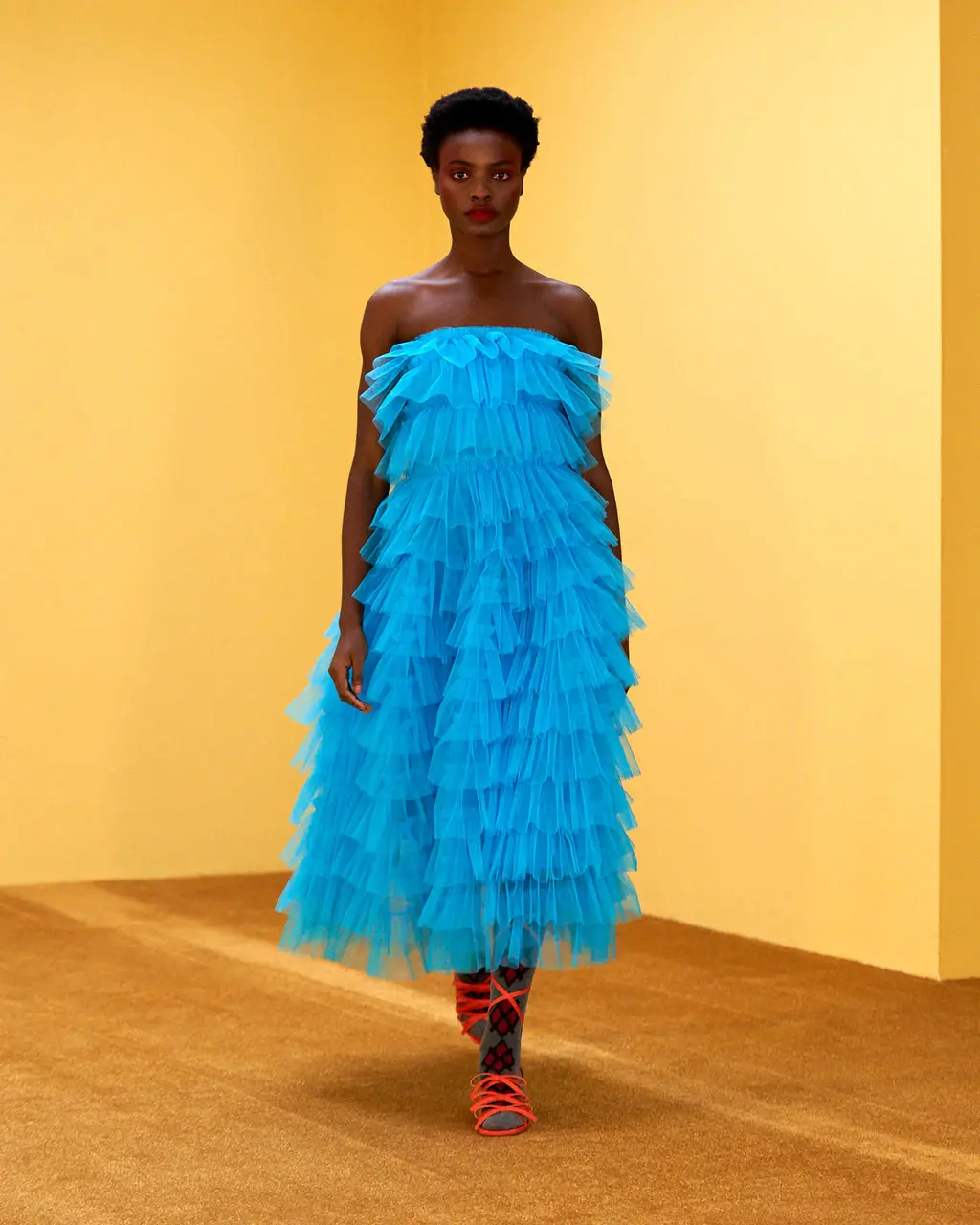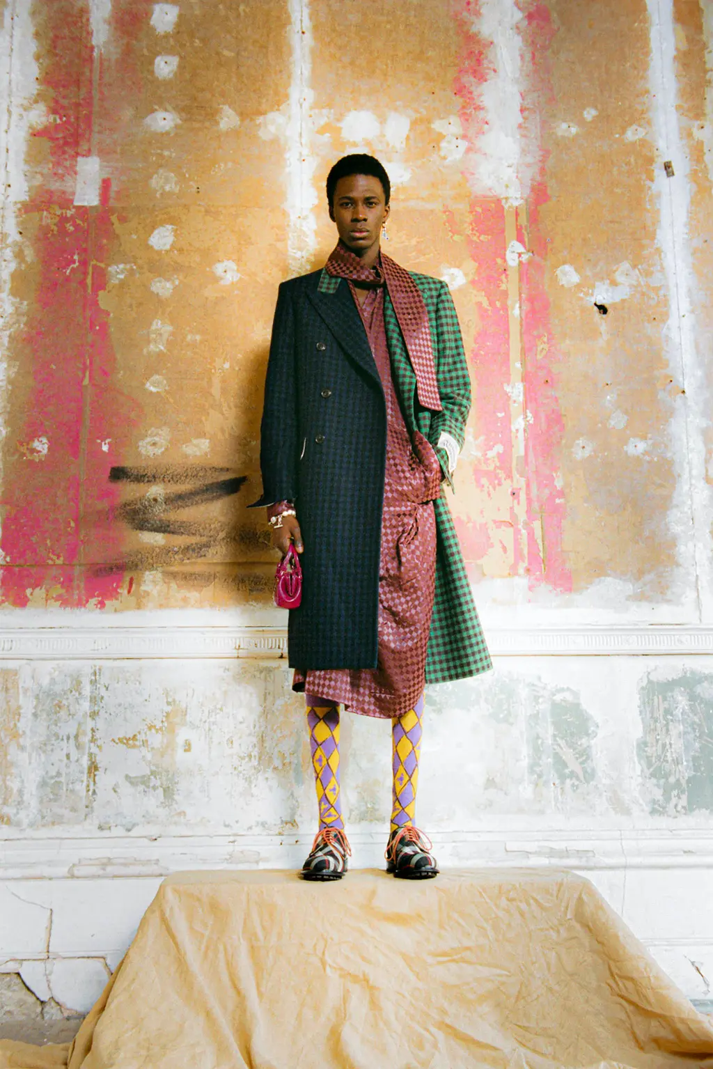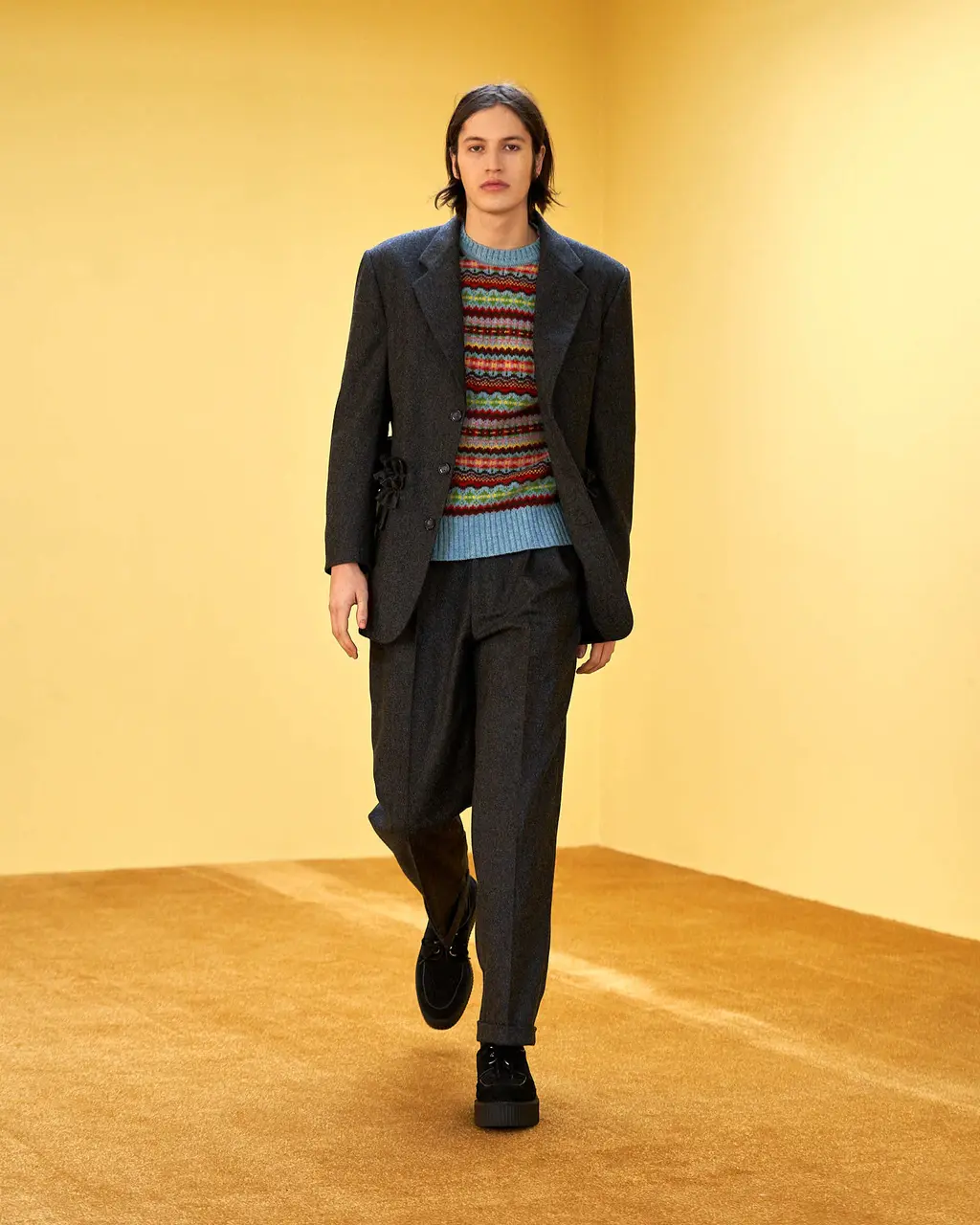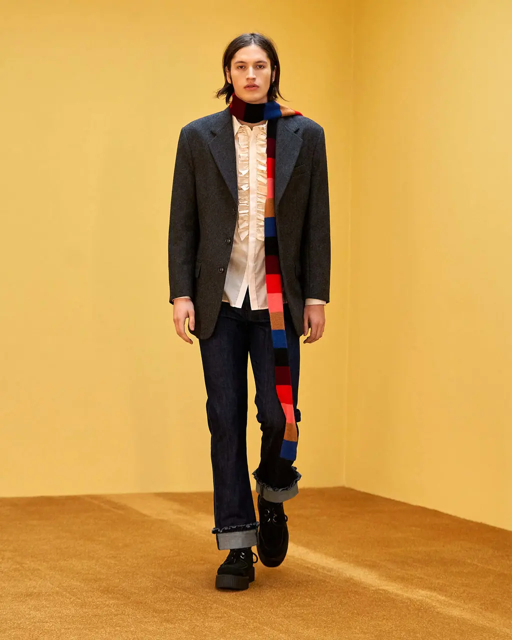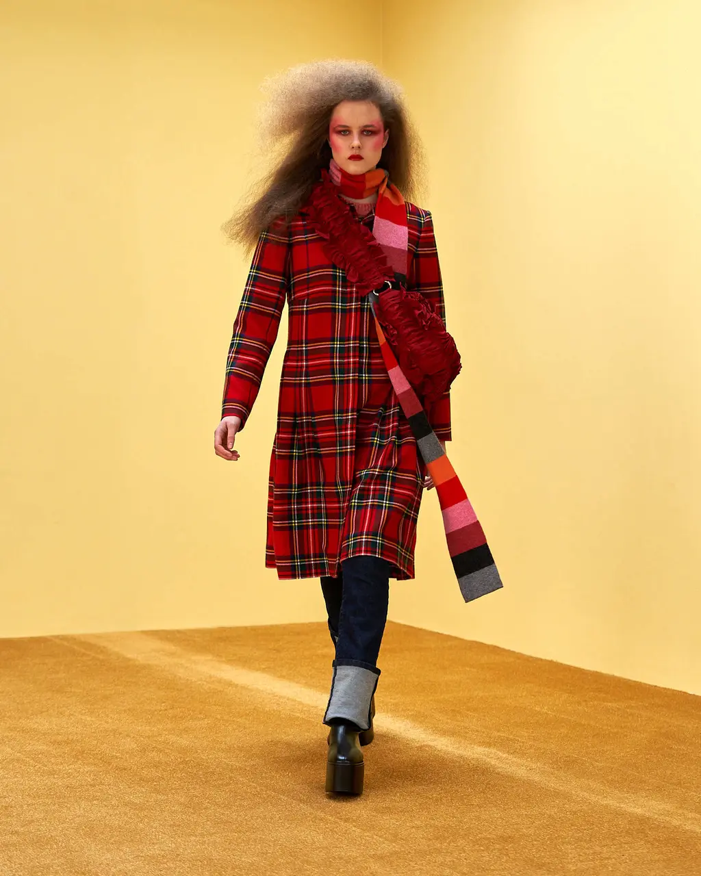 Molly Goddard’s co-ed collection was a boisterous lesson in subversion, reimagining wardrobe staples for an optimistic, post-pandemic future. With traditional knitwear shapes, boxy blazers and tartan coats and kilts – for both men and women – came vibrant, voluminous skirts and a welcome return to the designer’s signature dresses, frothily built from metres of tulle.