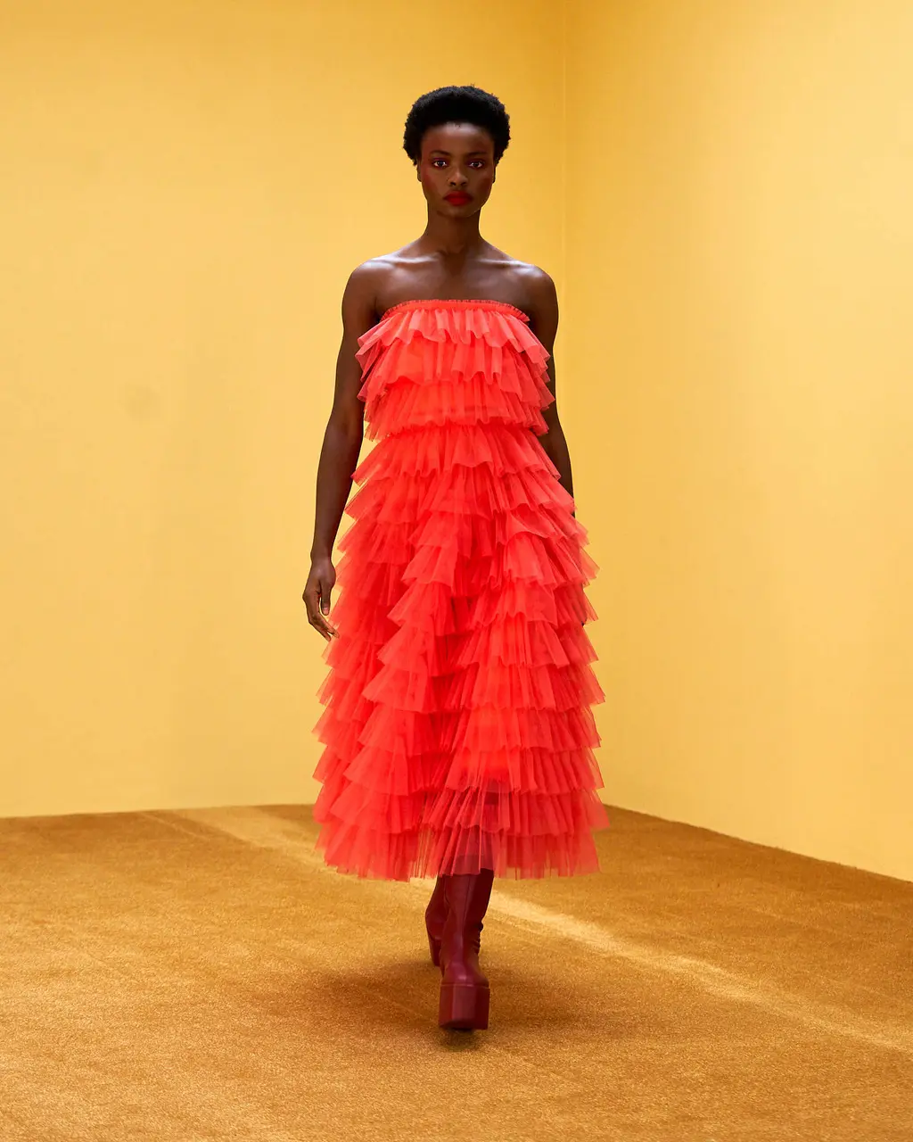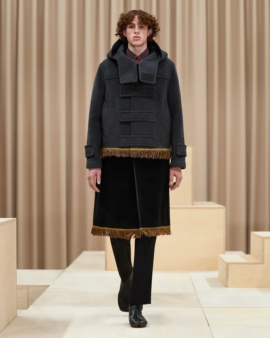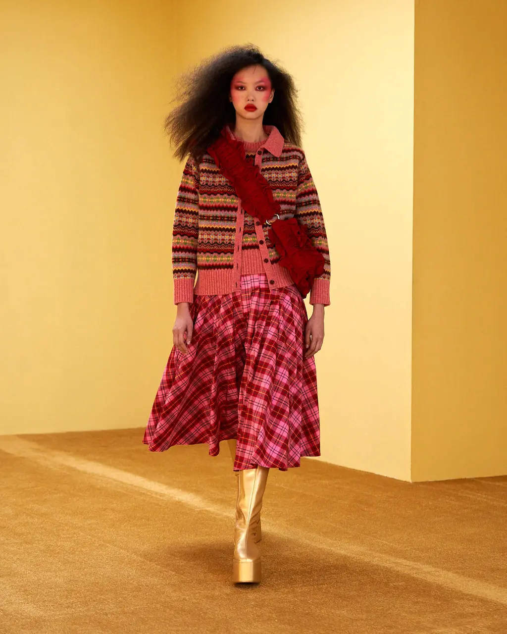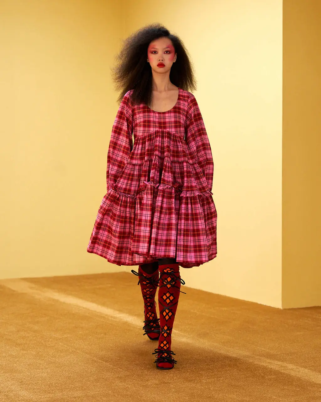 Molly Goddard’s co-ed collection was a boisterous lesson in subversion, reimagining wardrobe staples for an optimistic, post-pandemic future. With traditional knitwear shapes, boxy blazers and tartan coats and kilts – for both men and women – came vibrant, voluminous skirts and a welcome return to the designer’s signature dresses, frothily built from metres of tulle.