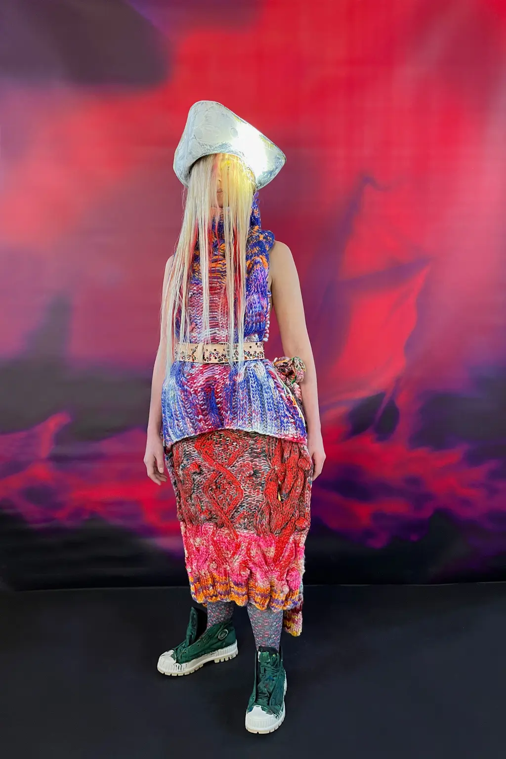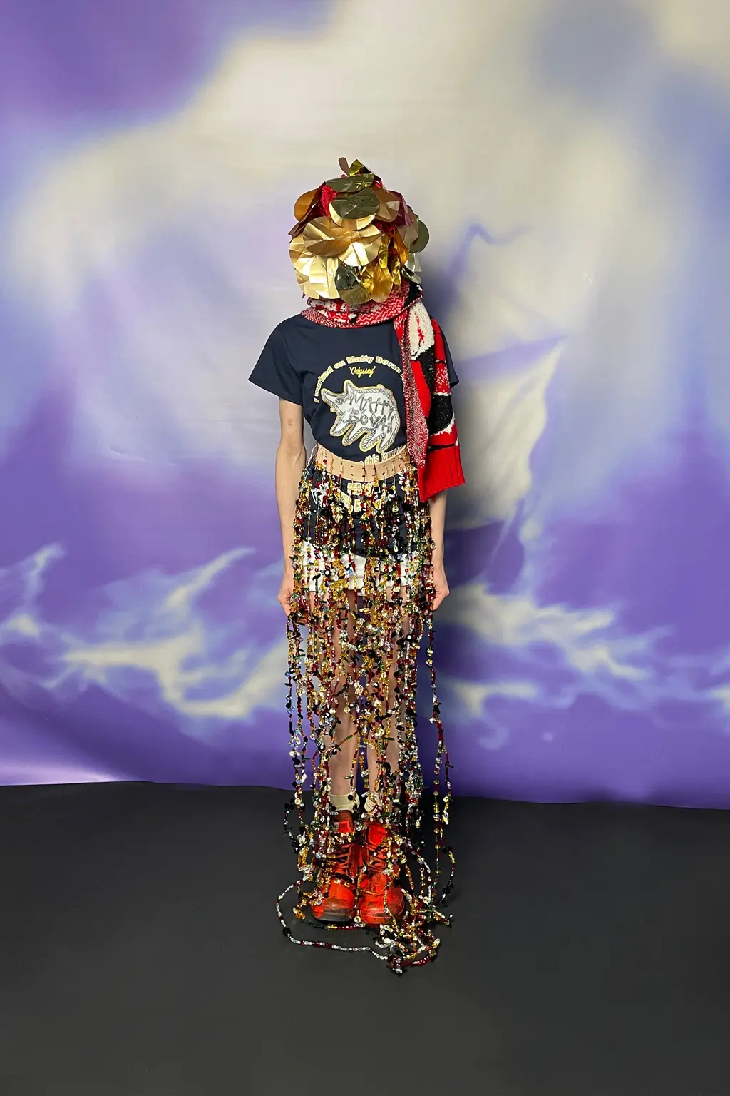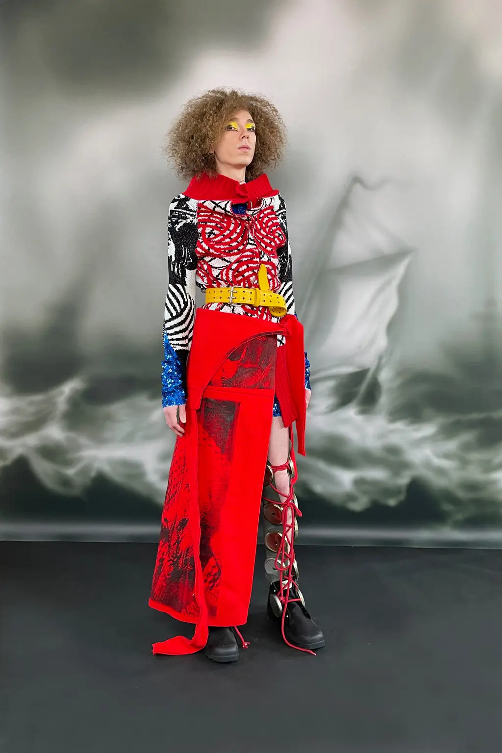 Bovan cites the power of the sea and its elemental and destructive nature as a key reference point for the show, which is reflected in the trippy, layered and otherworldly nature of each garment, like the oversized jeans depicting rolling waves – the denim supplied by sustainable brand ISKO Denim for the second time since Bovan’s SS21 collection. Chunky, checkered knits in contrasting ochre, red and monochrome tones, a sherpa bustier dress matched with powder pink tights and embroidered with thousands of upcycled Swarovski crystals all evoke notions of metamorphosis and the wild, unpredictable nature of the great blue sea. JW