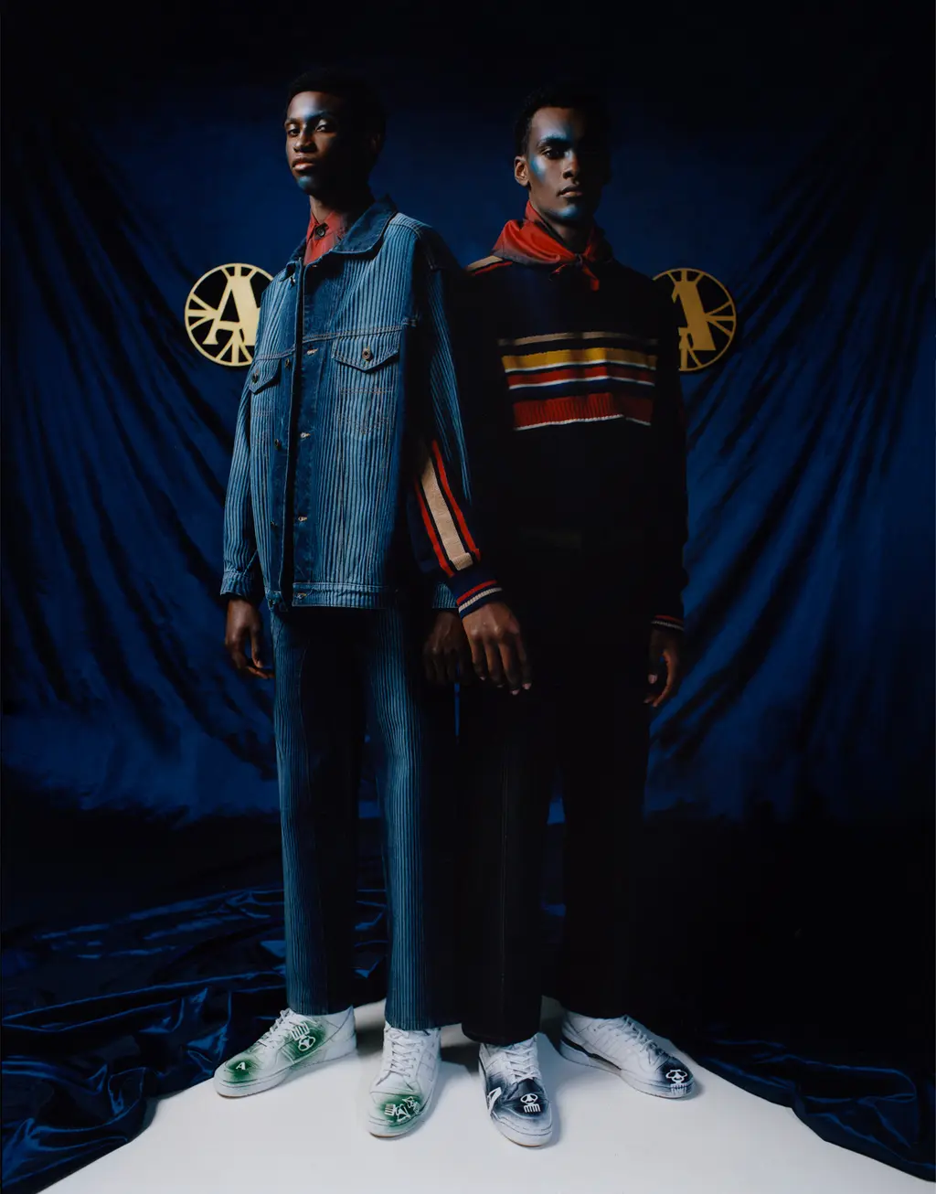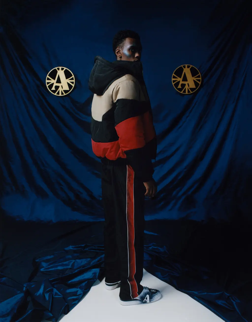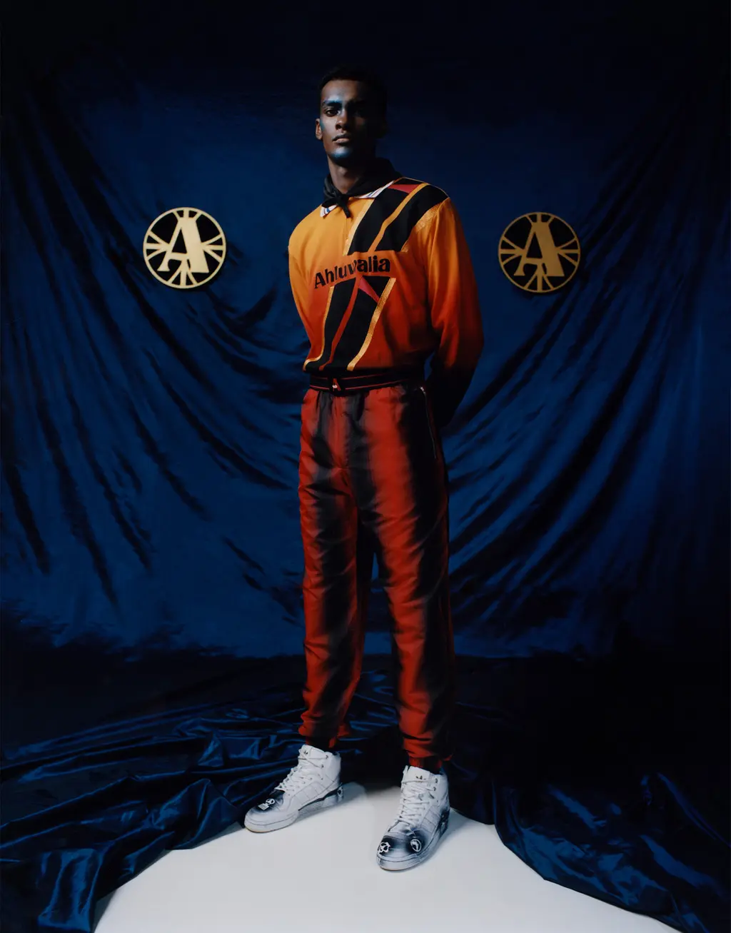 But with Ahluwalia’s determination to take the brand to big business heights comes her consideration for the wearer. There’s a sense of utility throughout, with a multifunctional puffer – the first of Ahluwalia’s – brightly coloured on one side and dark black or blue on the other. It’s an interchangeable element she was keen to address in times of great uncertainty, drawing upon our ever-changing moods, needs and wants. Tailored corduroy trousers warm the body, while ribbed track tops and zipped jackets provide contouring and allow for ease and comfort. As well, Ahluwalia reaffirms her relationship with Adidas, reworking their Forum trainers by incorporating prints like Afro combs, the African continent and globes.