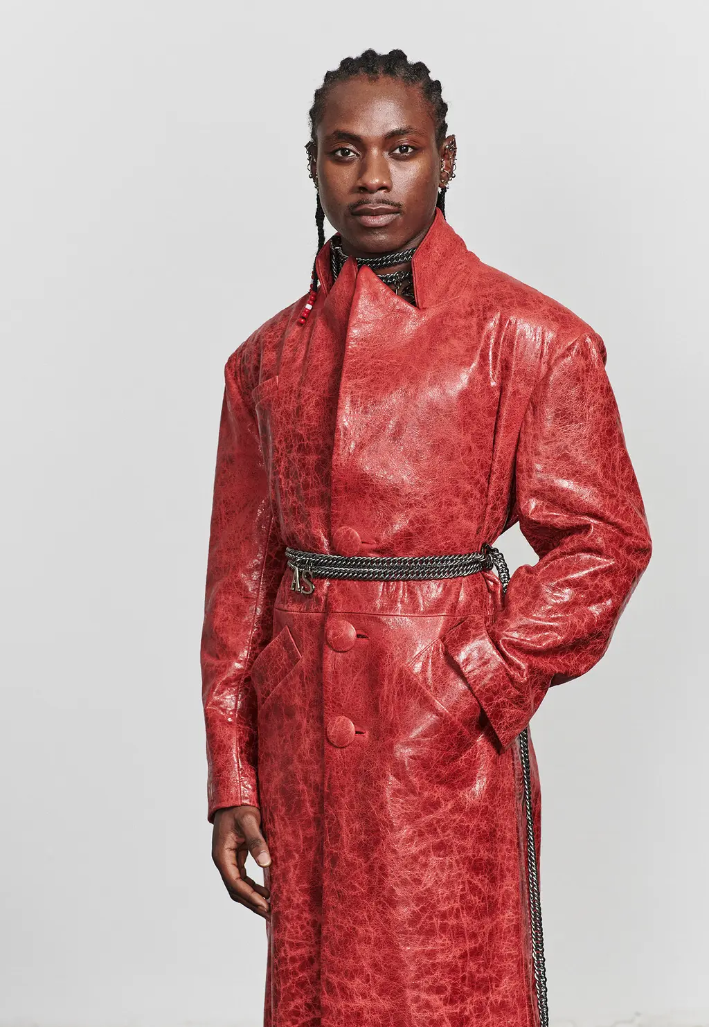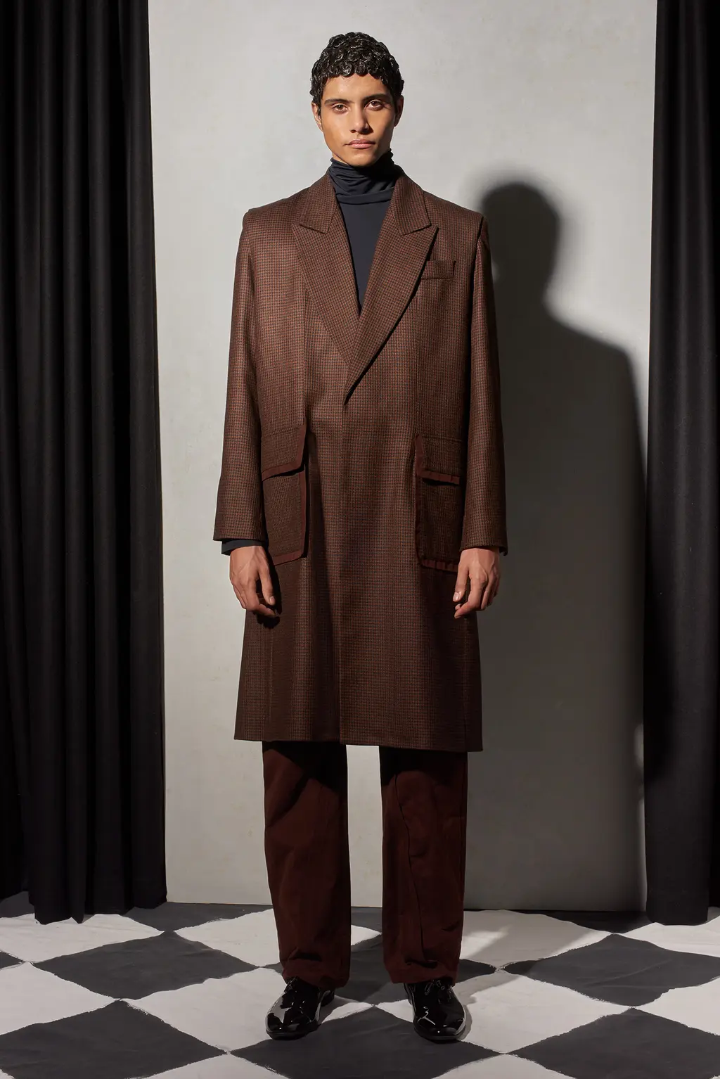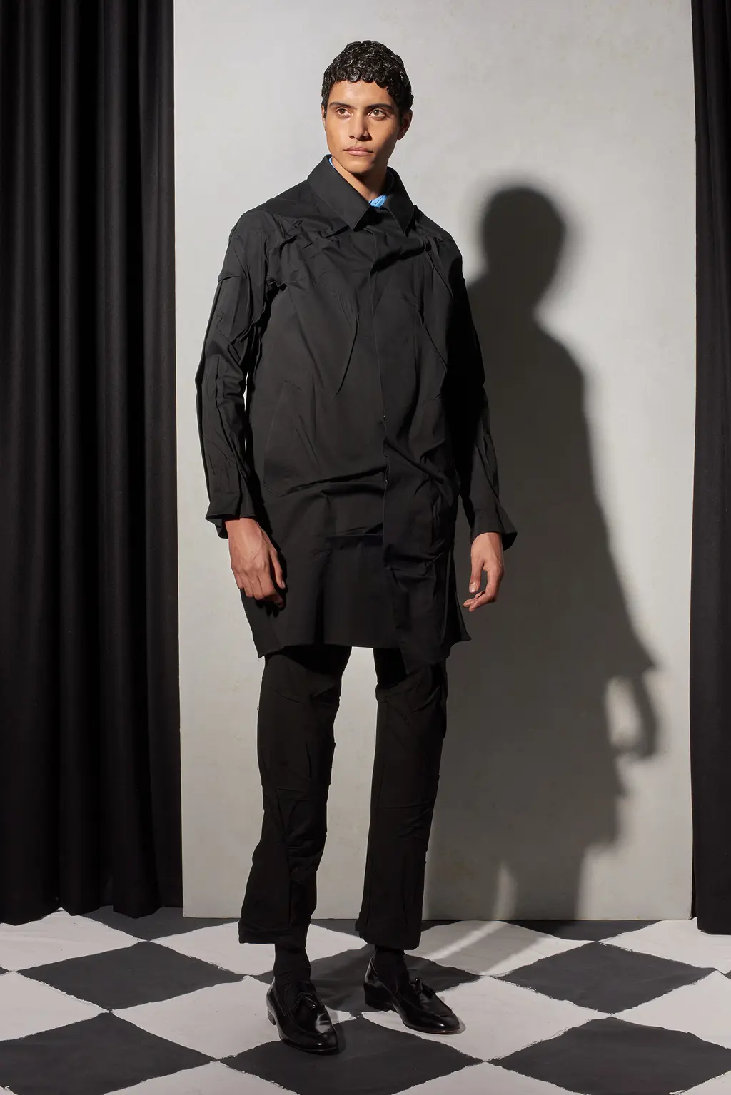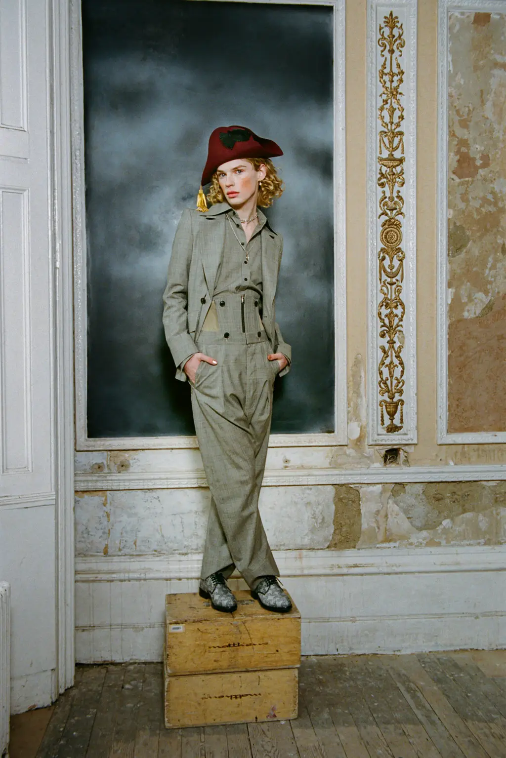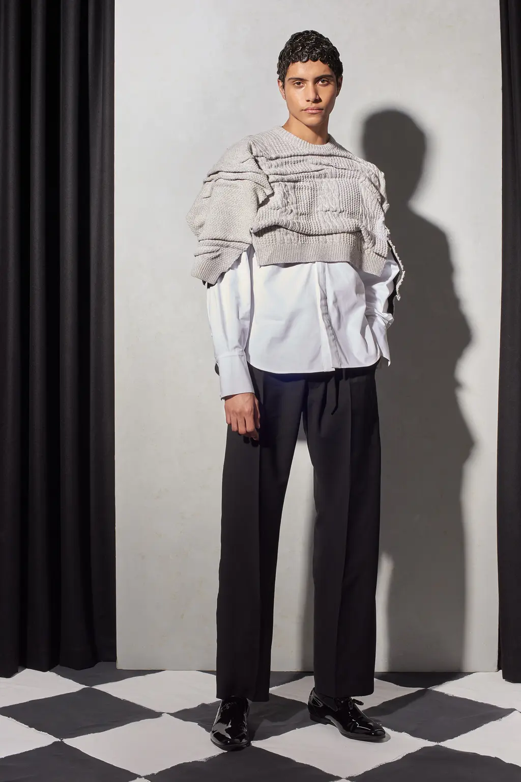 But this current collection, though still eschewing the Meaning of Man, feels his most personal yet.“My work begins with a self-reflectional aspect, it often comes from within,” he says, of the collection titled Twist.“I’m reflecting upon my upbringing and my relationship with garments through the different men I grew up around.” For the designer, the“twist” comes as a contrast between how one presents oneself to the outside world, and the person you truly feel like you are. It’s spurred from many years hiding his gay identity from those around him.“As a lot of my friends began to accept my sexuality, I had a completely different idea on how they would perceive it.”