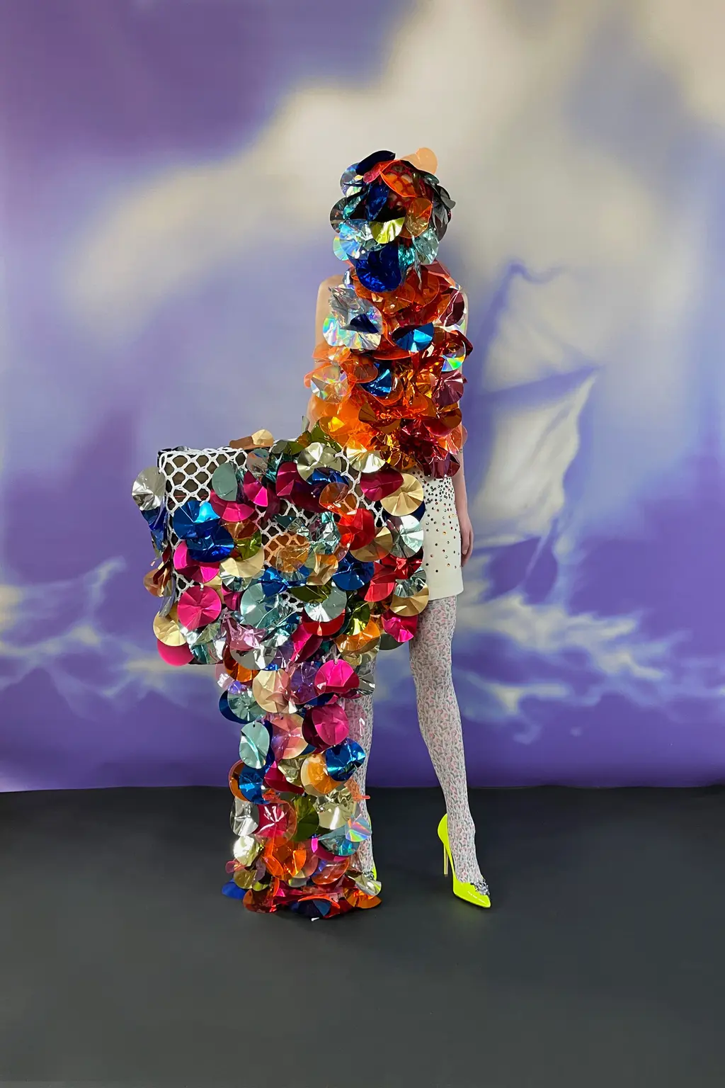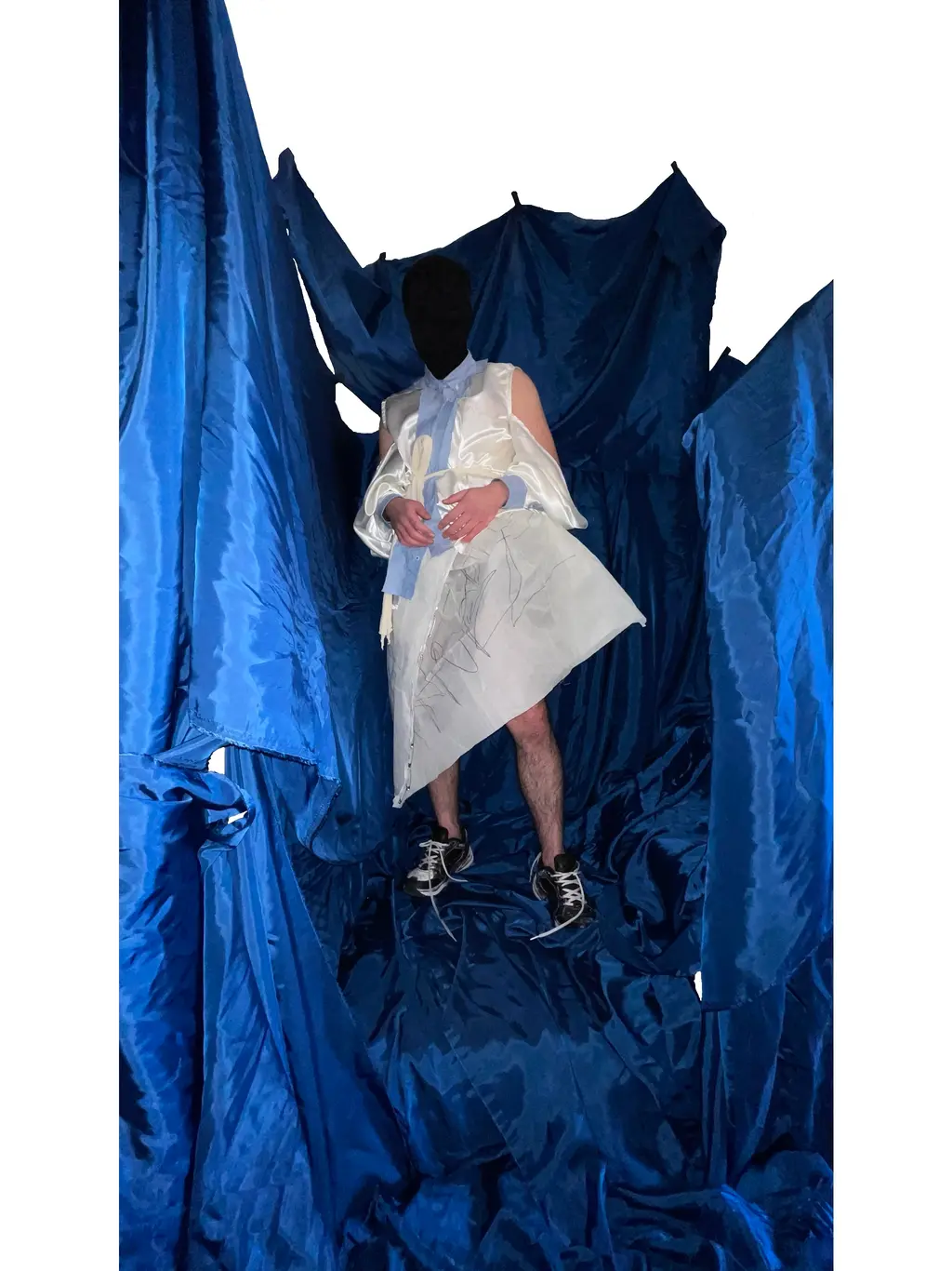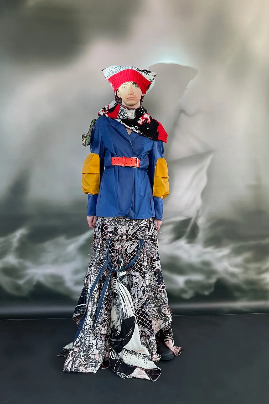 Compelled to work with what he had to hand, and moved by the negative impacts of wasteful fashion on the environment, Daniel took a“zero cost” approach to his graduate collection last year, creating strikingly sculptural garments from repurposed second-hand items, fabric offcuts and materials like wire and cardboard. And his AW21 collection is similarly thrifty.“All the fabric has been donated or deconstructed from my old clothes, or taken from old collections,” he explains ahead of its unveiling.