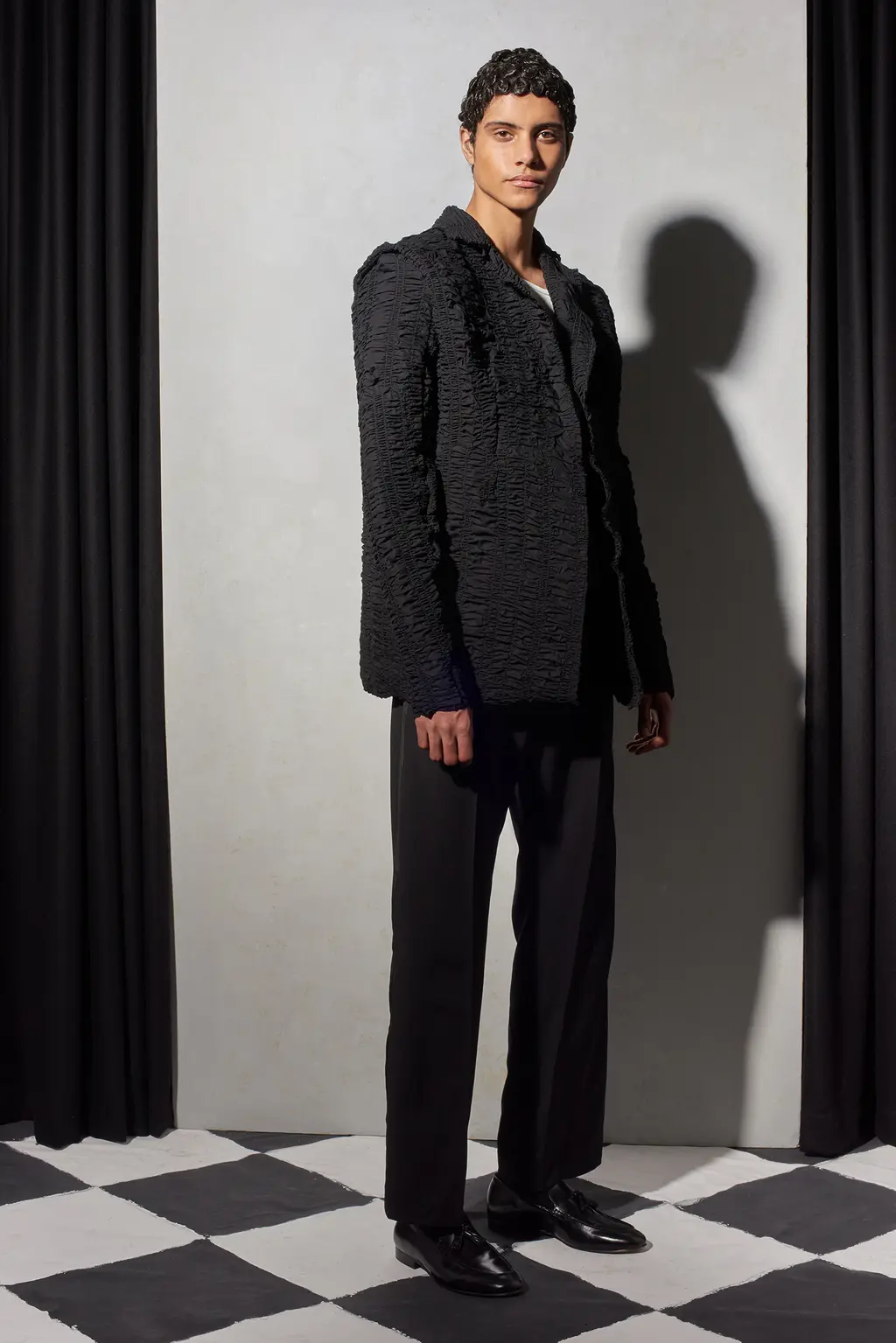 As with previous collections, Saunders’ eyes were set on perfecting the tailoring element – her past designs indulging in ruched shirting cinched to the body and wide-leg trousers supremely cut to allow for ease of movement. But this time, warped, pegged trousers hug the thighs and end some way from the feet. Ruching re-appears, but reimagined in an intricately detailed blazer where the fabric technique isn’t a small detail, but rather the main event, creating waves in the jacket lines when placed on the body. A black mac coat defies gravity, static as though caught mid-air, and a shirt, or is it a jumper?, is layered on top of one another – as the collection title aptly suggests. TJS