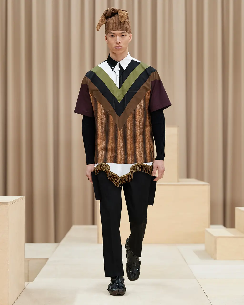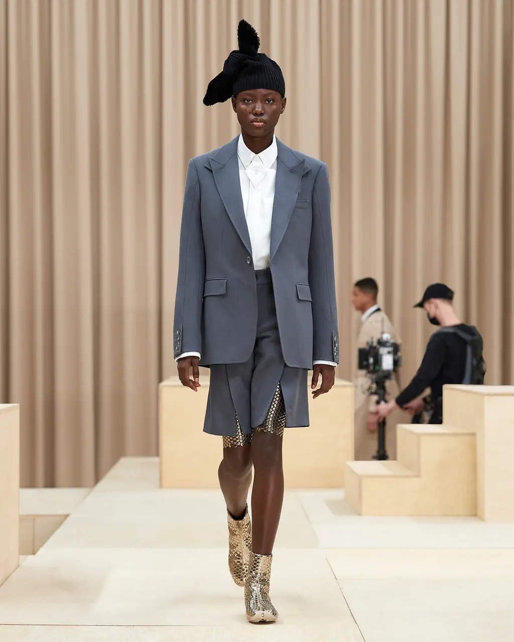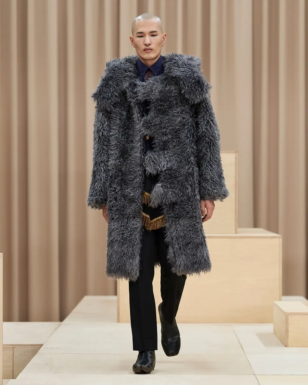 AW21 references the British craftsmanship and outdoor movements of the early 20th century, when Burberry were producing trench coats and macs for military personnel and, later, World War One. Tisci specifically hones in on those who escaped to unknown lands in various parts of the United Kingdom: “They formed communities with a deep respect for nature and the outdoors and looked forward to a future full of possibility,” he writes in the accompanying press notes. Along with them, the Burberry animal kingdom – a signature sartorial code shown through deer silhouettes on knitted beanies, boots and sneakers sculpted to resemble hooves, and a tonal, rich colour palette including beige, dark brown, oxblood, and shirts in pale blue and pink.