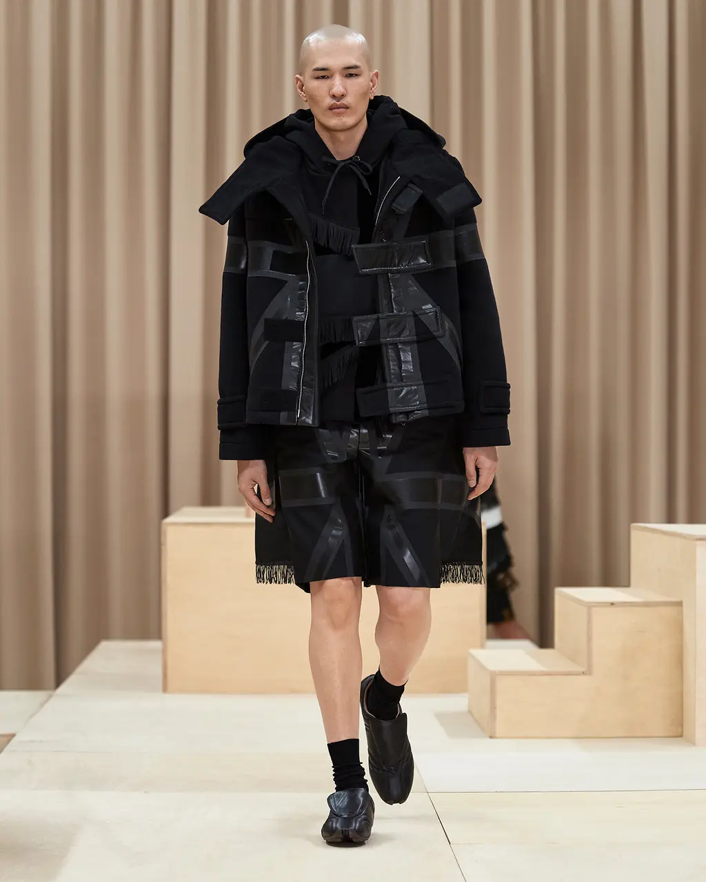 The focus throughout, unsurprisingly, is outerwear, with Tisci subtly reimagining traditional coats, trousers and jumpers with pleats, panels and fringes, as though moving in the wind. The trench coat becomes a regal statement of the collection, with a sharp V cut out of its front, its belt sturdily tightened across the waist and buttons lining either side. And with yet another nod to big outdoor adventures, models walk with backpacks slung over their arms.