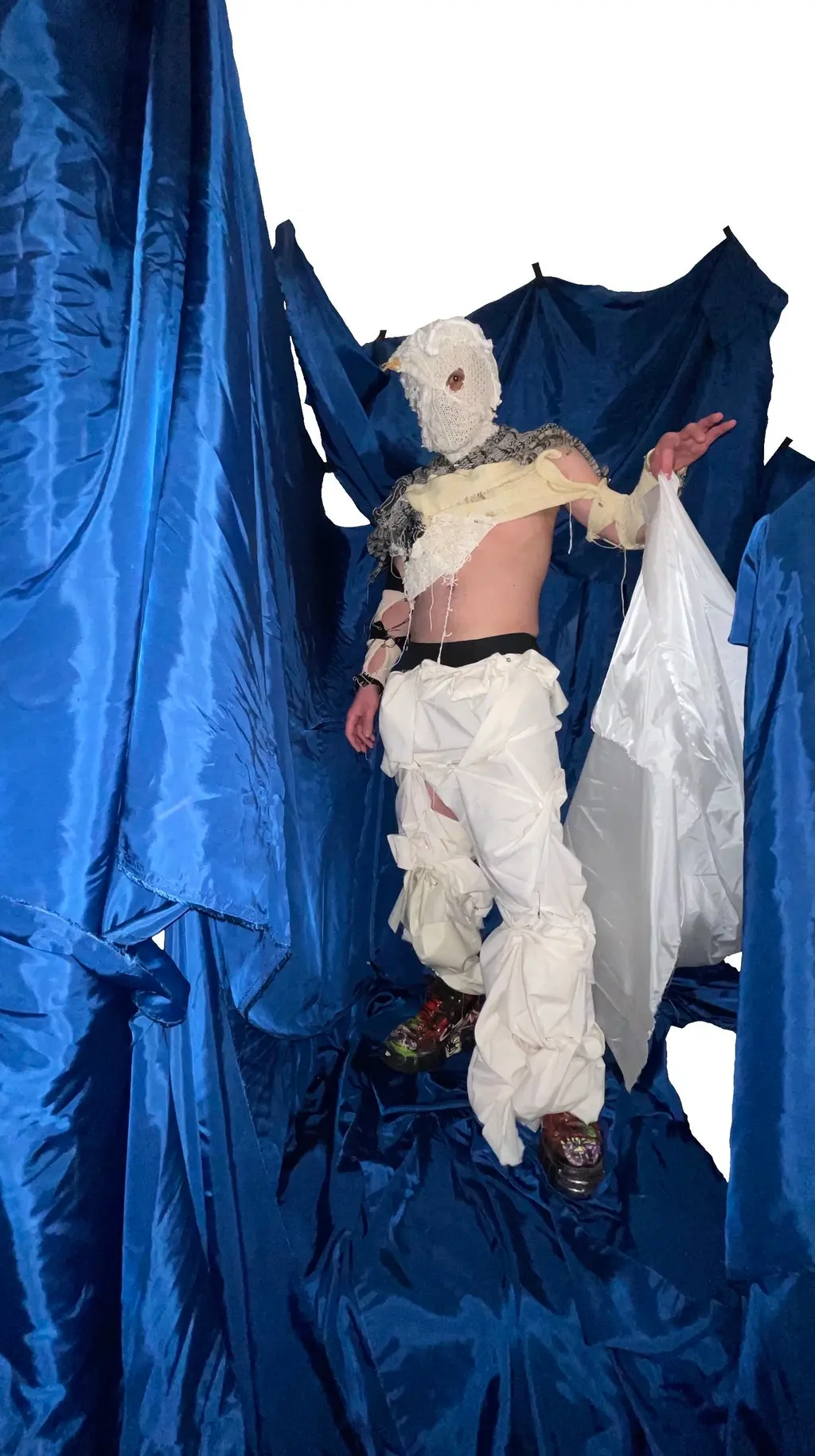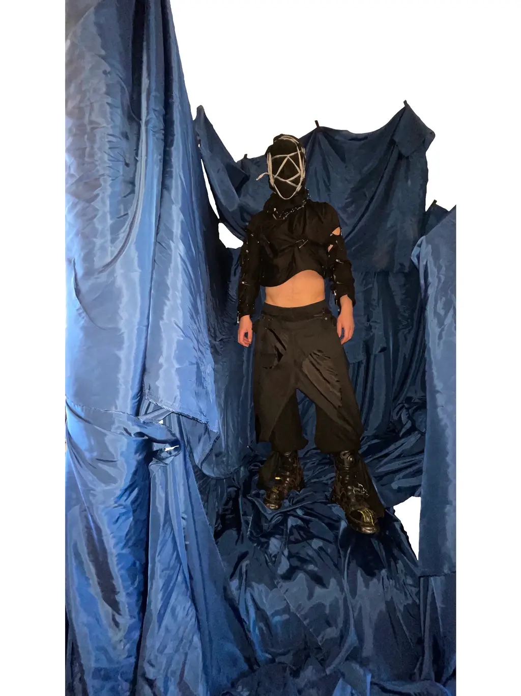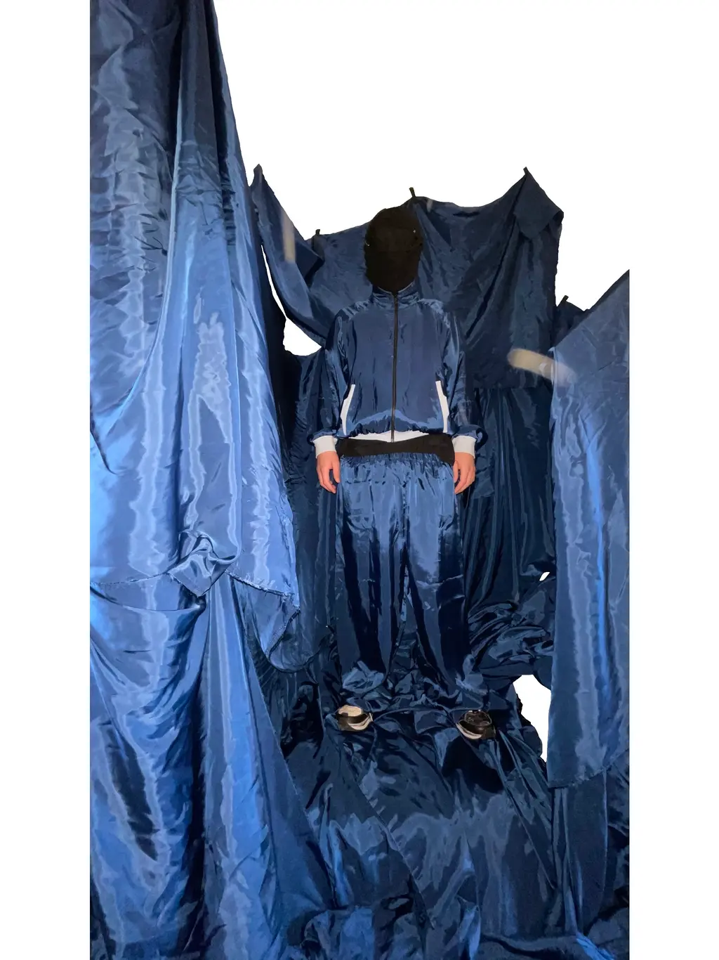 The result is what Daniel deems a“very personal” unisex collection, ranging from a voluminous satin tracksuit, a punk take on a tailored suit, and an artfully draped asymmetric shirt and linen trouser combo – and multiple face coverings.“I used them before the pandemic,” he expands.“I like to stay a bit elusive, to let the work be the focus”.