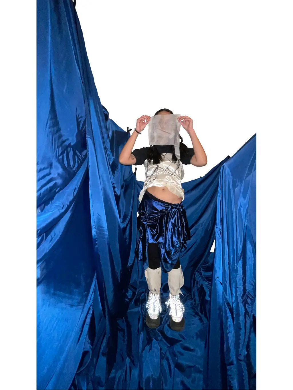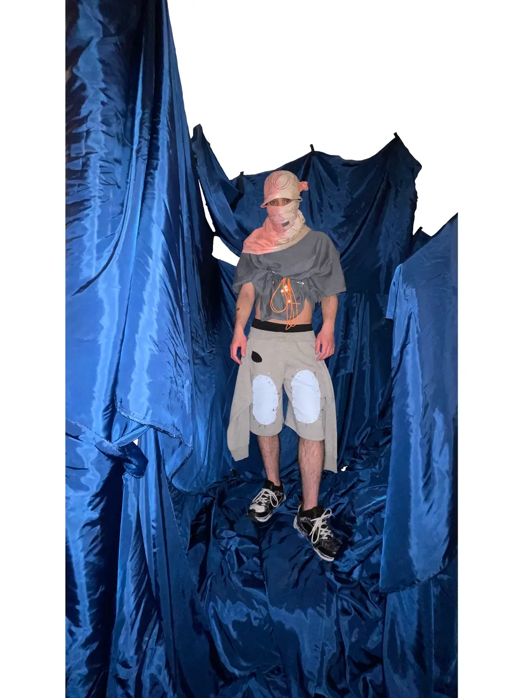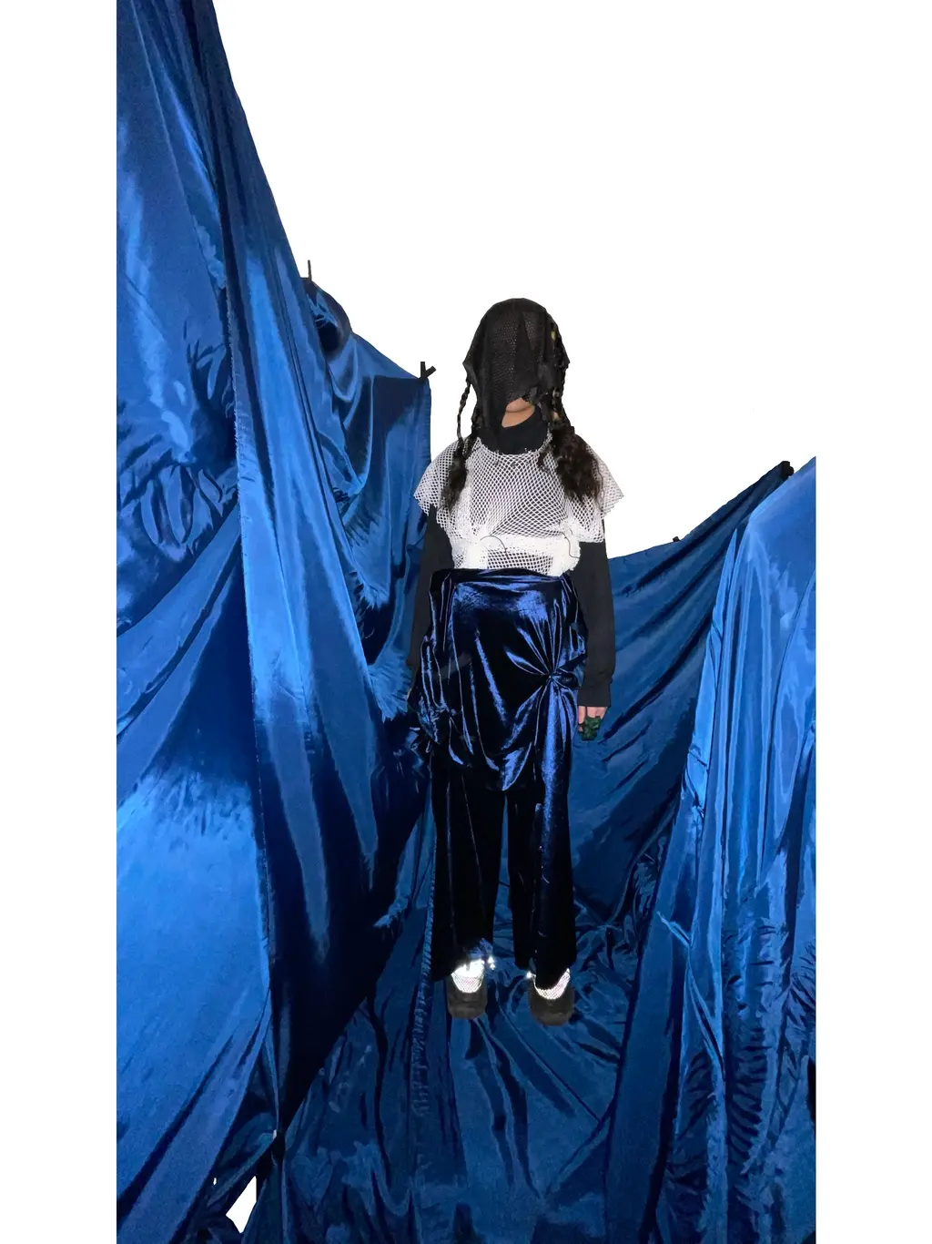 The result is what Daniel deems a“very personal” unisex collection, ranging from a voluminous satin tracksuit, a punk take on a tailored suit, and an artfully draped asymmetric shirt and linen trouser combo – and multiple face coverings.“I used them before the pandemic,” he expands.“I like to stay a bit elusive, to let the work be the focus”.