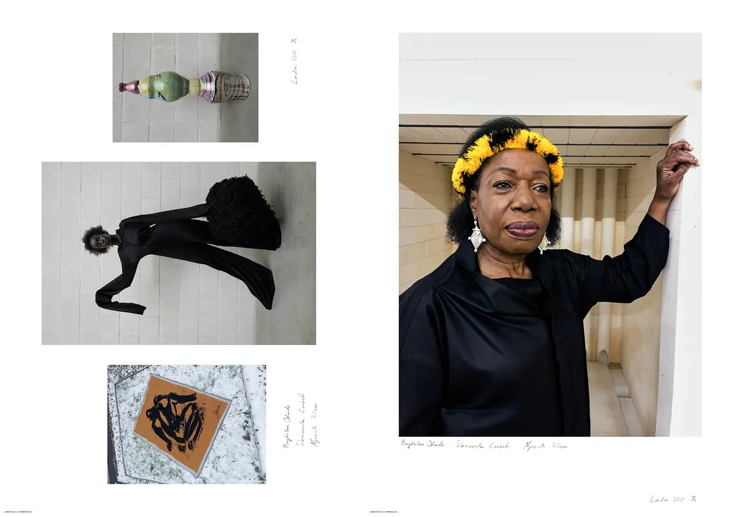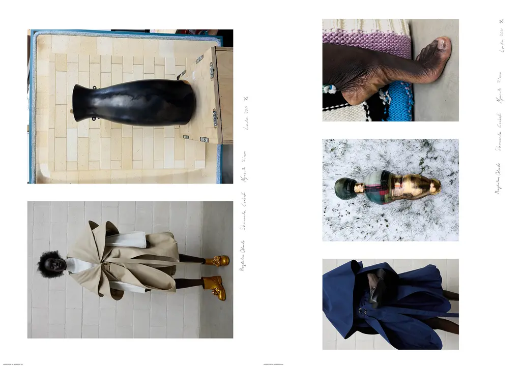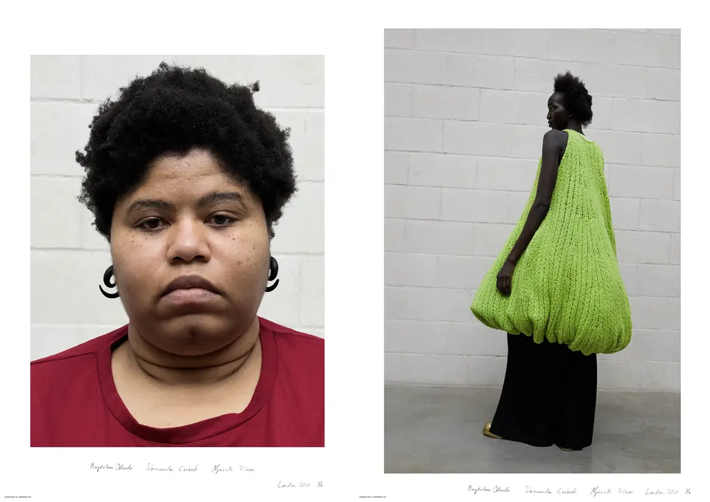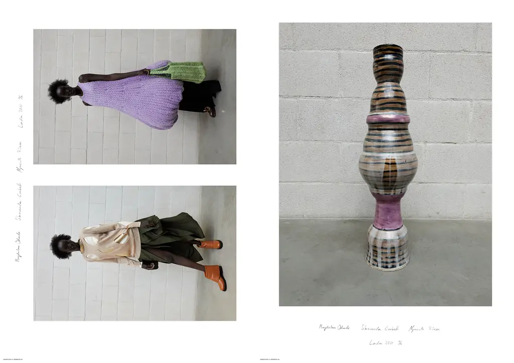 Jonathan Anderson, creative director of JW Anderson, presented the brand’s AW21 womenswear collection by continuing a format established several seasons ago – his garments were printed onto 19 double-sided posters, along with an intimate video message from Anderson, distilling his design process this season. The collection also harks back to the brand’s initial DNA, merging art and fashion. This time they collaborated with artist and ceramicist Dame Magdalene Odundo – who Anderson met while curating the Disobedient Bodies major exhibition in 2017 for The Hepworth Wakefield – and American artist Shawanda Corbett, whose work Anderson first saw at the Corvi-Mora gallery in London last year, during which time lockdown restrictions had relaxed. For this collection, both artists have produced a series of six limited-edition blankets based on three of their works, each, to sit alongside pieces fixating on silhouette, pose and figurative lines. Shot by Juergen Teller (following his debut collaboration with Anderson for men’s last month) and modelled by the two artists, Anderson reinterprets his recurring theme of blown-up proportions, exploring increased volume on totemic structures like a layered smock dress in lime green, and baggy silk trousers hanging way over the feet. Knitwear becomes an armour-like cocoon, with a lavender dress taking on an extreme bulbous shape, circling the knees extending out from the body – emulating the voluptuous shapes of Odundo’s ceramics. The body, then, is celebrated as a vessel for experimentation. TJS