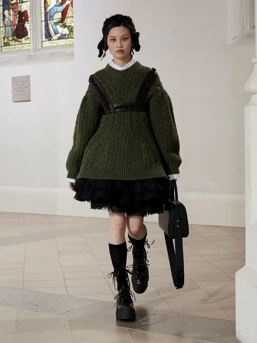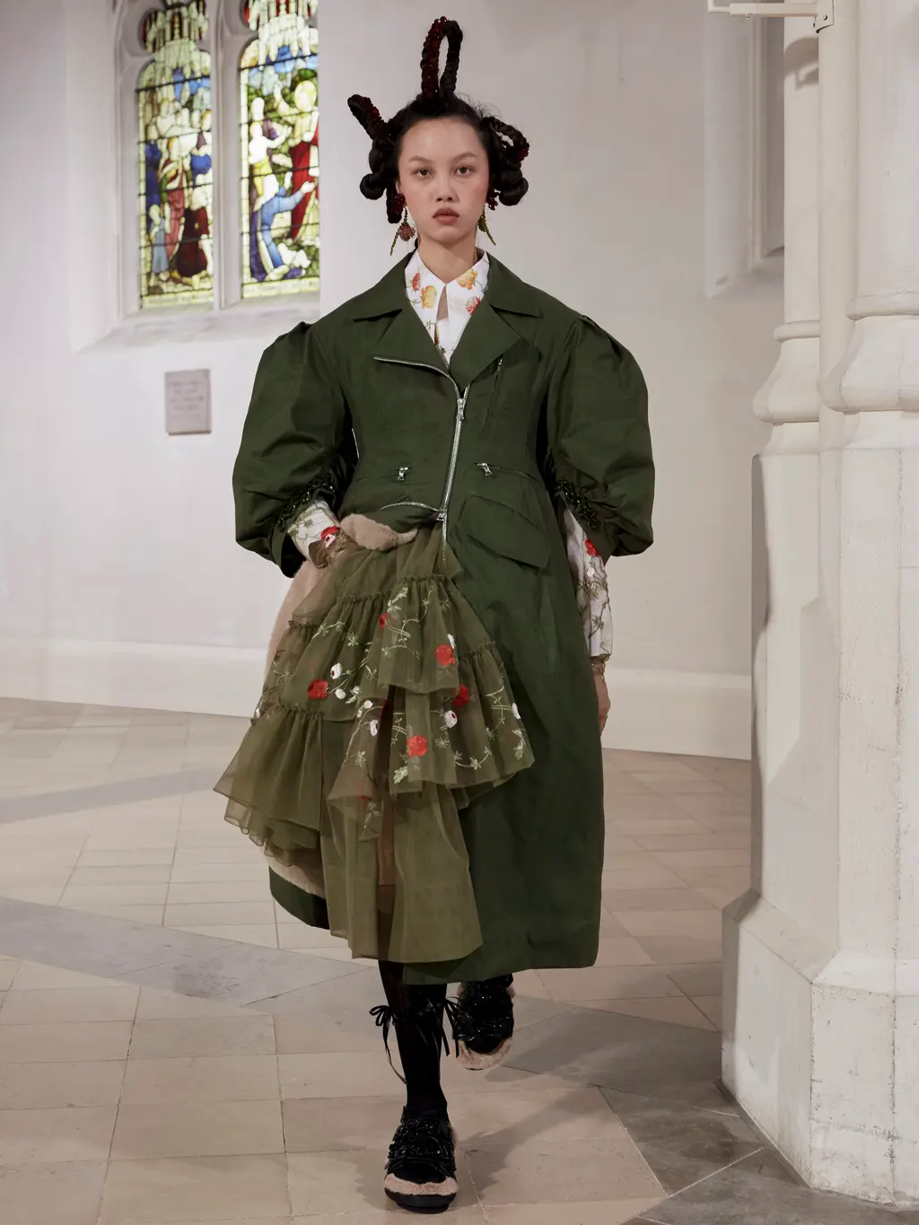 With a strong sense of identity, Rocha retreated to her signature cuts and silhouettes before expanding into new realms, introducing rounded, full shapes made from floral embroidered organza. Uniformity and naivety are reflected in equal measure, as floral patterns reigned supreme among severe biker jackets with cinched in waists, rich, earthy knits styled with tulle petticoats and skirts accessorised with patterned tights and black platforms.