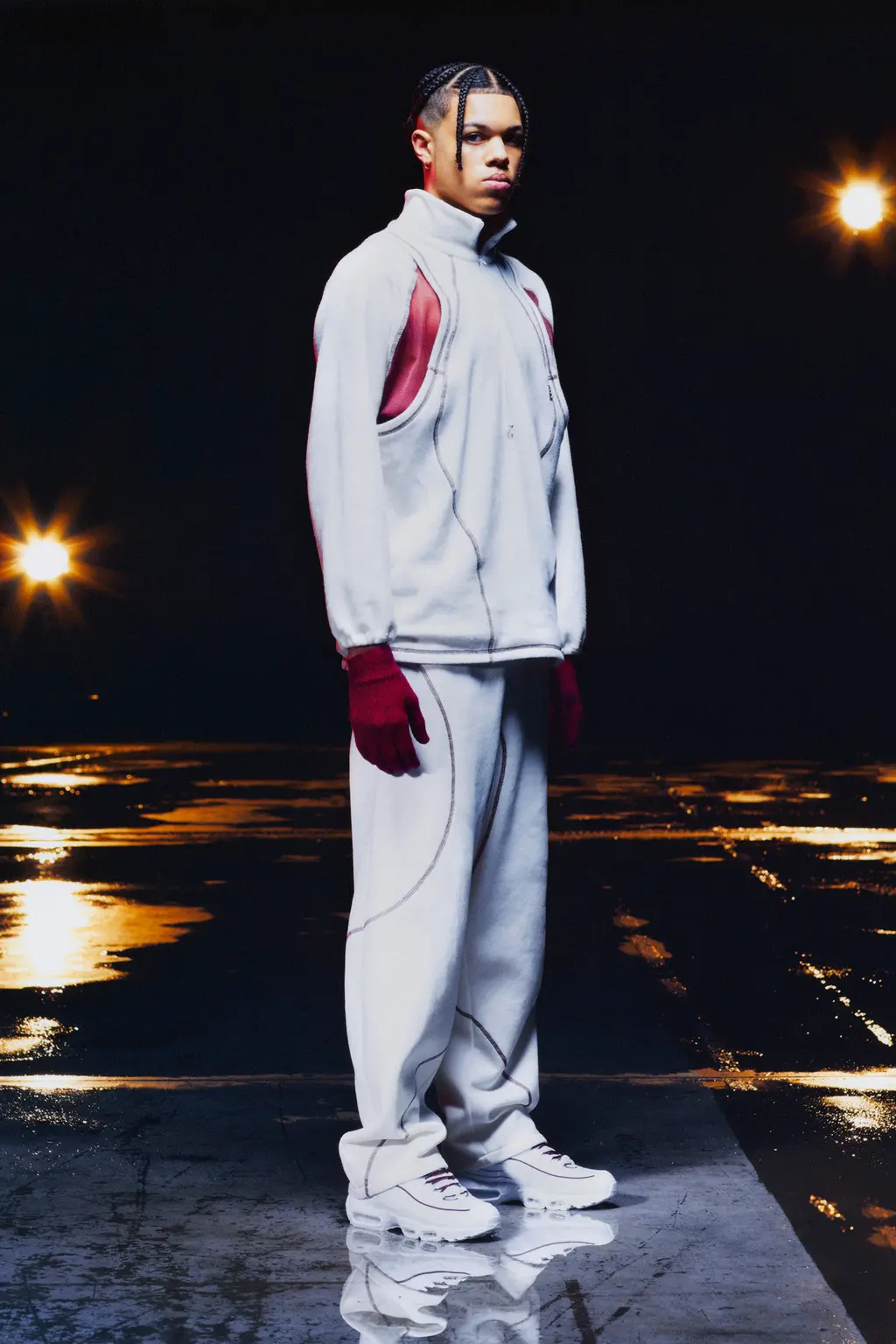 Nash often deals with the liberation of man through movement. This time last year, he opened the Fashion East show with his AW20 collection including show-stopping choreography and showcasing dancers who introduced his take on luxe sportswear, all steely grey, blue and black, zipped, unzipped and malleable. It was a big hit, with critics noting its combative take on masculinity through its confrontational moves and pulling on/taking off aspects of garments. TJS
