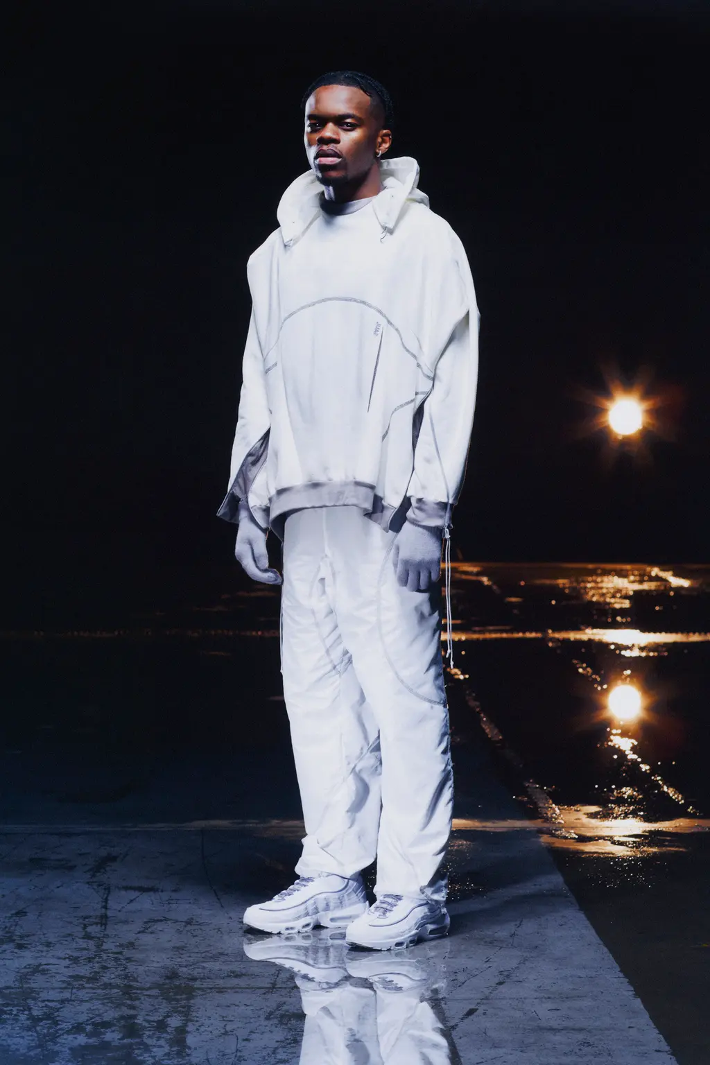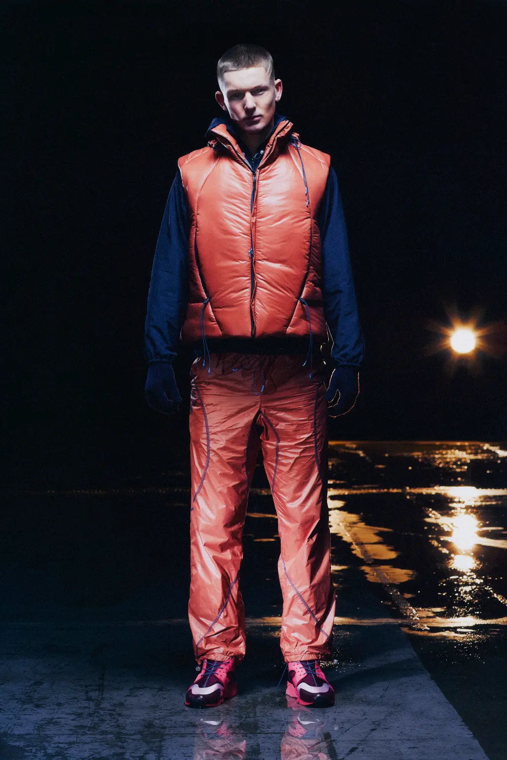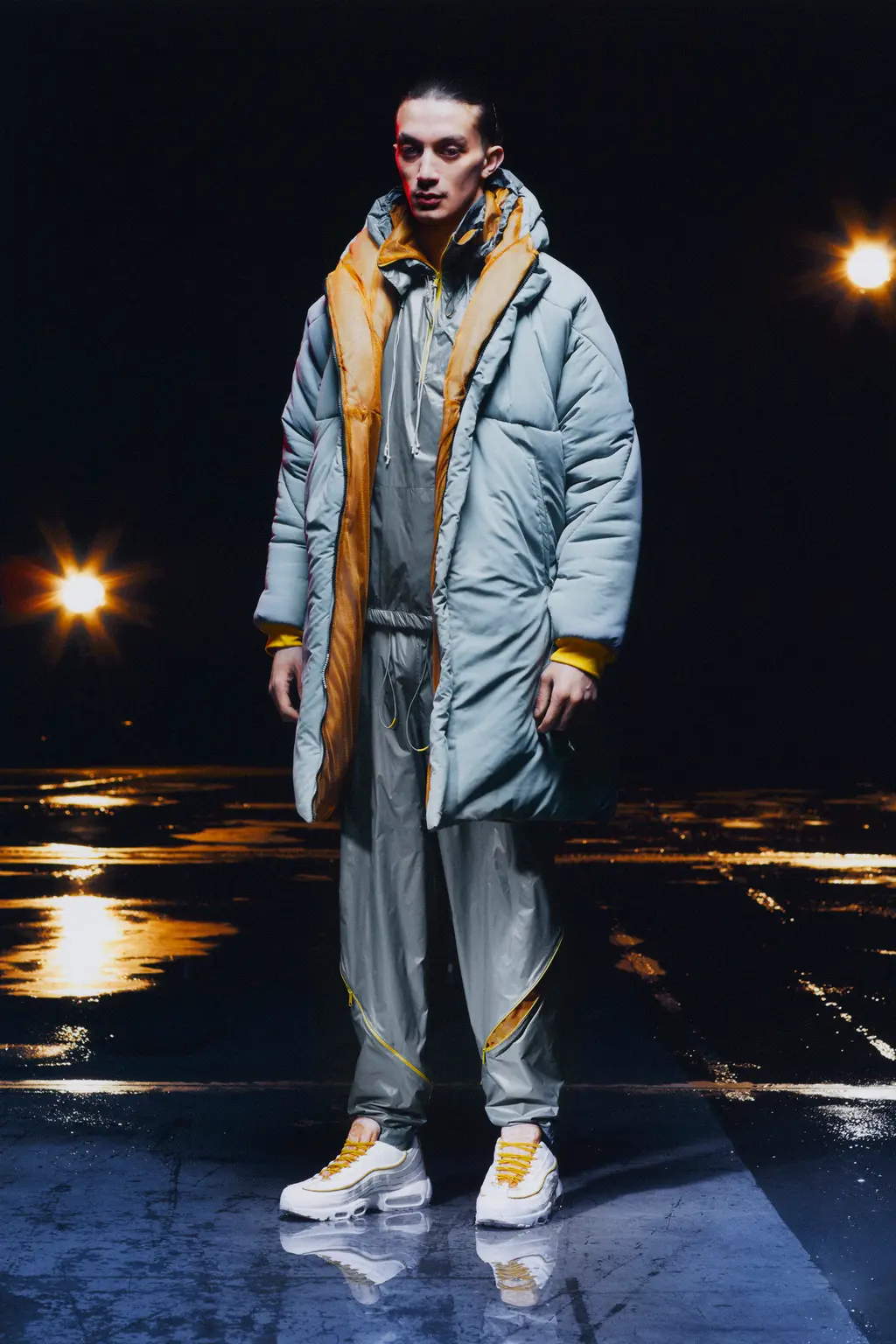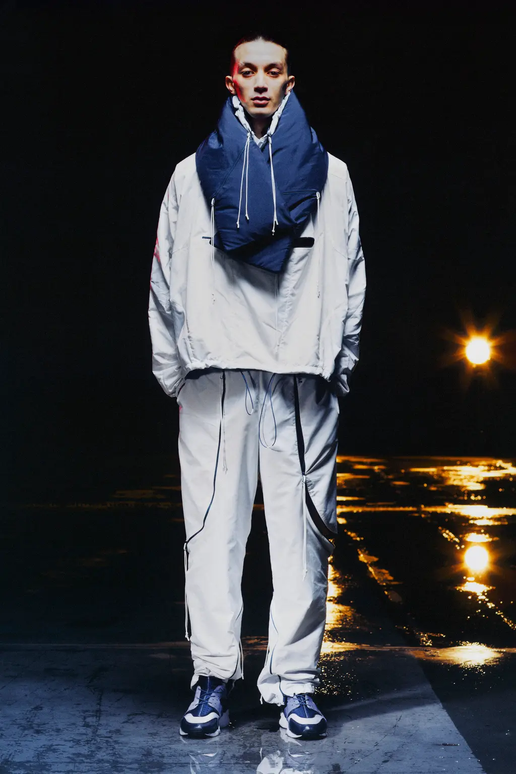 The designer weighs down his collection this season. Where before he worked“kinetically”, with an aim to provide air-like weightlessness to his garments, Nash has introduced organic cotton used on fleeces, softshells and even aspects of embroidery – the former being a nod to the need for comfort for his wearers in the midst of the pandemic, a cue many young designers are responding to this season. But the key element, one that is always the way for Nash, is functionality through interchangeability.