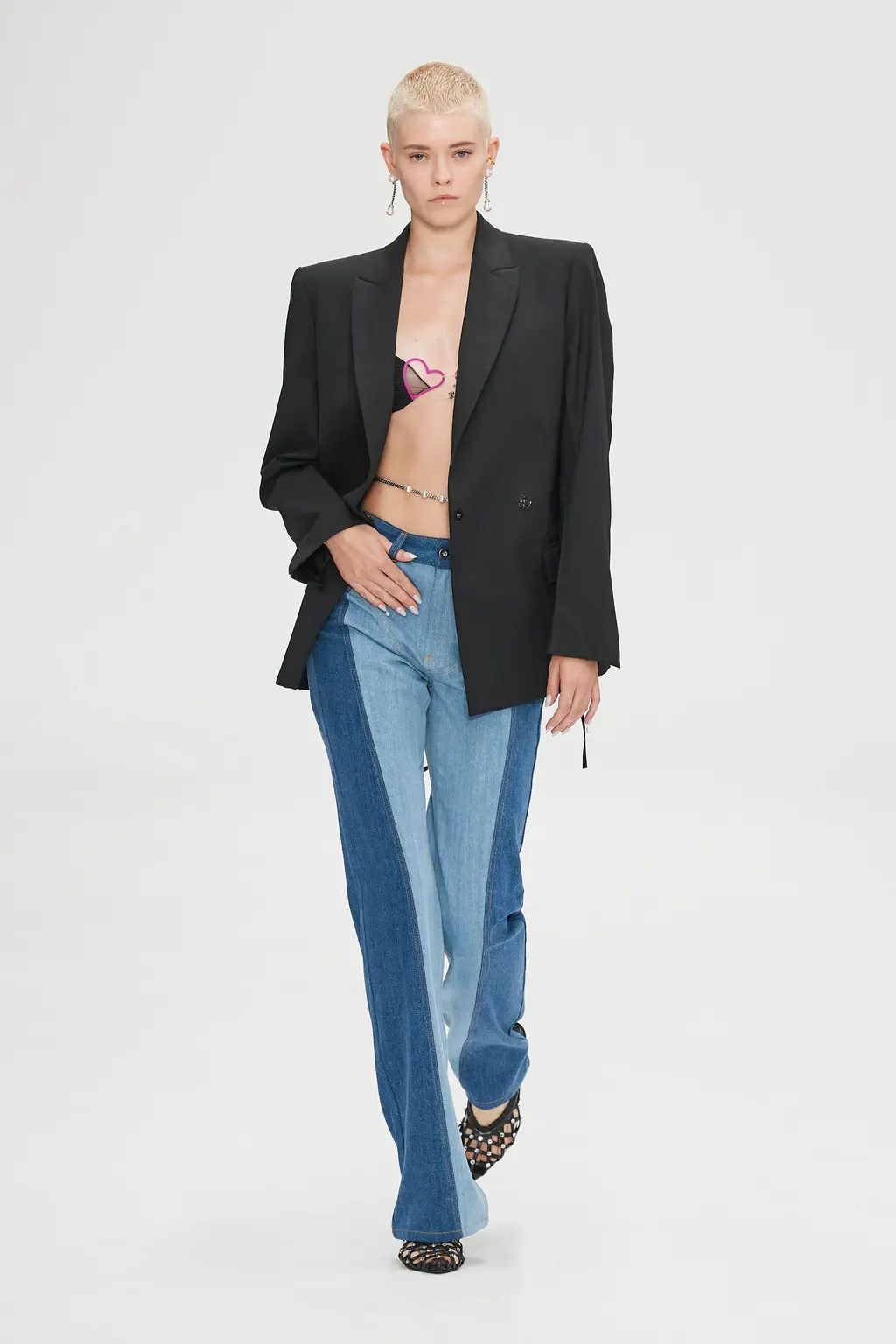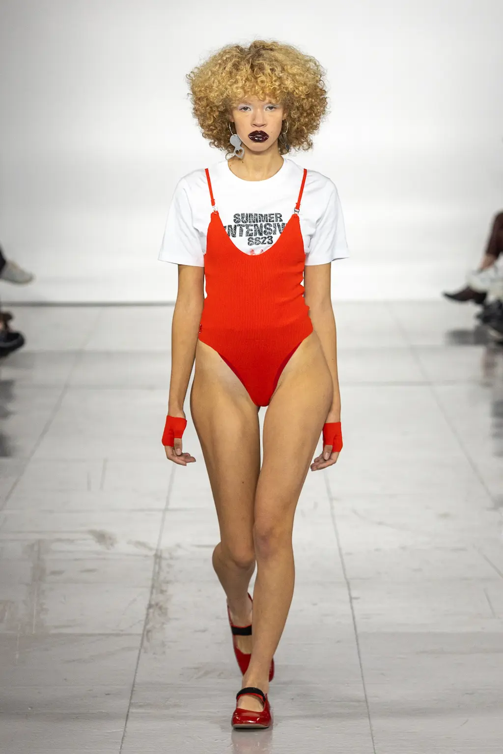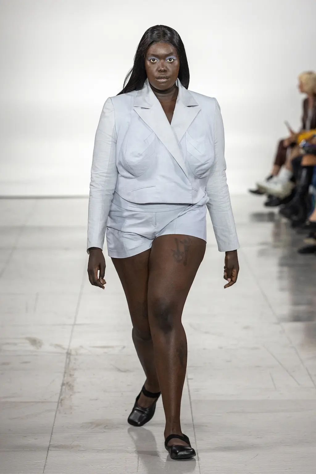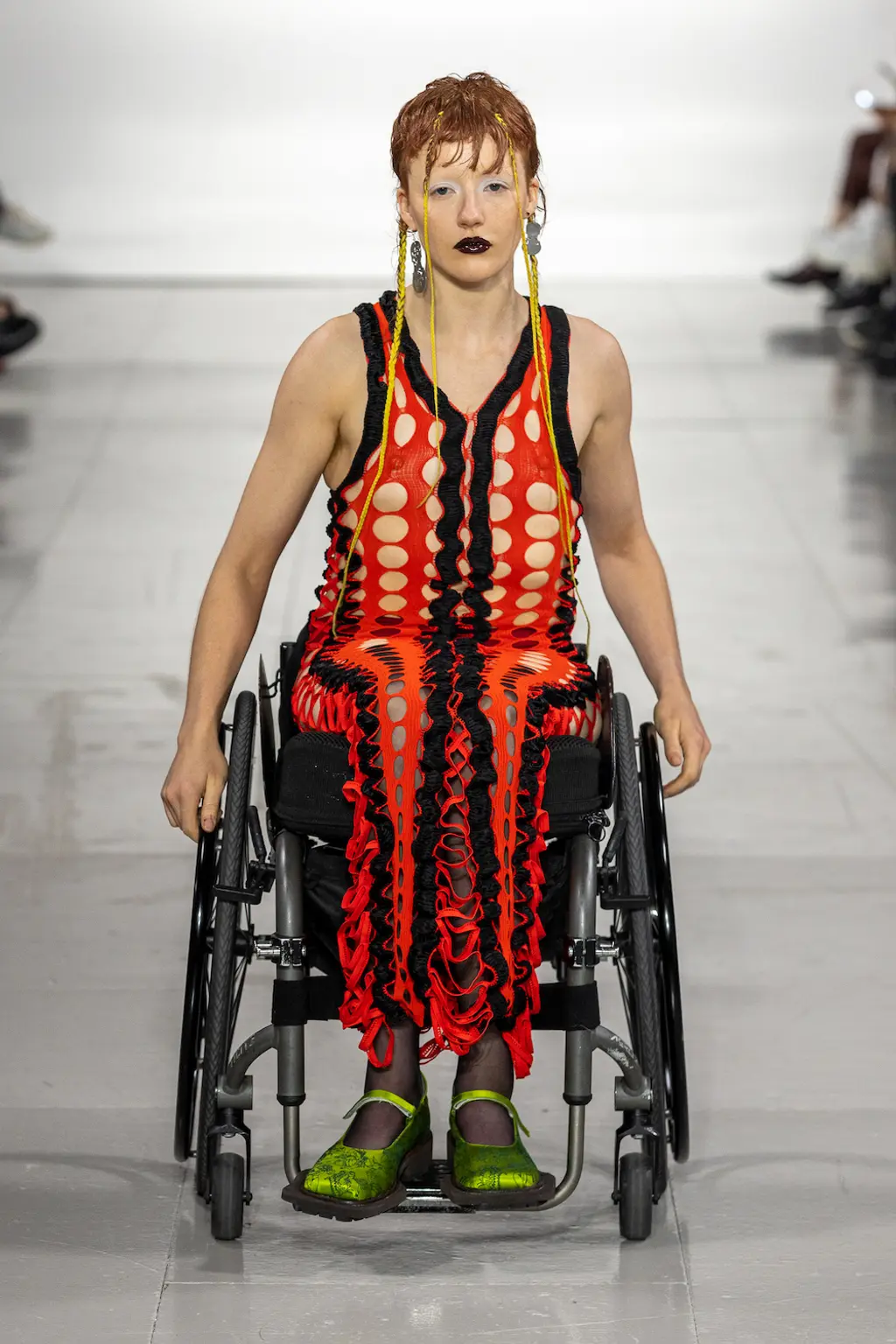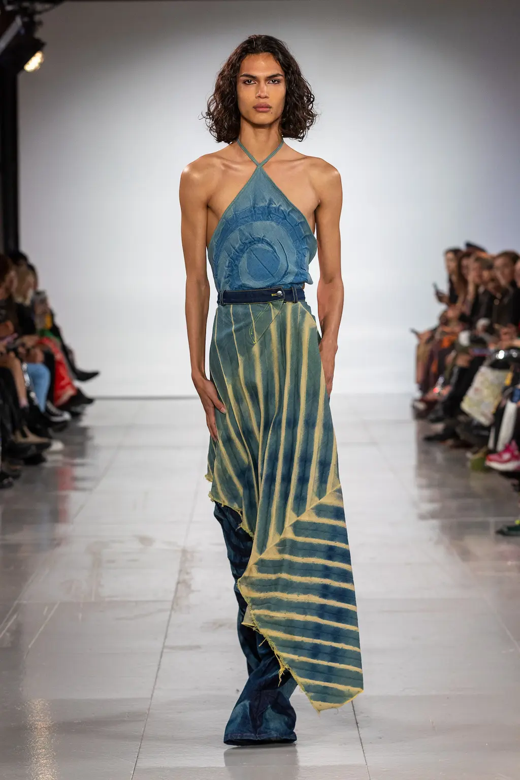 What Dublin-born designer Sinéad O’Dwyer does is radical: a runway collection inclusive of shapes, sizes and disabilities. But with the aid of designers like her, one day it’ll be considered the norm – and that is surely the end goal here. As part of her first season as a British Fashion Council Newgen recipient, O’Dwyer’s collection looked to school summers she spent at music practice camps in rural Ireland (her mum would often play Elgar’s cello concerto); the formality of classical concerts came out in the first few looks with tailored black tuxedo jackets, white poplin shirts and accessorised with bow ties. But the “teenage recklessness” she references in her show notes were punctured in around the midpoint of the show, where the high-voltage nylon swimsuits, ’90s rave-style trousers and electric blue criss-cross detailing felt wickedly rebellious. TJ