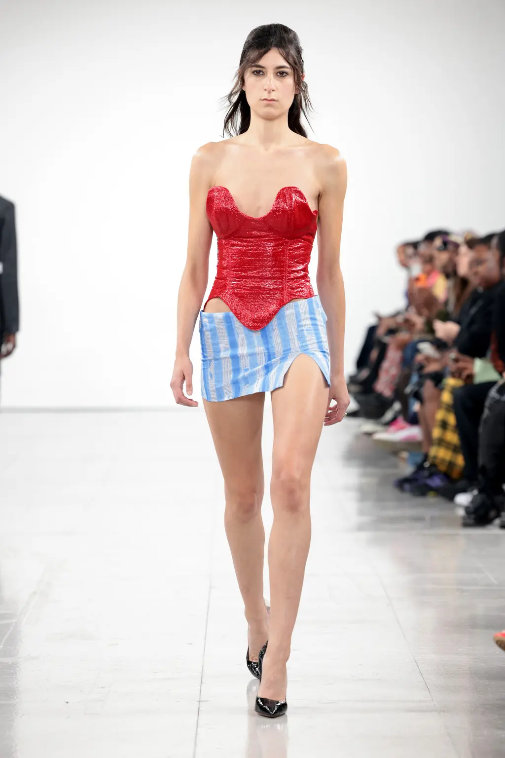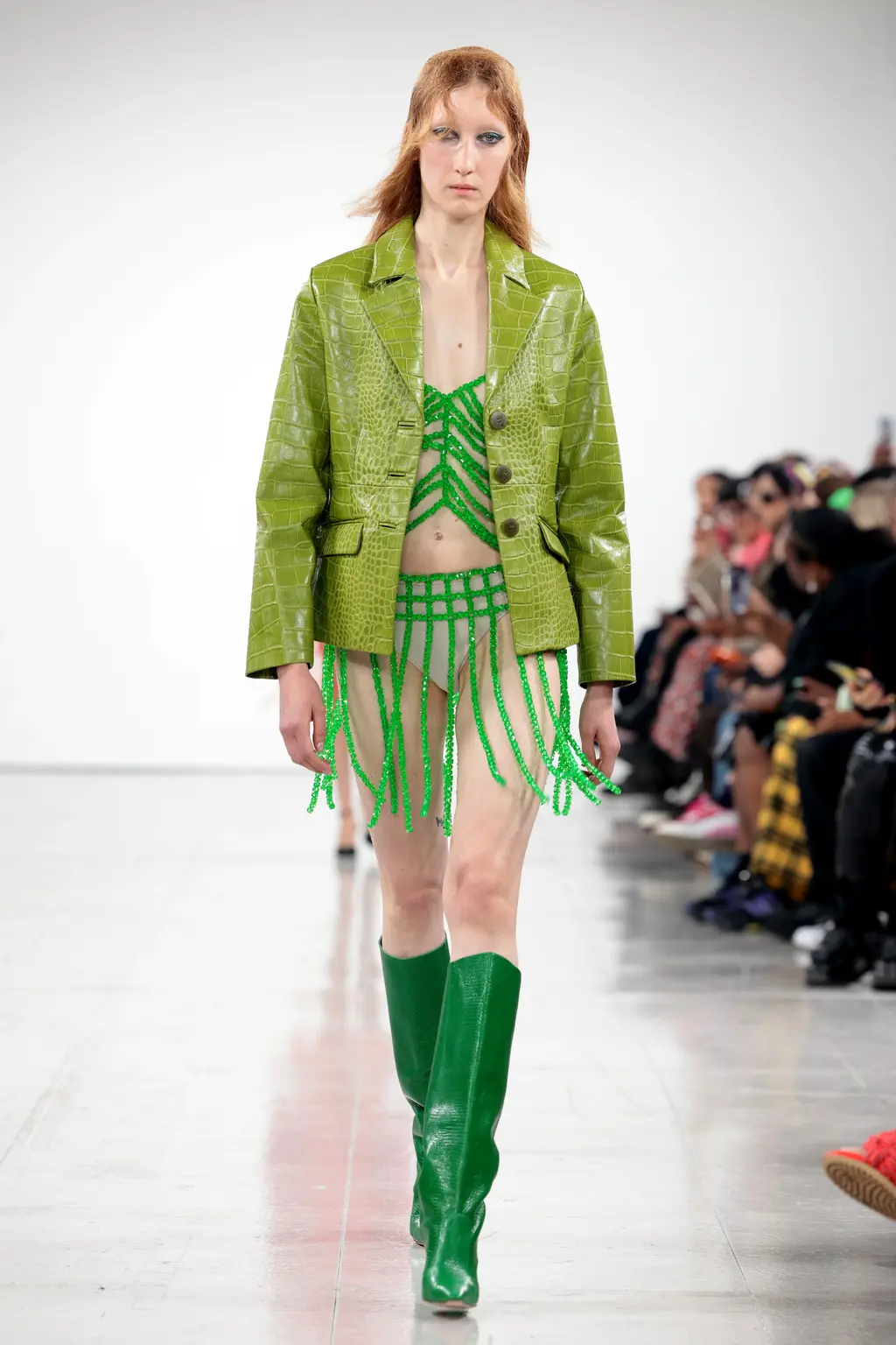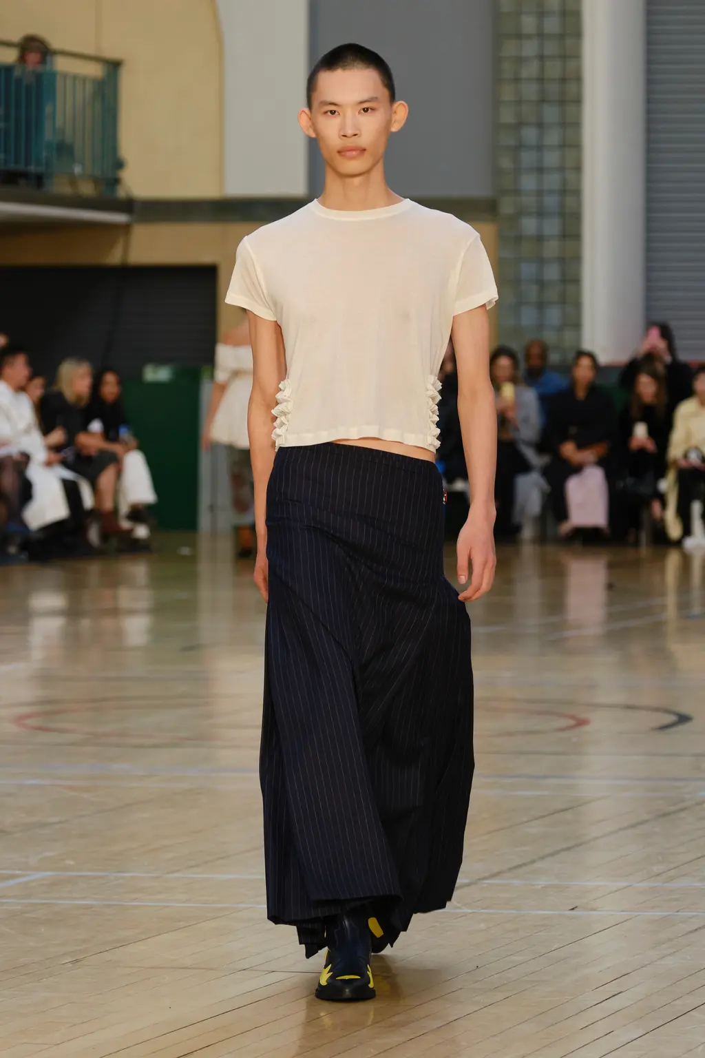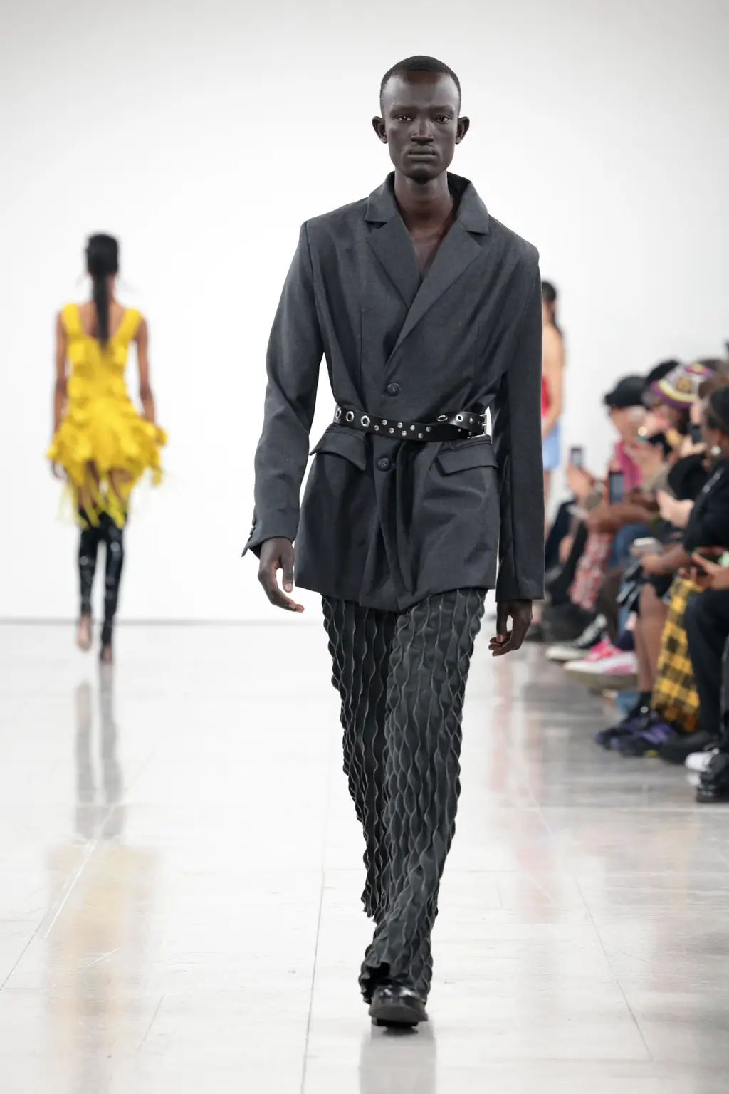 What Dublin-born designer Sinéad O’Dwyer does is radical: a runway collection inclusive of shapes, sizes and disabilities. But with the aid of designers like her, one day it’ll be considered the norm – and that is surely the end goal here. As part of her first season as a British Fashion Council Newgen recipient, O’Dwyer’s collection looked to school summers she spent at music practice camps in rural Ireland (her mum would often play Elgar’s cello concerto); the formality of classical concerts came out in the first few looks with tailored black tuxedo jackets, white poplin shirts and accessorised with bow ties. But the “teenage recklessness” she references in her show notes were punctured in around the midpoint of the show, where the high-voltage nylon swimsuits, ’90s rave-style trousers and electric blue criss-cross detailing felt wickedly rebellious. TJ