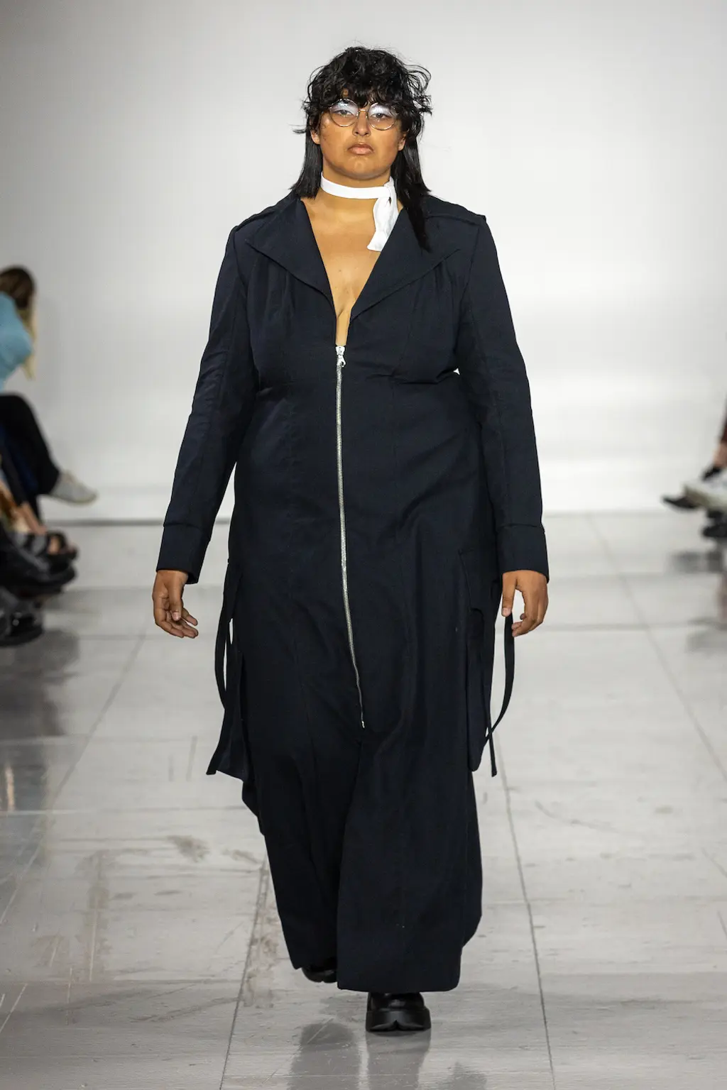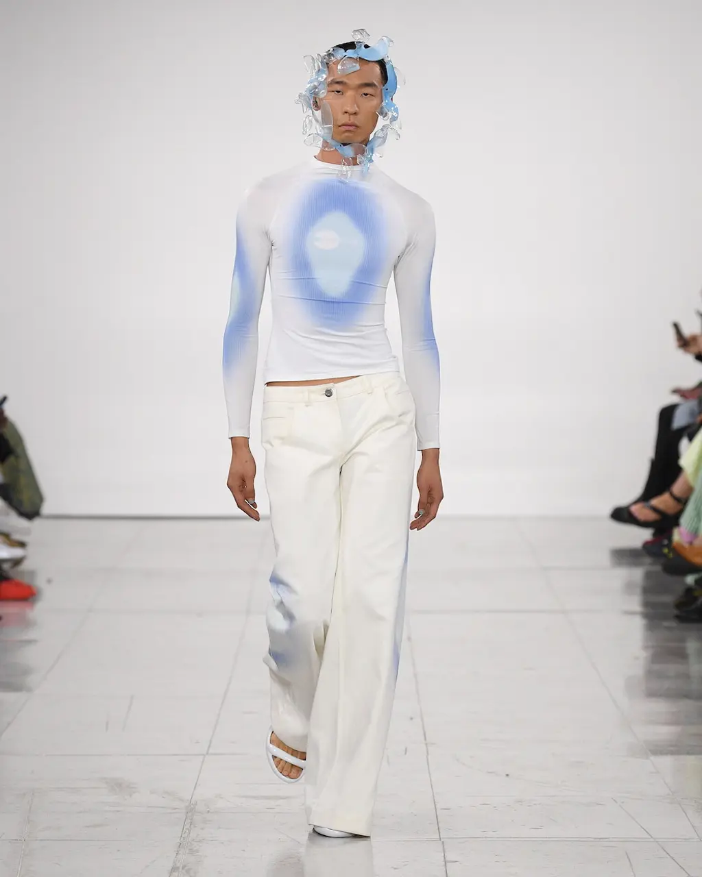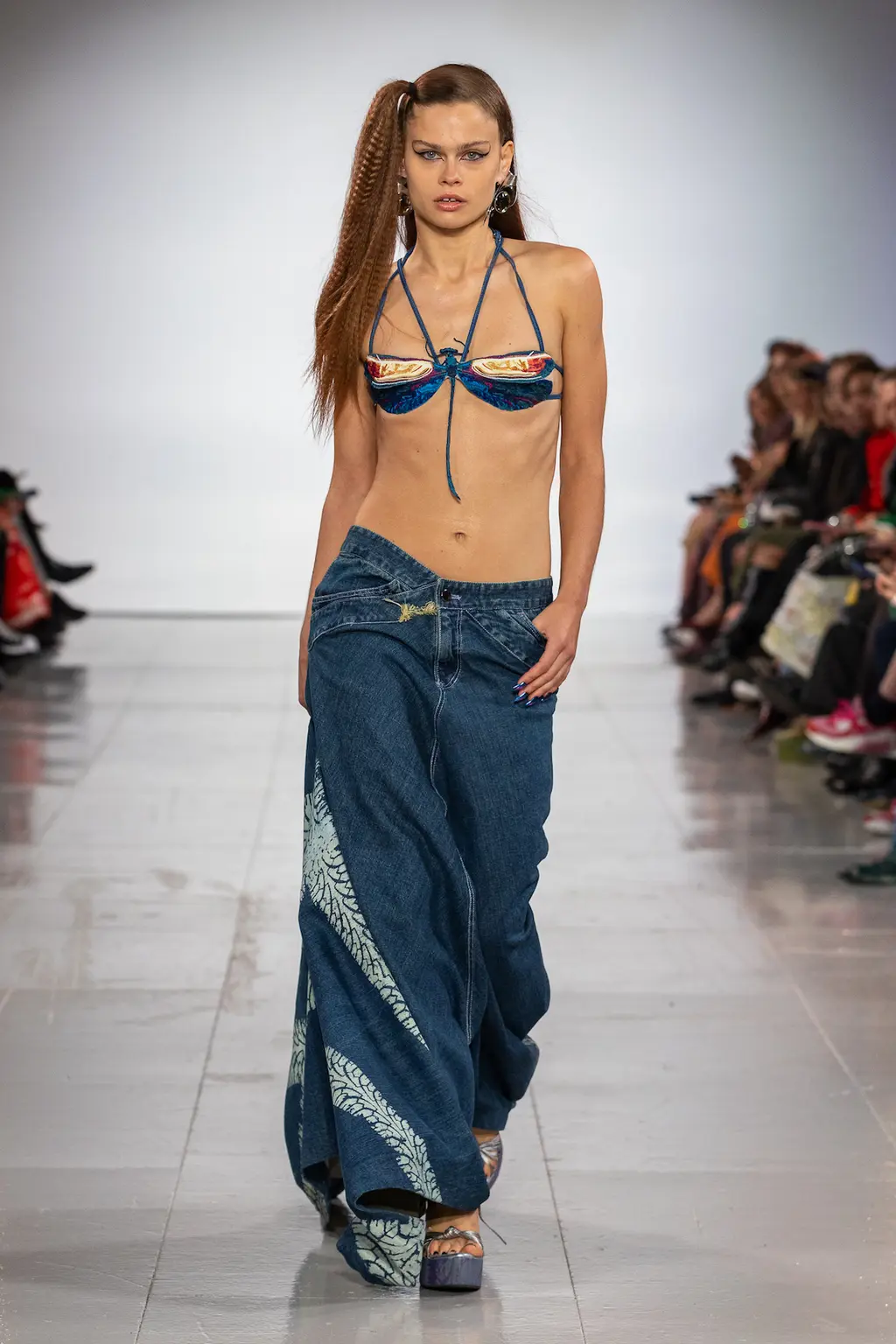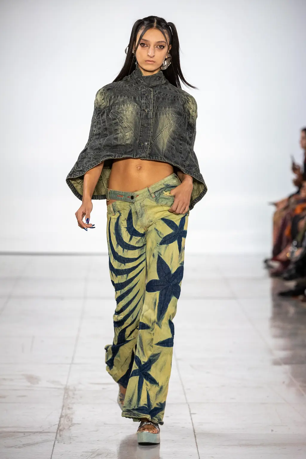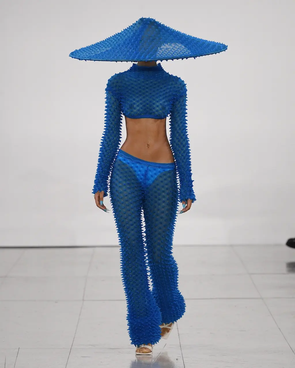 What Dublin-born designer Sinéad O’Dwyer does is radical: a runway collection inclusive of shapes, sizes and disabilities. But with the aid of designers like her, one day it’ll be considered the norm – and that is surely the end goal here. As part of her first season as a British Fashion Council Newgen recipient, O’Dwyer’s collection looked to school summers she spent at music practice camps in rural Ireland (her mum would often play Elgar’s cello concerto); the formality of classical concerts came out in the first few looks with tailored black tuxedo jackets, white poplin shirts and accessorised with bow ties. But the “teenage recklessness” she references in her show notes were punctured in around the midpoint of the show, where the high-voltage nylon swimsuits, ’90s rave-style trousers and electric blue criss-cross detailing felt wickedly rebellious. TJ