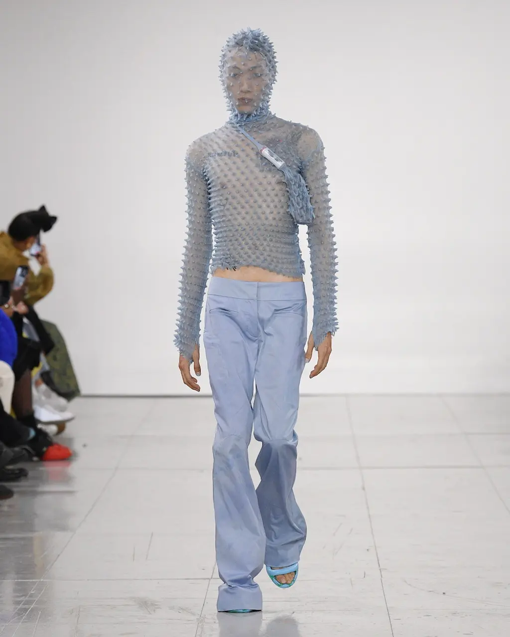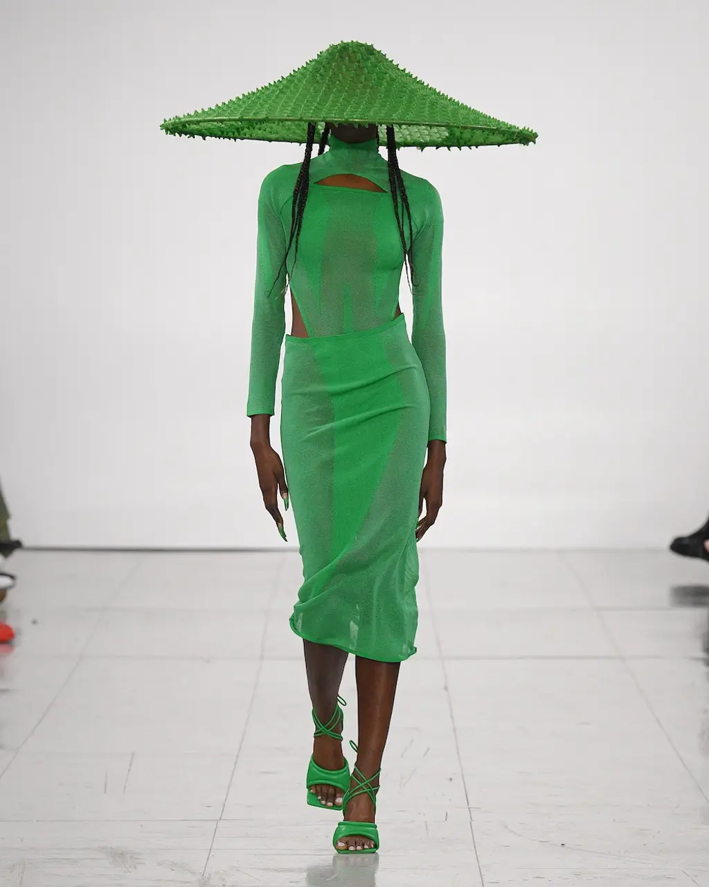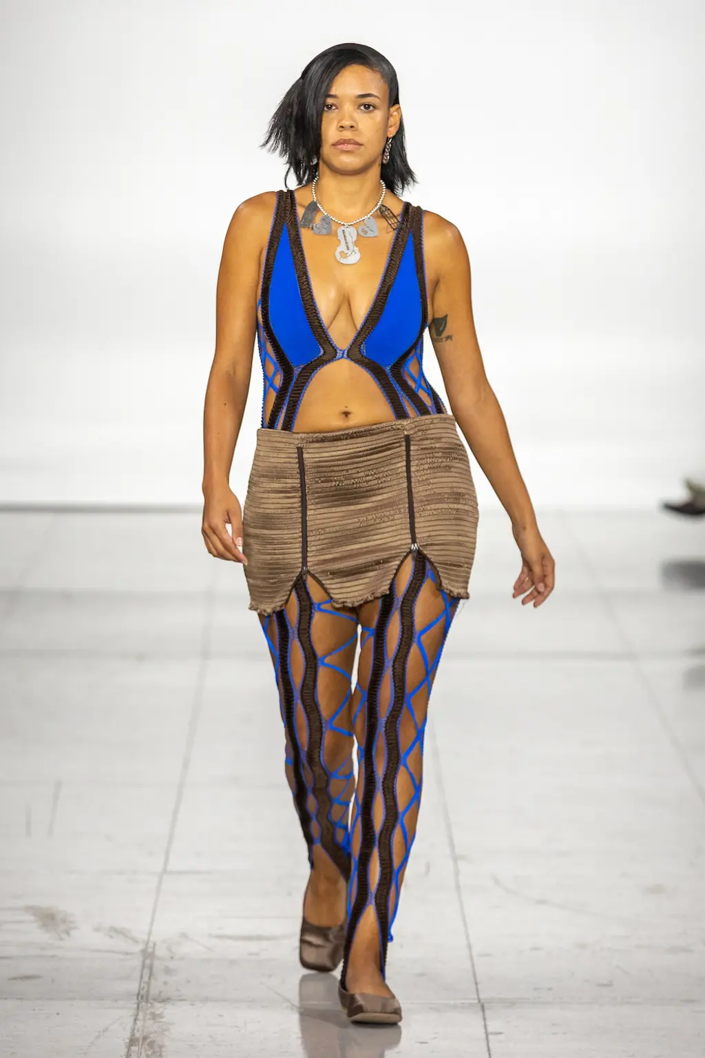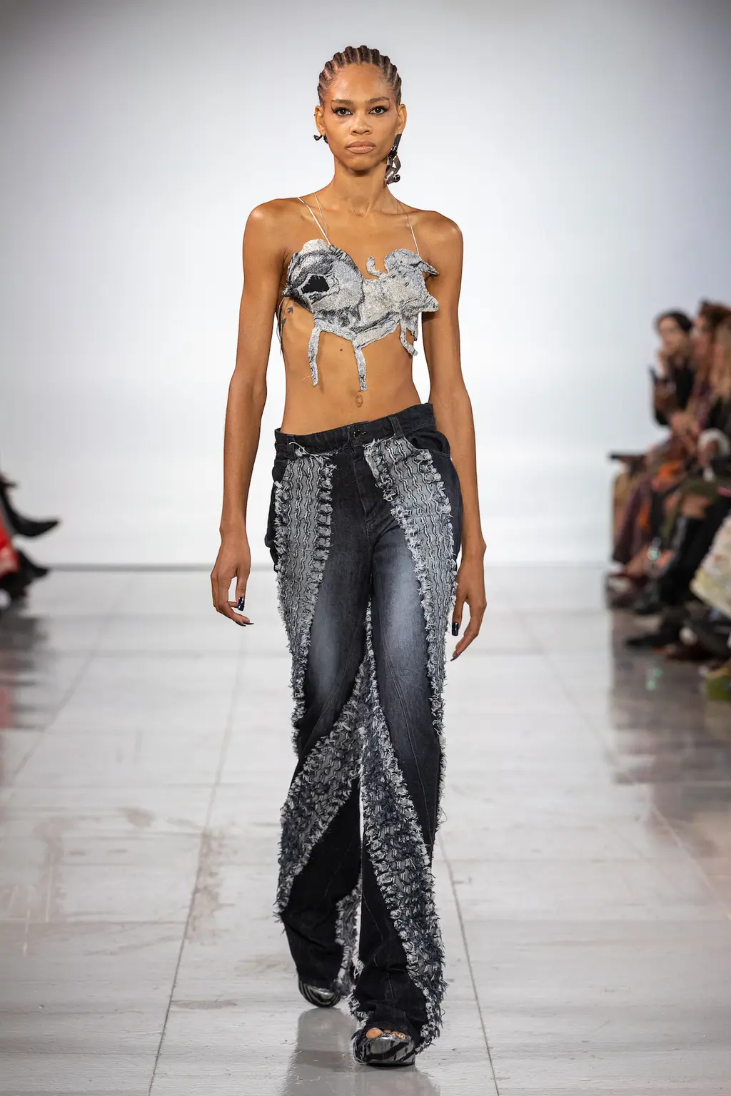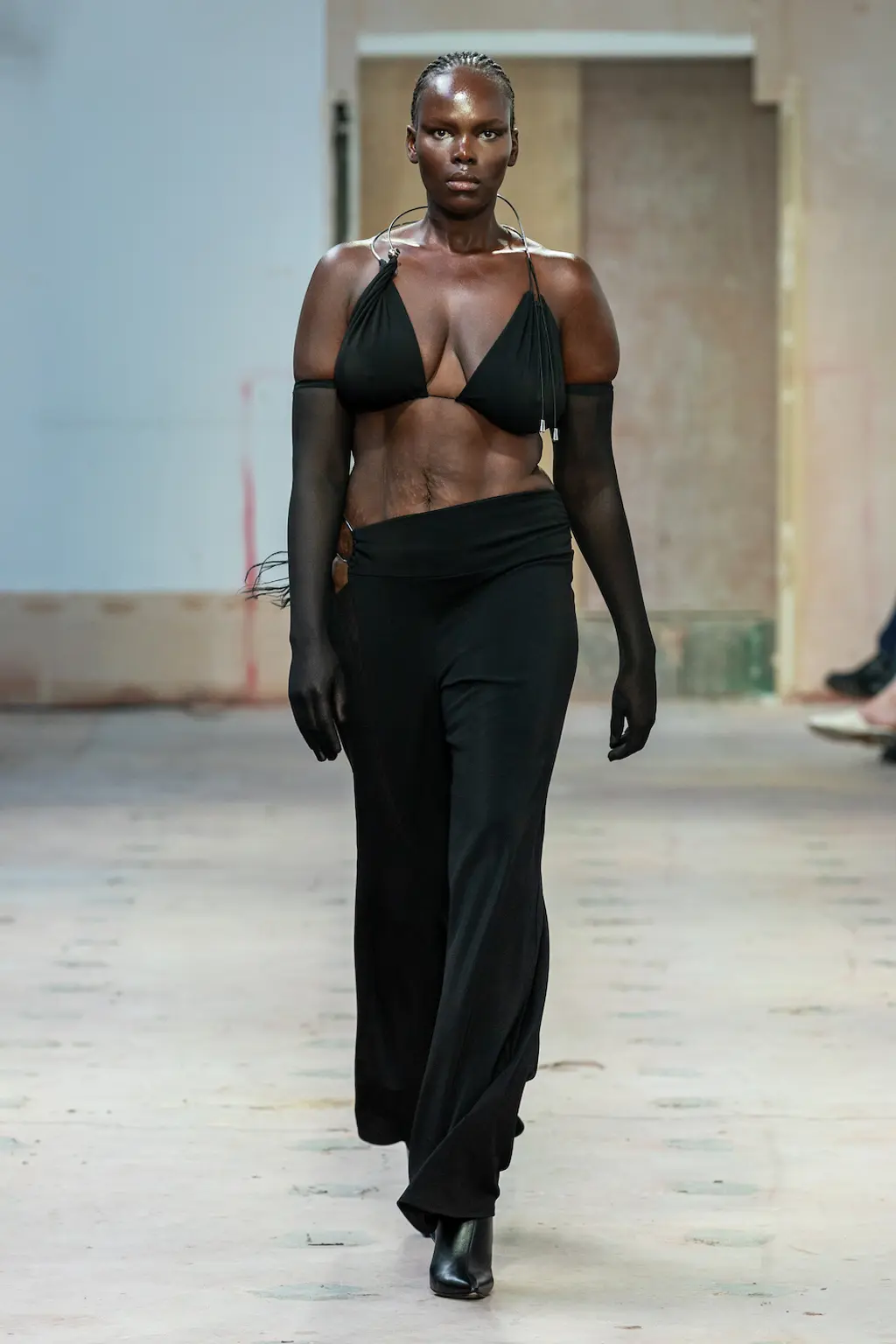 What Dublin-born designer Sinéad O’Dwyer does is radical: a runway collection inclusive of shapes, sizes and disabilities. But with the aid of designers like her, one day it’ll be considered the norm – and that is surely the end goal here. As part of her first season as a British Fashion Council Newgen recipient, O’Dwyer’s collection looked to school summers she spent at music practice camps in rural Ireland (her mum would often play Elgar’s cello concerto); the formality of classical concerts came out in the first few looks with tailored black tuxedo jackets, white poplin shirts and accessorised with bow ties. But the “teenage recklessness” she references in her show notes were punctured in around the midpoint of the show, where the high-voltage nylon swimsuits, ’90s rave-style trousers and electric blue criss-cross detailing felt wickedly rebellious. TJ