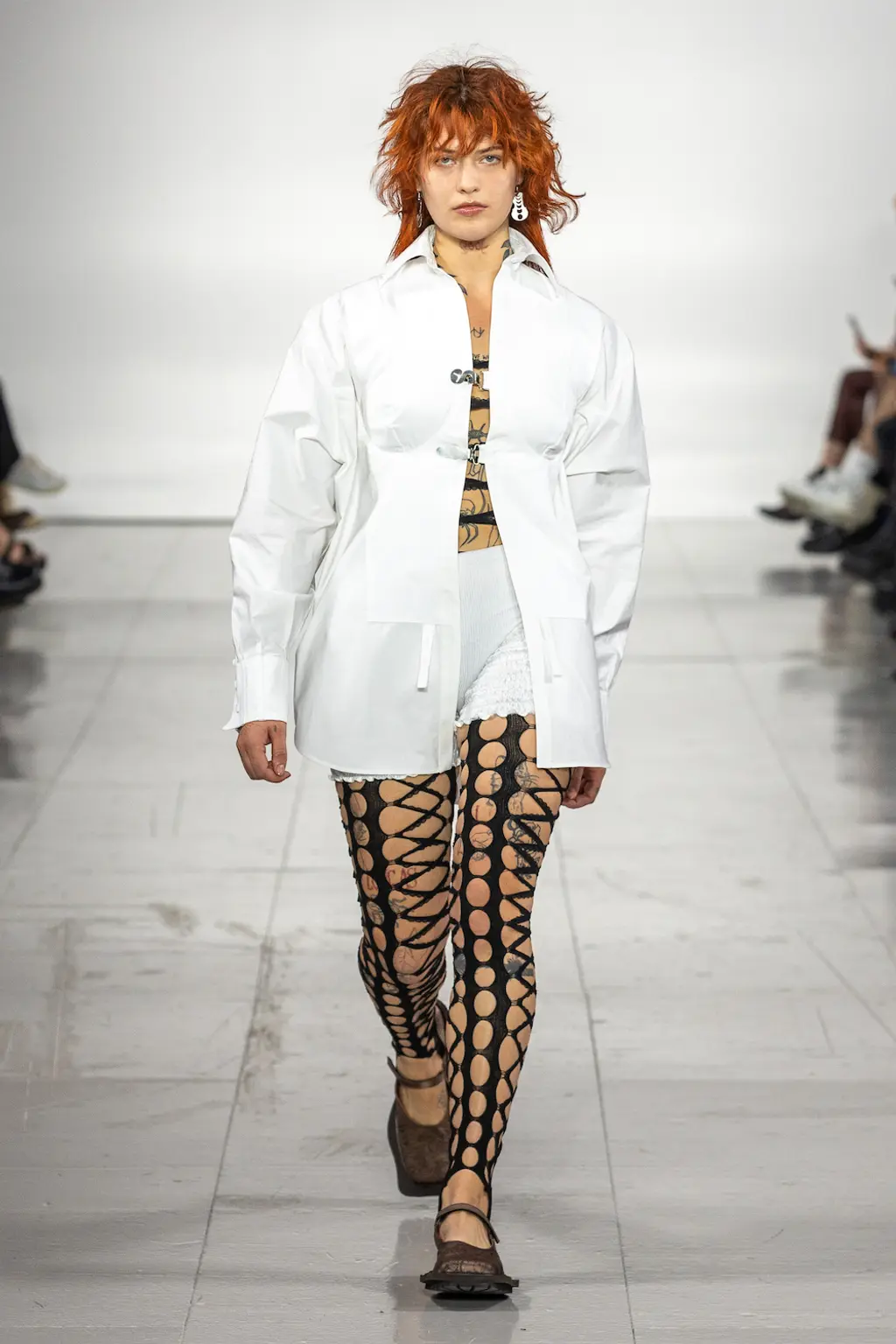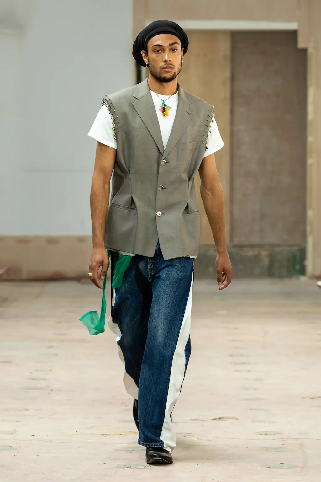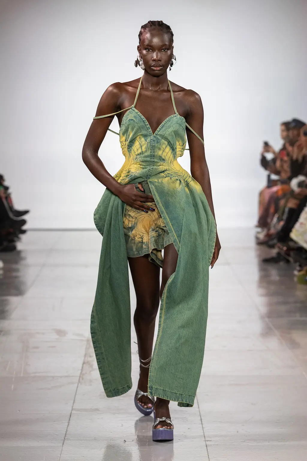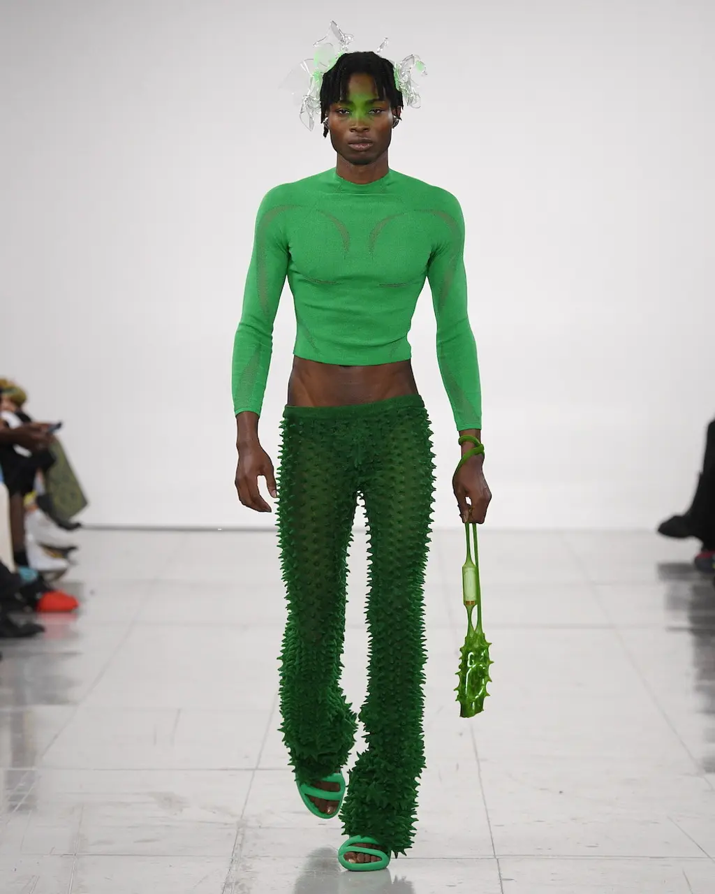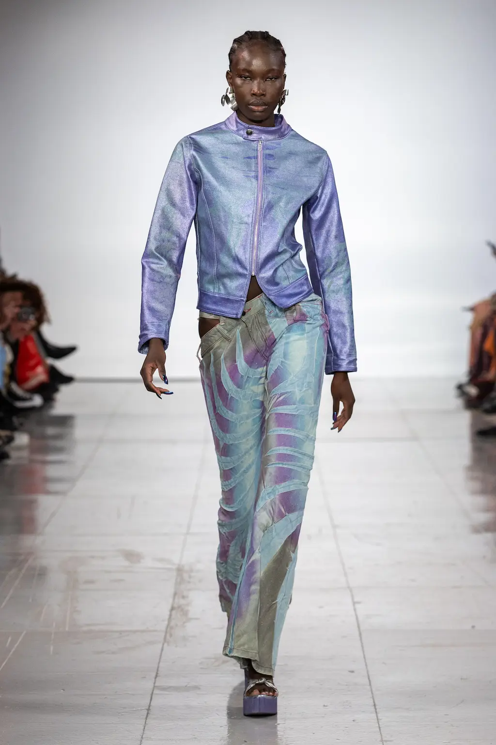 What Dublin-born designer Sinéad O’Dwyer does is radical: a runway collection inclusive of shapes, sizes and disabilities. But with the aid of designers like her, one day it’ll be considered the norm – and that is surely the end goal here. As part of her first season as a British Fashion Council Newgen recipient, O’Dwyer’s collection looked to school summers she spent at music practice camps in rural Ireland (her mum would often play Elgar’s cello concerto); the formality of classical concerts came out in the first few looks with tailored black tuxedo jackets, white poplin shirts and accessorised with bow ties. But the “teenage recklessness” she references in her show notes were punctured in around the midpoint of the show, where the high-voltage nylon swimsuits, ’90s rave-style trousers and electric blue criss-cross detailing felt wickedly rebellious. TJ