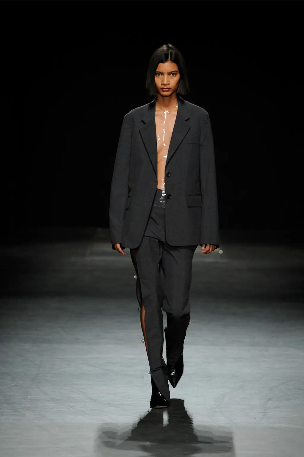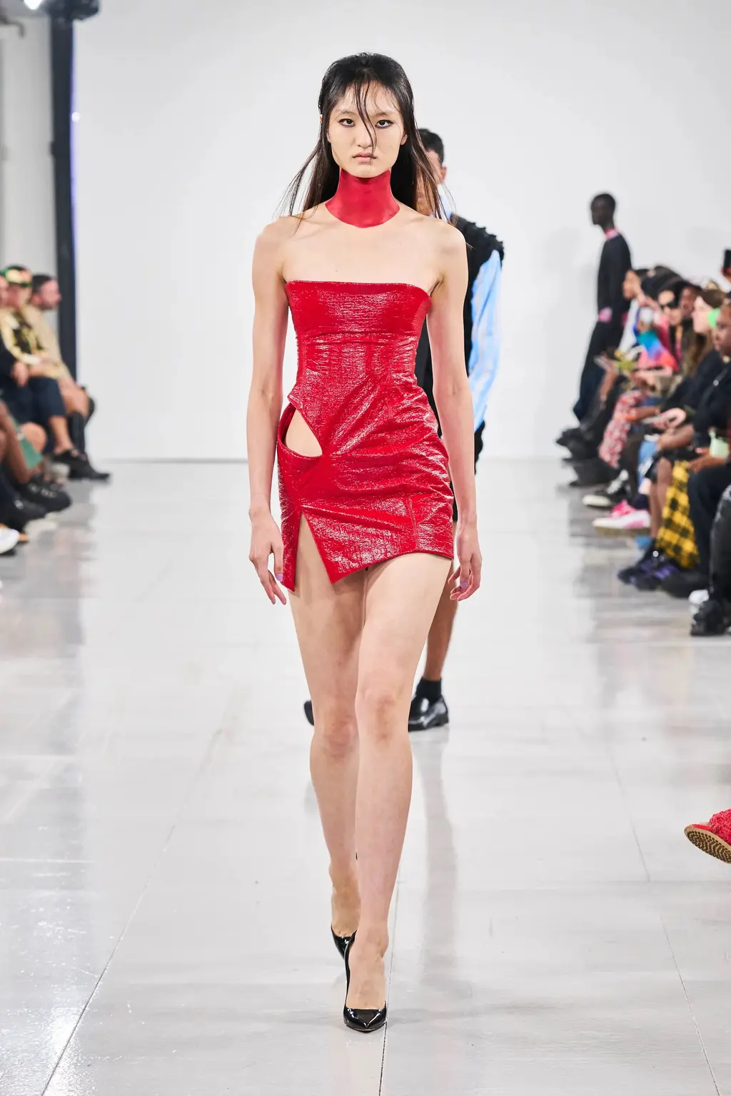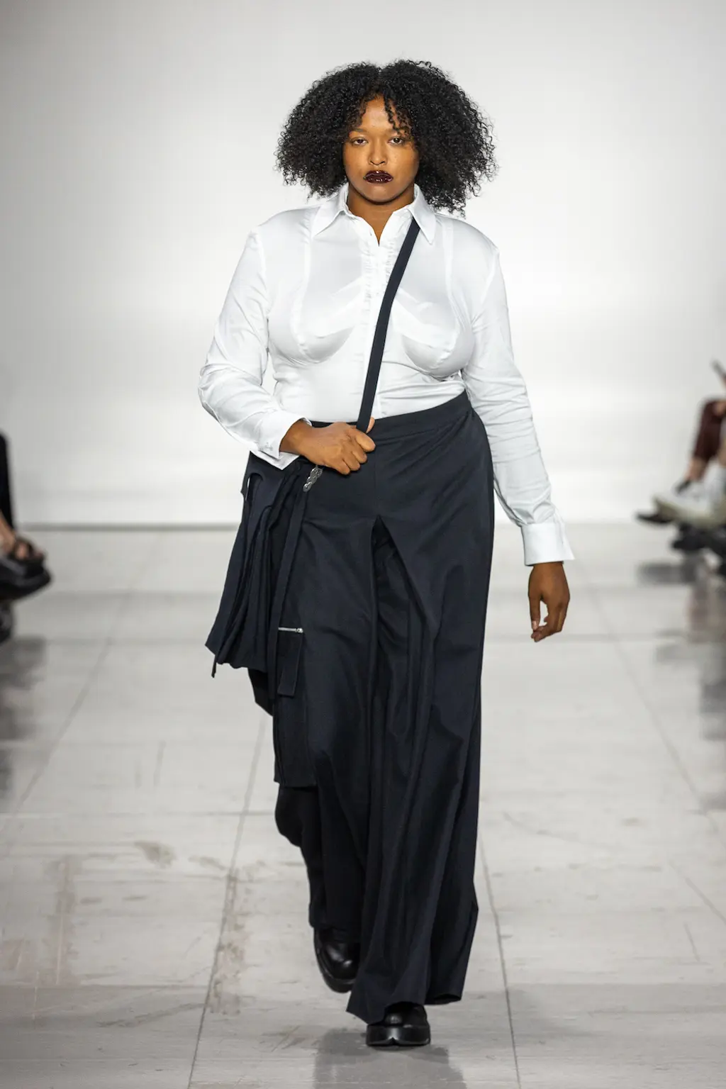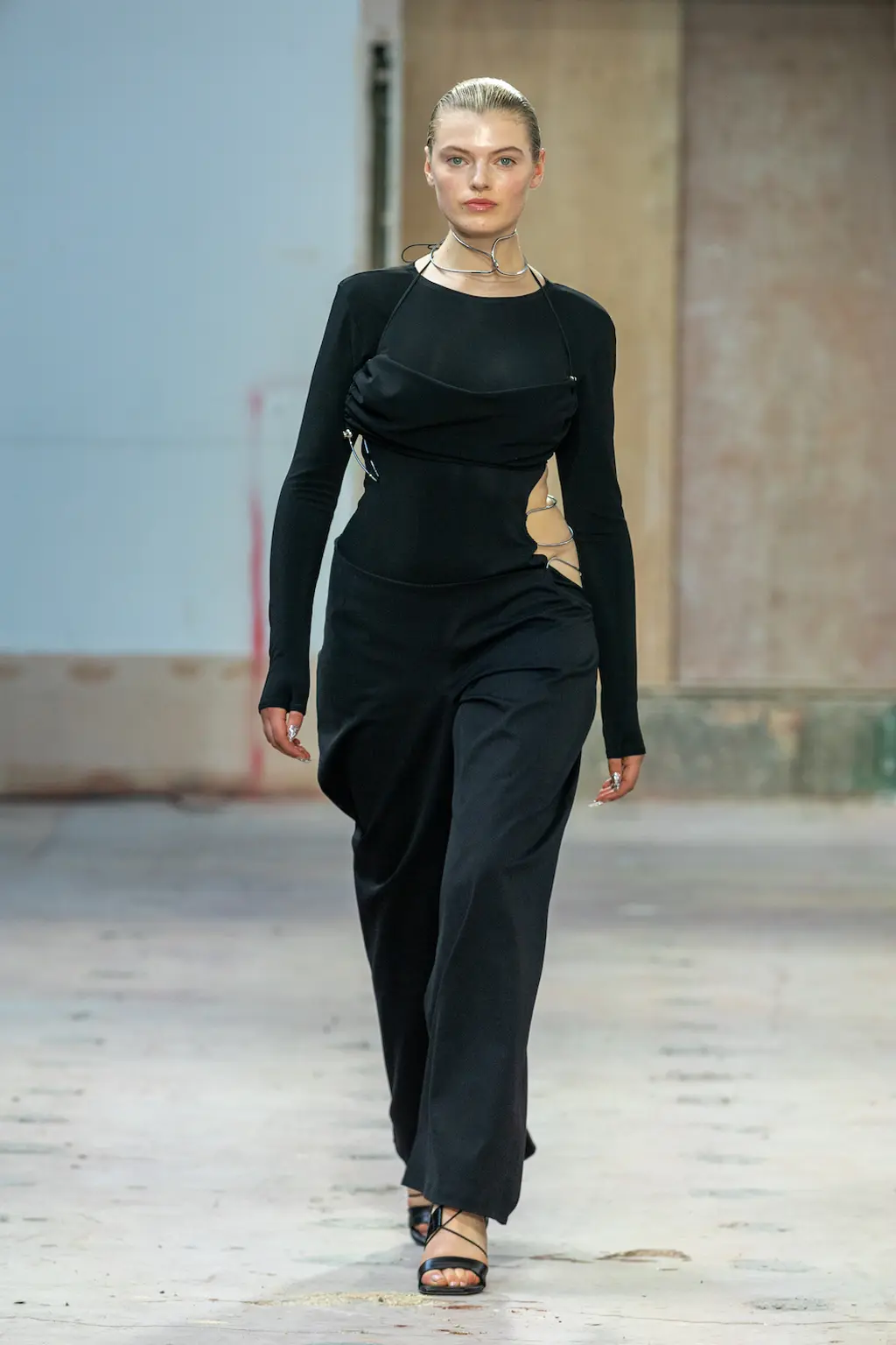 What Dublin-born designer Sinéad O’Dwyer does is radical: a runway collection inclusive of shapes, sizes and disabilities. But with the aid of designers like her, one day it’ll be considered the norm – and that is surely the end goal here. As part of her first season as a British Fashion Council Newgen recipient, O’Dwyer’s collection looked to school summers she spent at music practice camps in rural Ireland (her mum would often play Elgar’s cello concerto); the formality of classical concerts came out in the first few looks with tailored black tuxedo jackets, white poplin shirts and accessorised with bow ties. But the “teenage recklessness” she references in her show notes were punctured in around the midpoint of the show, where the high-voltage nylon swimsuits, ’90s rave-style trousers and electric blue criss-cross detailing felt wickedly rebellious. TJ