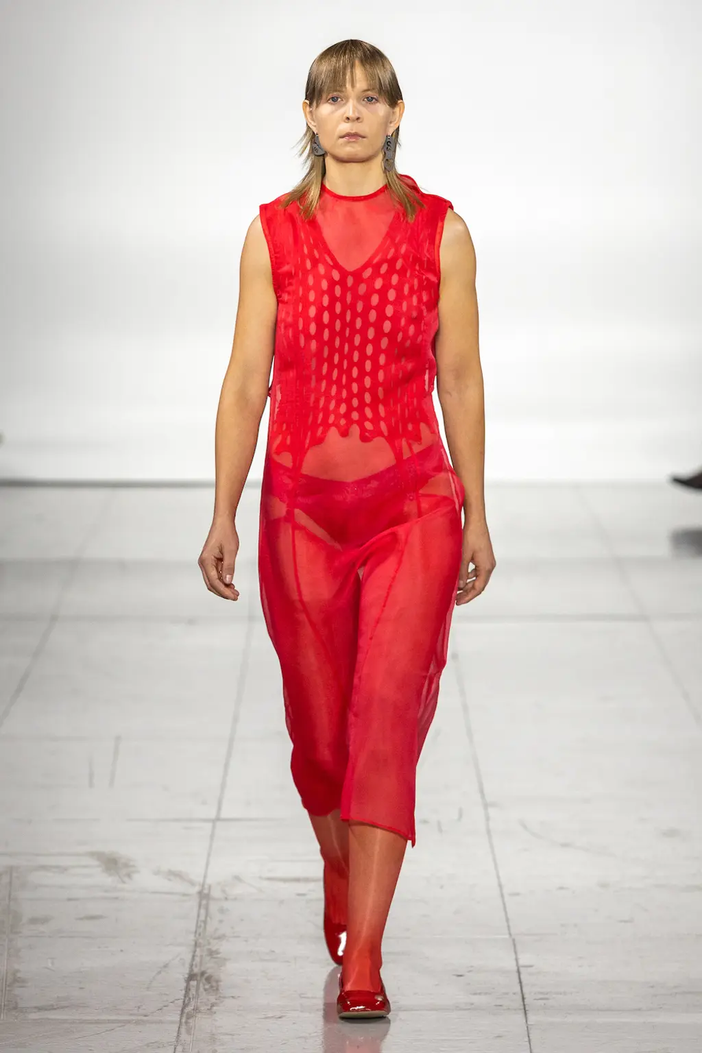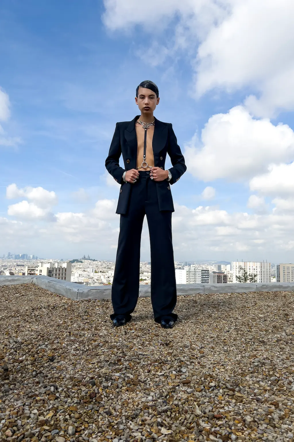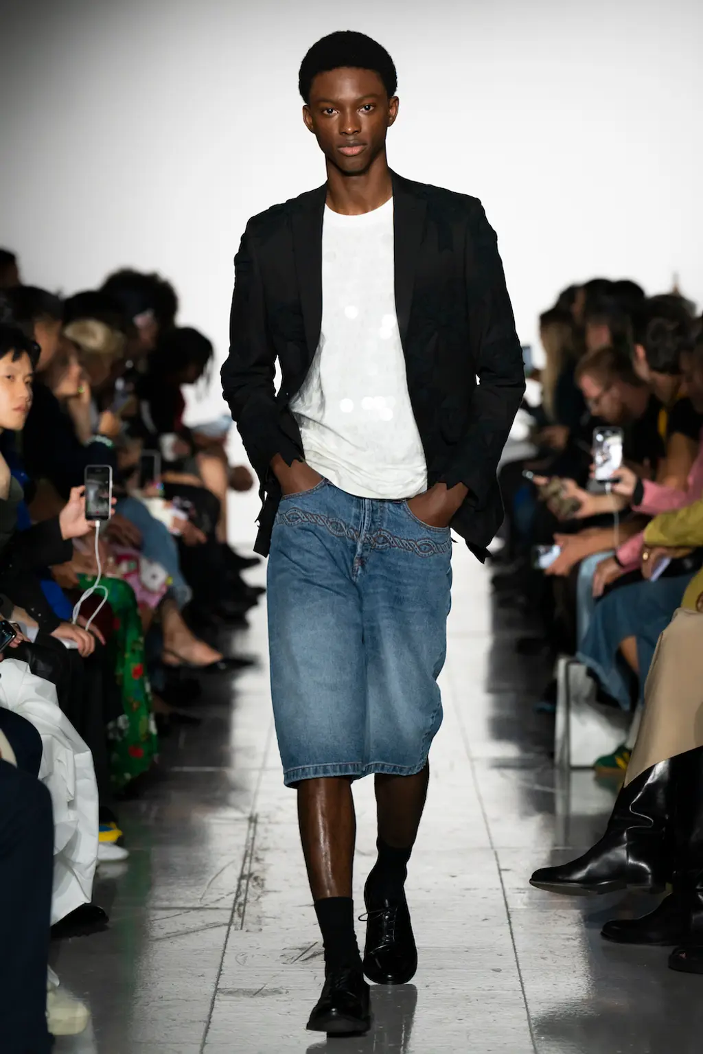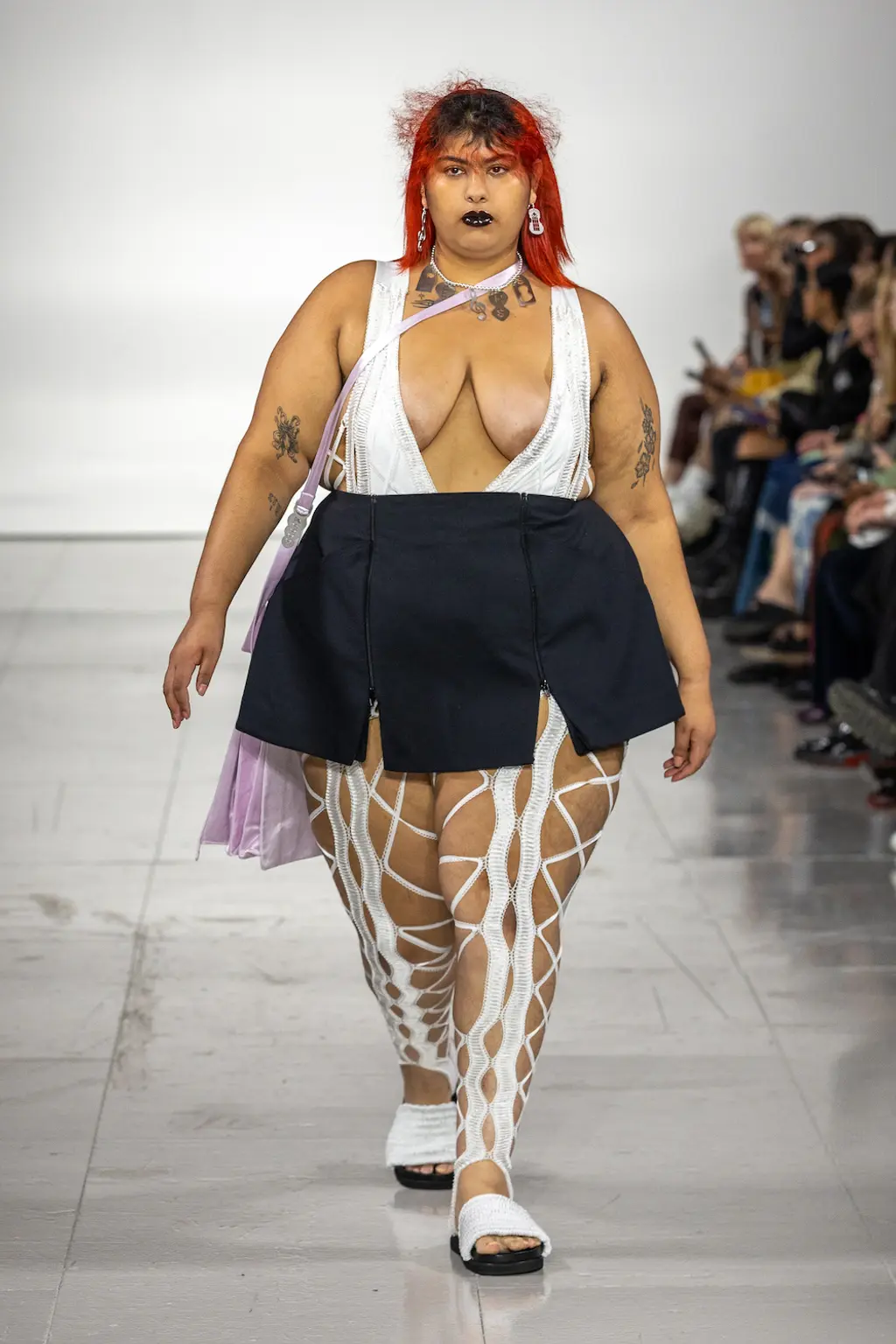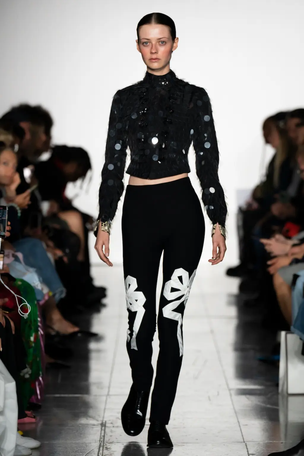 What Dublin-born designer Sinéad O’Dwyer does is radical: a runway collection inclusive of shapes, sizes and disabilities. But with the aid of designers like her, one day it’ll be considered the norm – and that is surely the end goal here. As part of her first season as a British Fashion Council Newgen recipient, O’Dwyer’s collection looked to school summers she spent at music practice camps in rural Ireland (her mum would often play Elgar’s cello concerto); the formality of classical concerts came out in the first few looks with tailored black tuxedo jackets, white poplin shirts and accessorised with bow ties. But the “teenage recklessness” she references in her show notes were punctured in around the midpoint of the show, where the high-voltage nylon swimsuits, ’90s rave-style trousers and electric blue criss-cross detailing felt wickedly rebellious. TJ