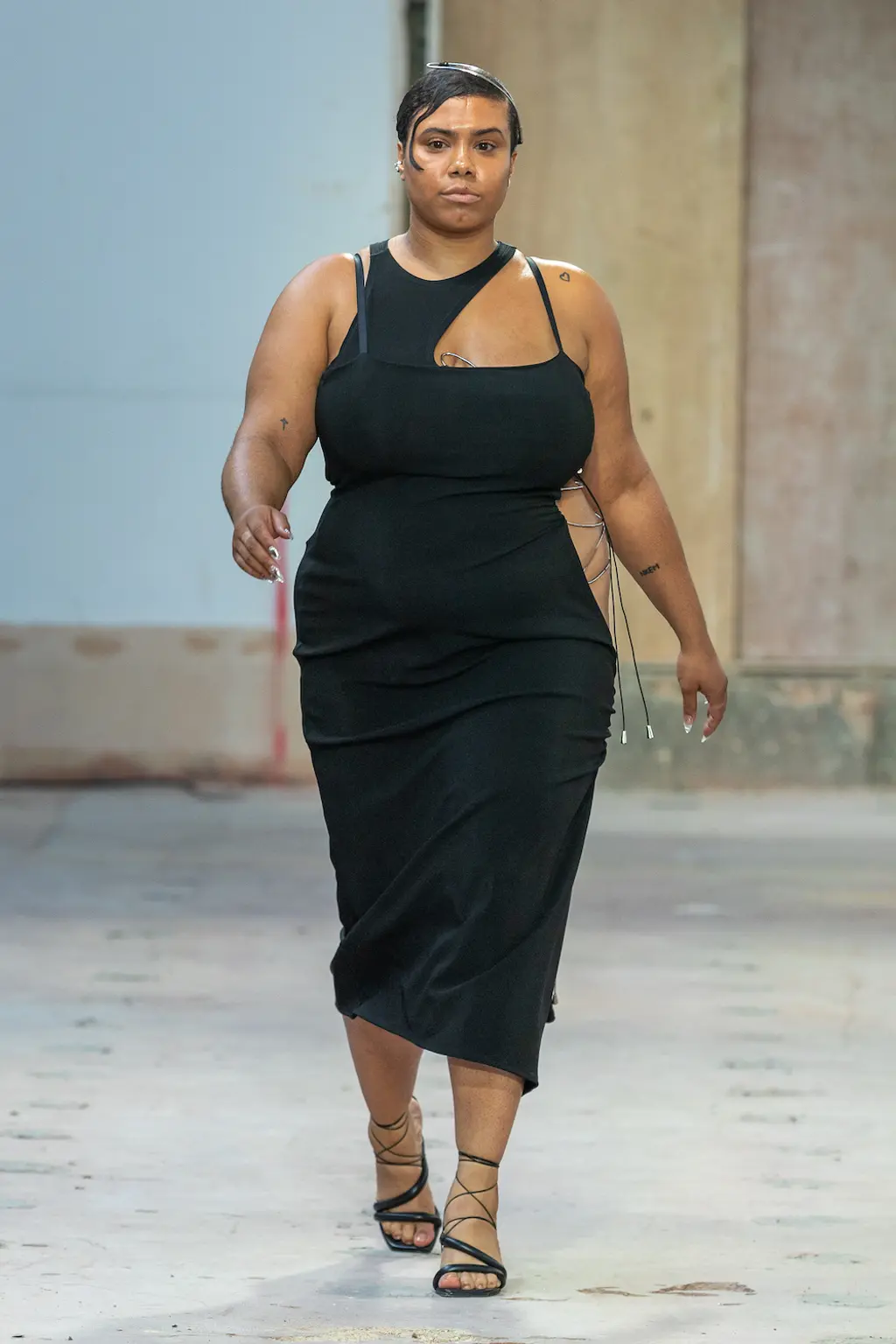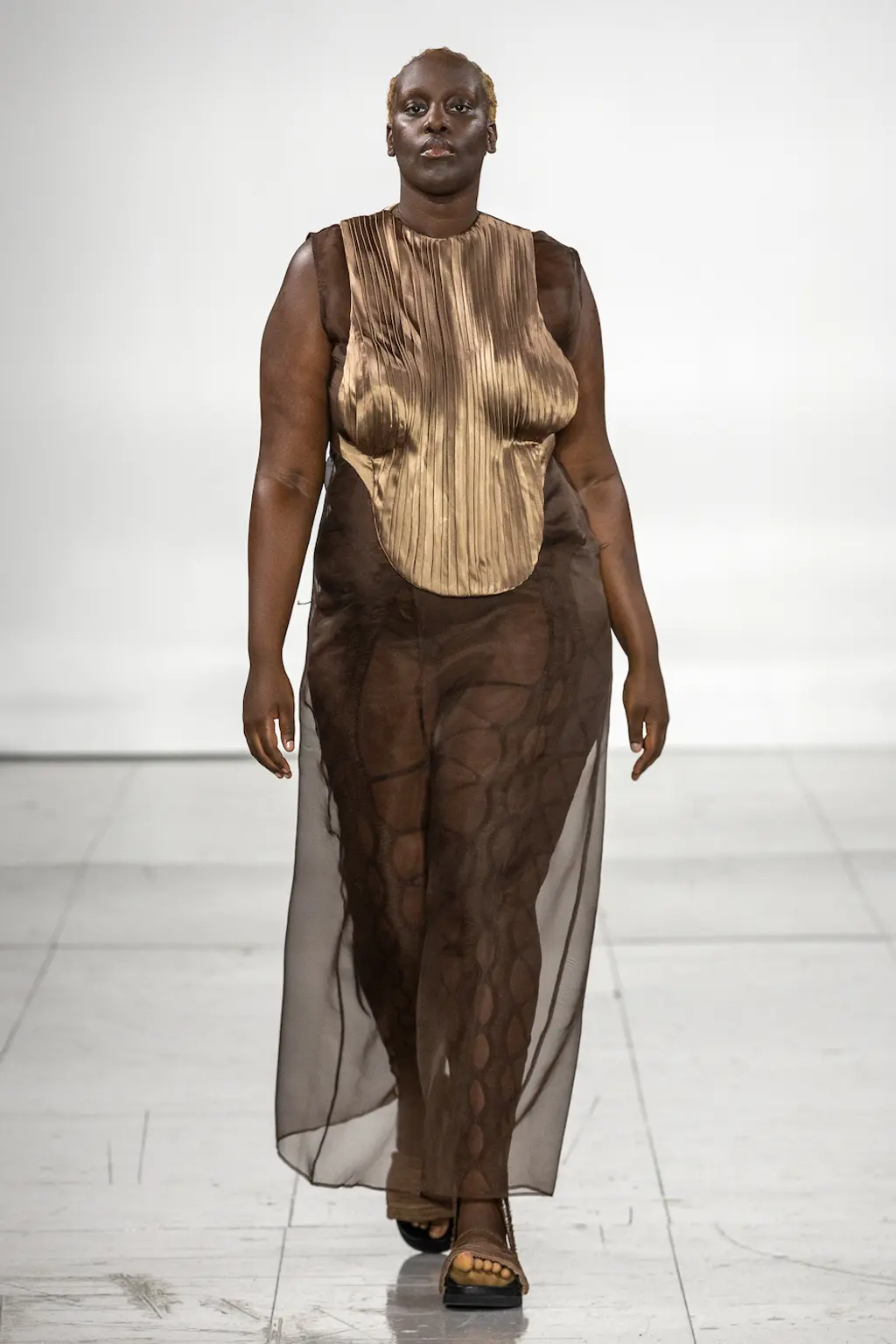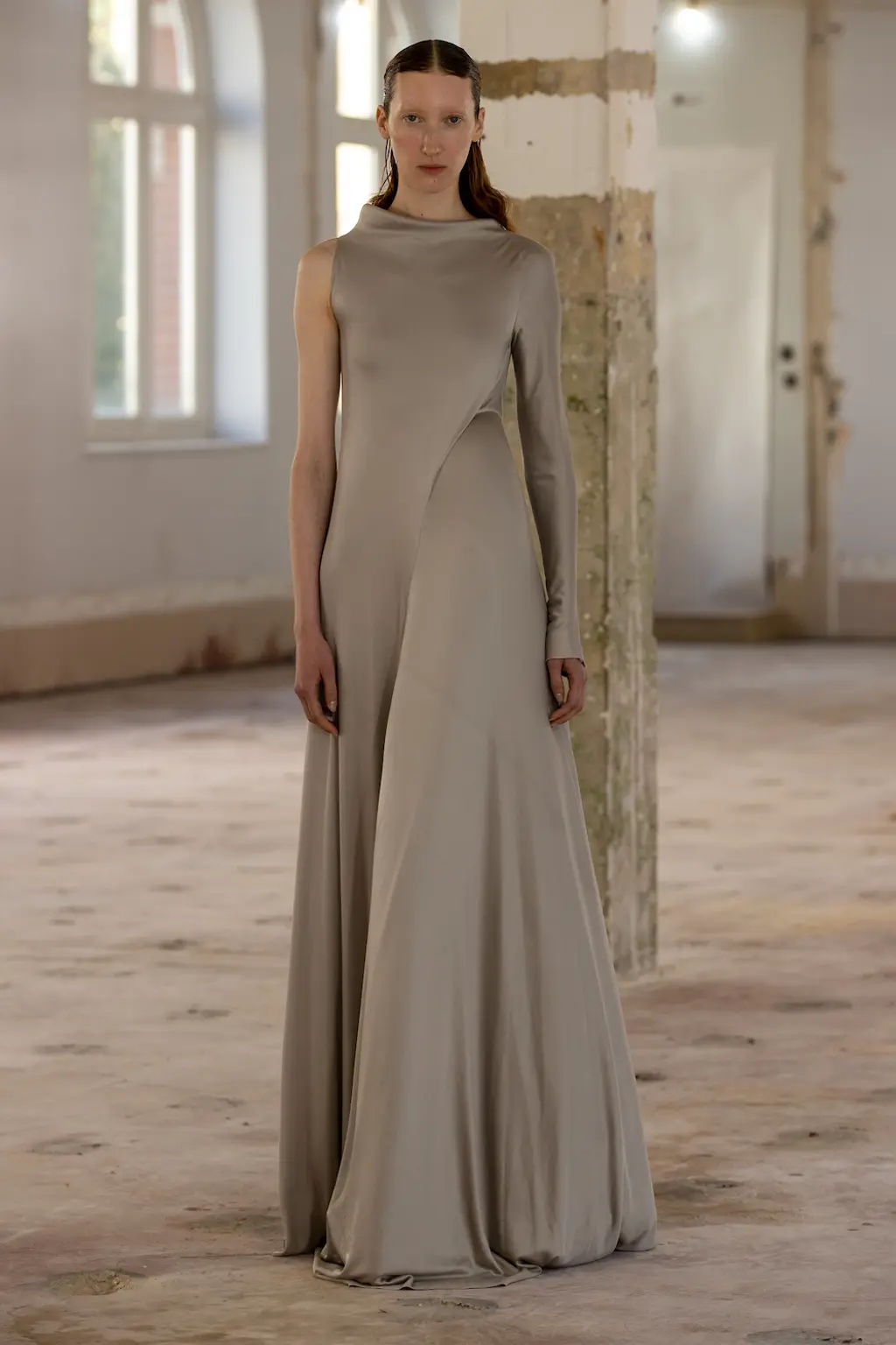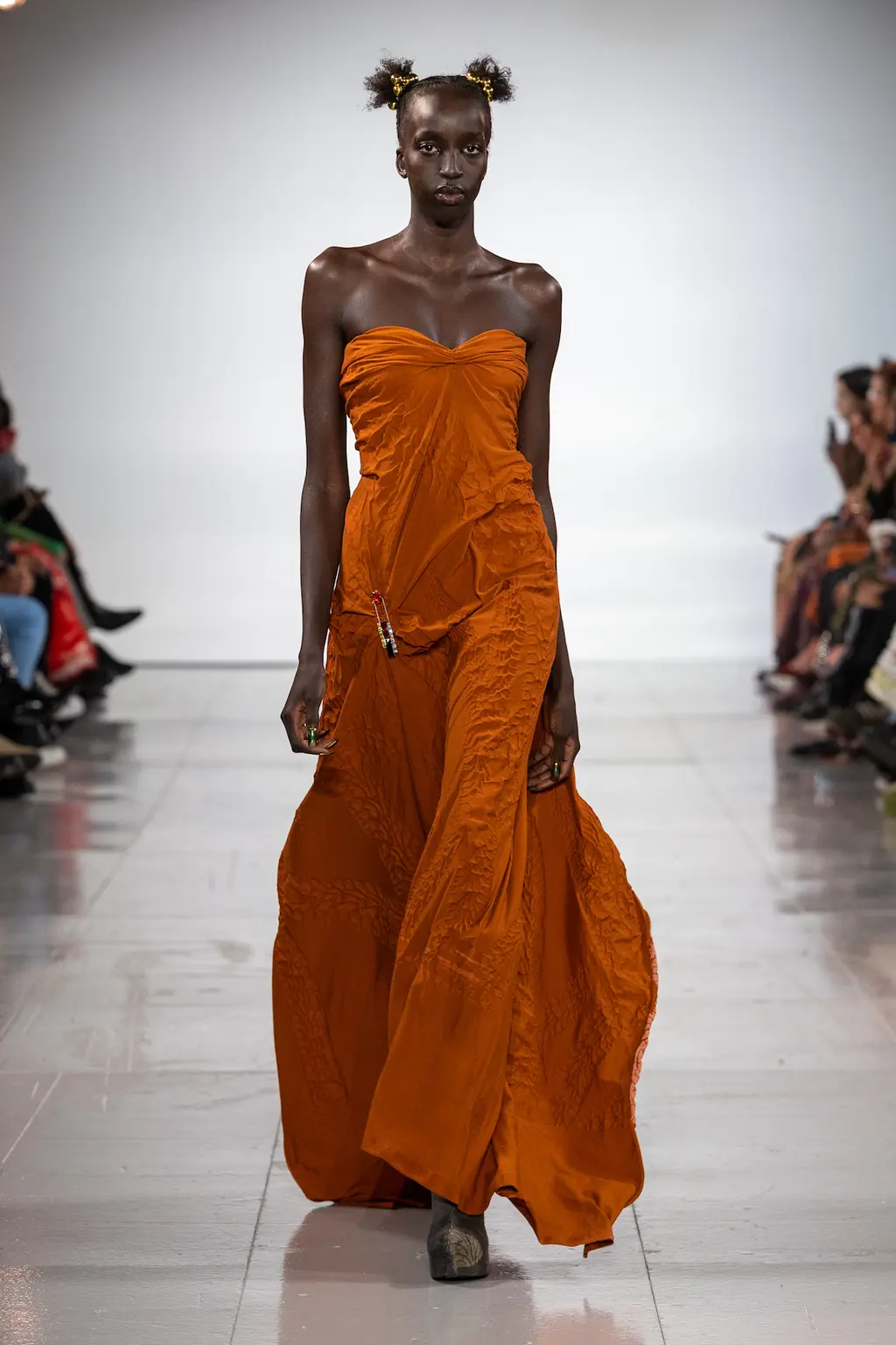 In a political landscape that can often feel as though it’s moving backwards, the three designers who presented today celebrated diversity and unity – as well as womanhood in all its nuances. Karoline Vitto’s championing of body shapes in sizes 8 – 28 felt deeply contemporary. There is no rigid one-size policy on the designer’s runway, with her deconstructed, sheer dresses strategically revealing portions of the models’ bodies, clasped together by metal rings. Meanwhile Standing Ground presented its gowns statically, so the designs were appreciated in their sculptural forms, hanging off bodies like Grecian statues. Yet even while motionless, the designs retained a sensual, romantic fluidity thanks to skilful draping.
