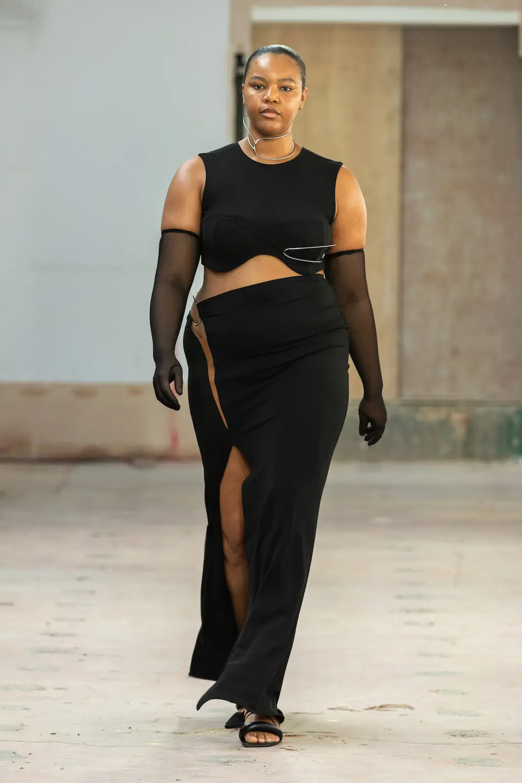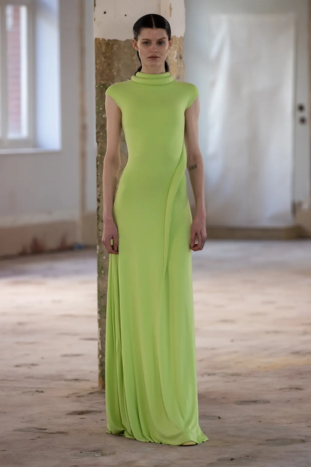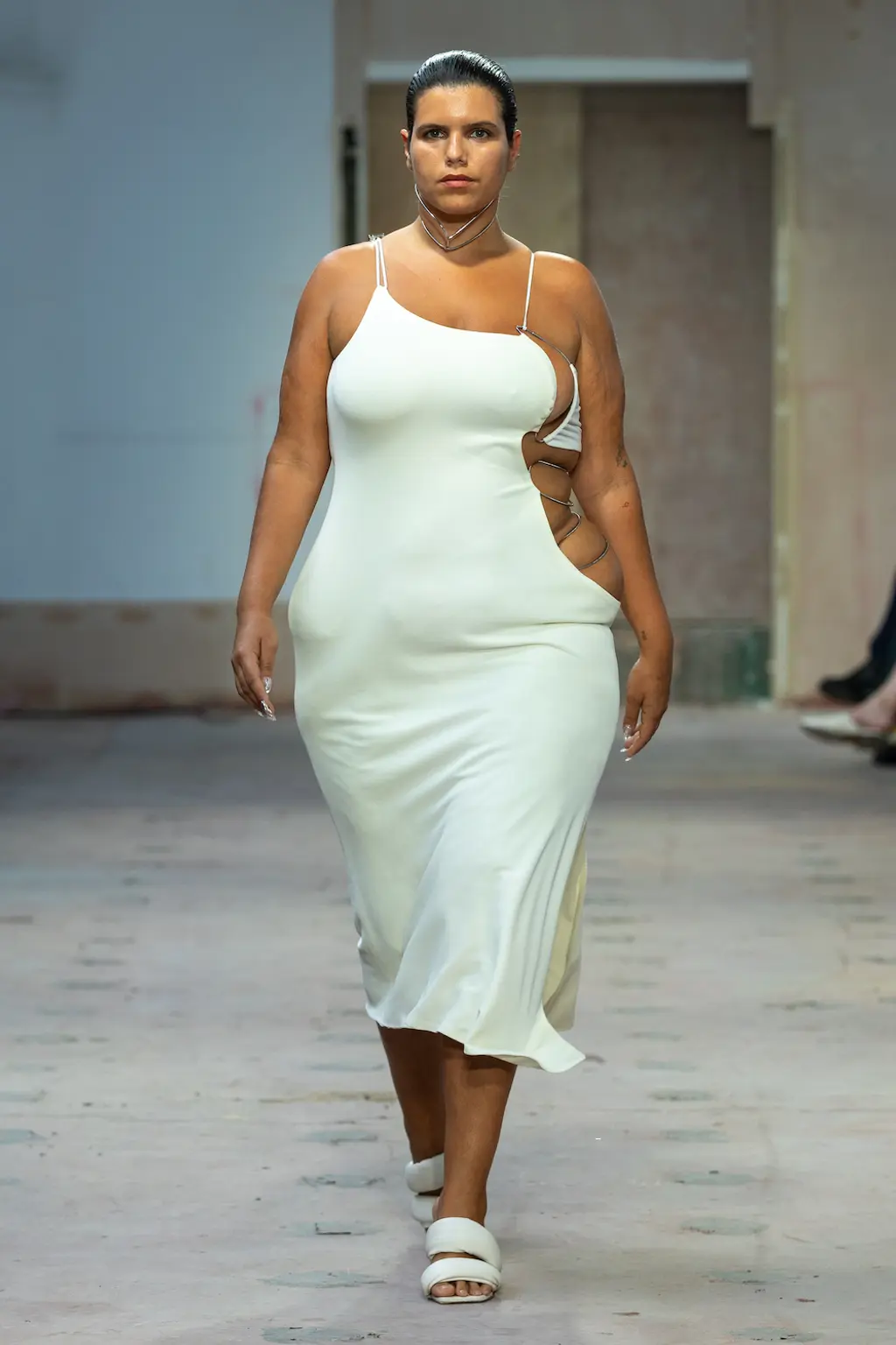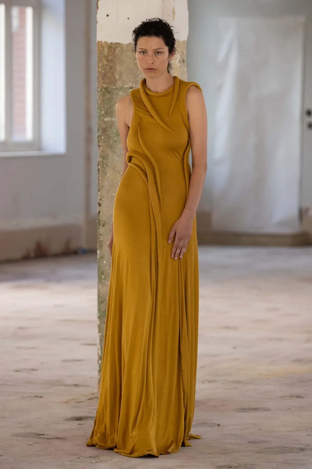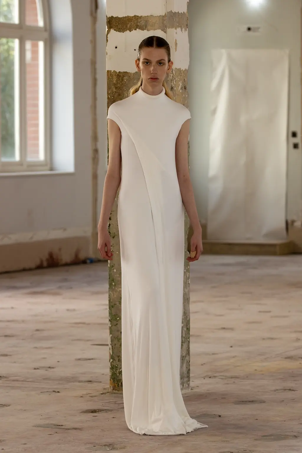 In a political landscape that can often feel as though it’s moving backwards, the three designers who presented today celebrated diversity and unity – as well as womanhood in all its nuances. Karoline Vitto’s championing of body shapes in sizes 8 – 28 felt deeply contemporary. There is no rigid one-size policy on the designer’s runway, with her deconstructed, sheer dresses strategically revealing portions of the models’ bodies, clasped together by metal rings. Meanwhile Standing Ground presented its gowns statically, so the designs were appreciated in their sculptural forms, hanging off bodies like Grecian statues. Yet even while motionless, the designs retained a sensual, romantic fluidity thanks to skilful draping.