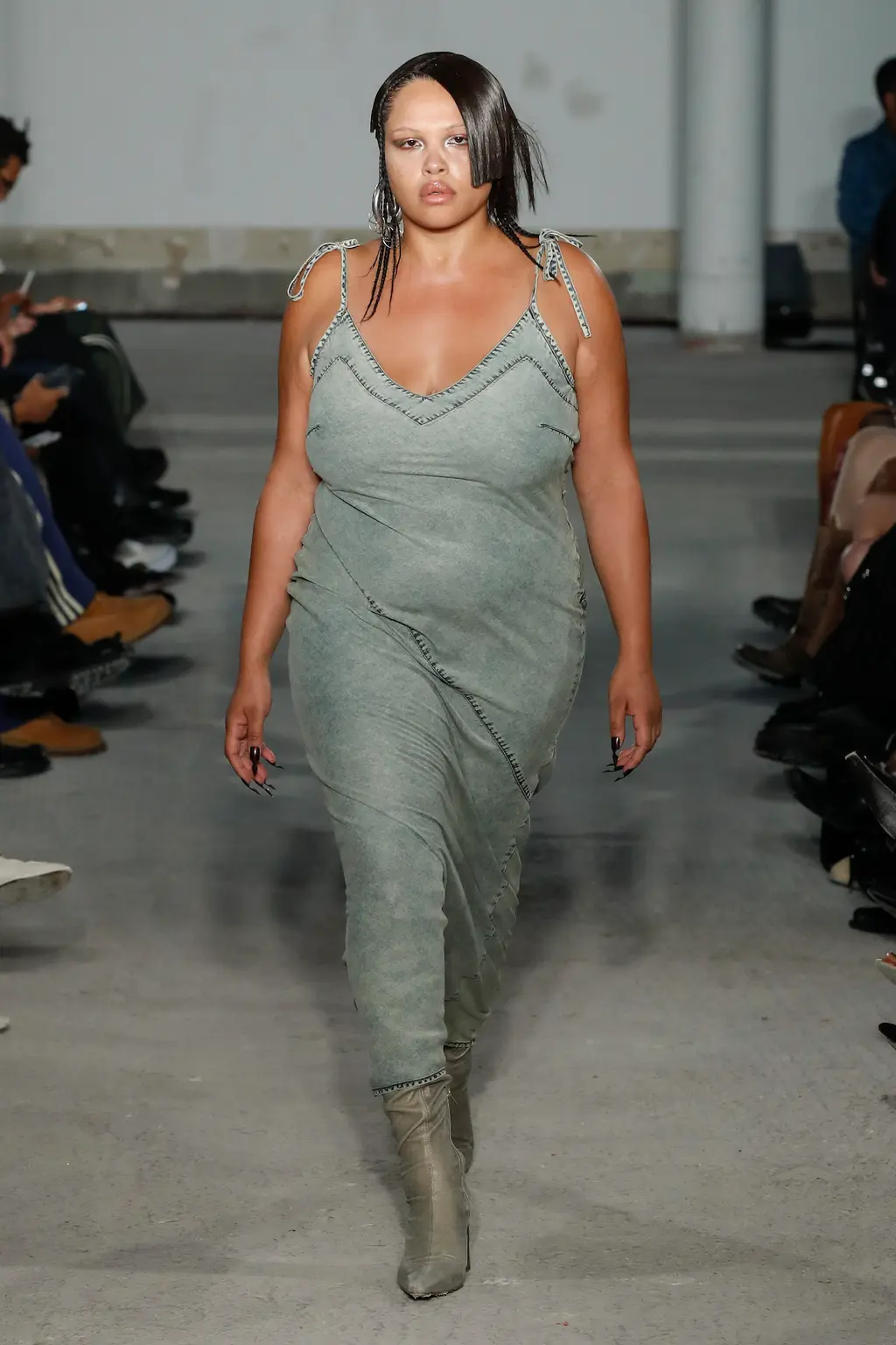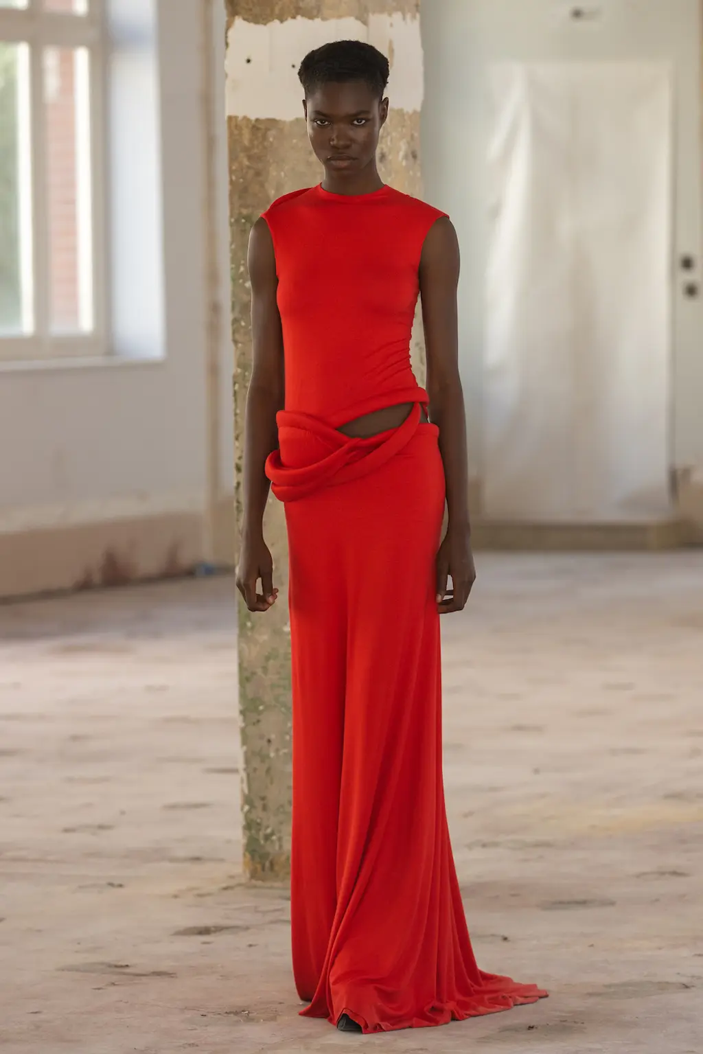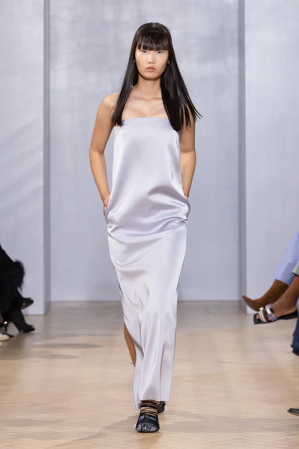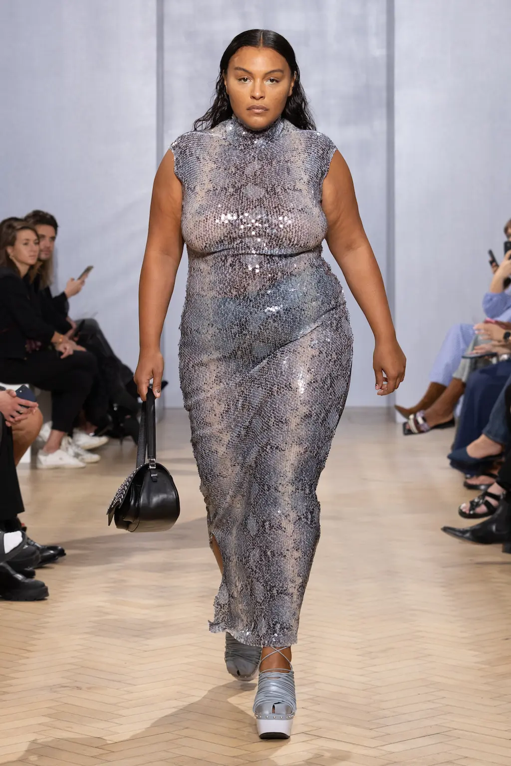 In a political landscape that can often feel as though it’s moving backwards, the three designers who presented today celebrated diversity and unity – as well as womanhood in all its nuances. Karoline Vitto’s championing of body shapes in sizes 8 – 28 felt deeply contemporary. There is no rigid one-size policy on the designer’s runway, with her deconstructed, sheer dresses strategically revealing portions of the models’ bodies, clasped together by metal rings. Meanwhile Standing Ground presented its gowns statically, so the designs were appreciated in their sculptural forms, hanging off bodies like Grecian statues. Yet even while motionless, the designs retained a sensual, romantic fluidity thanks to skilful draping.