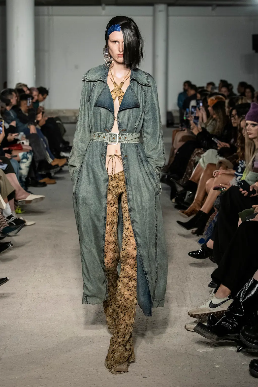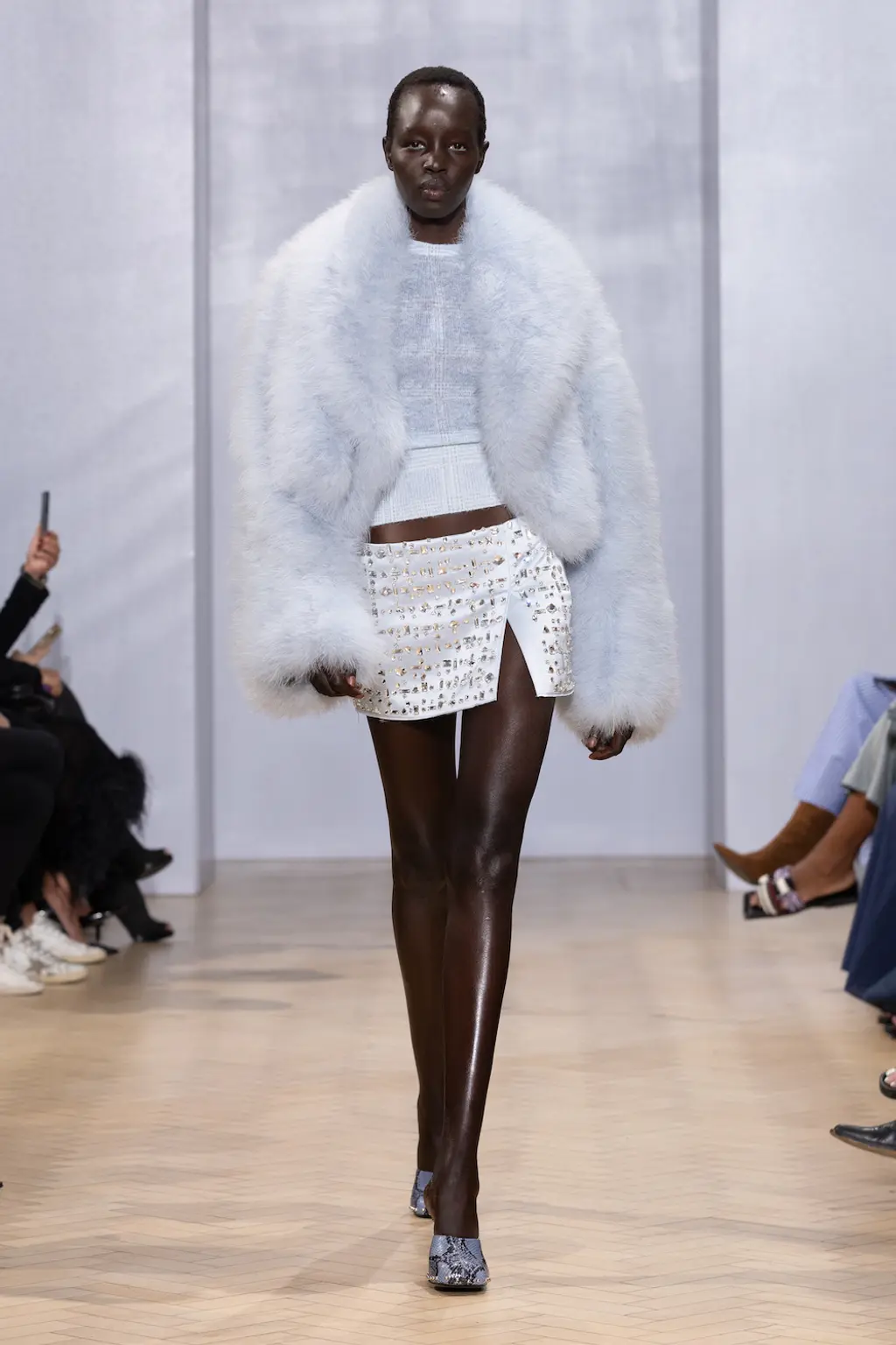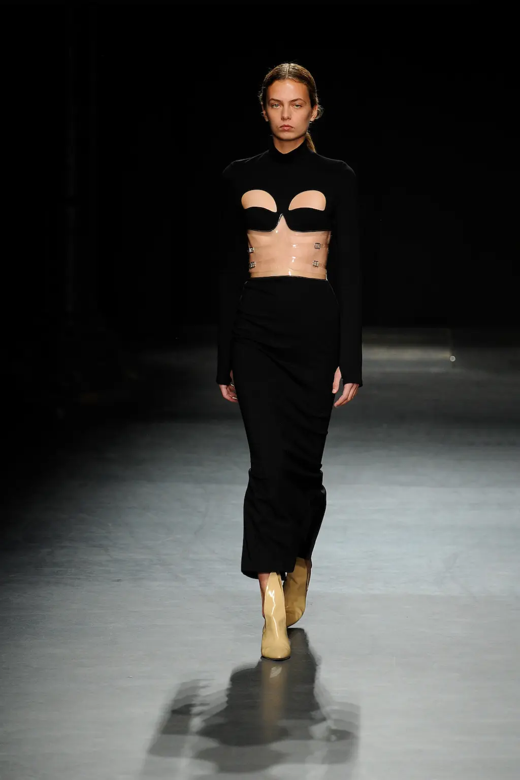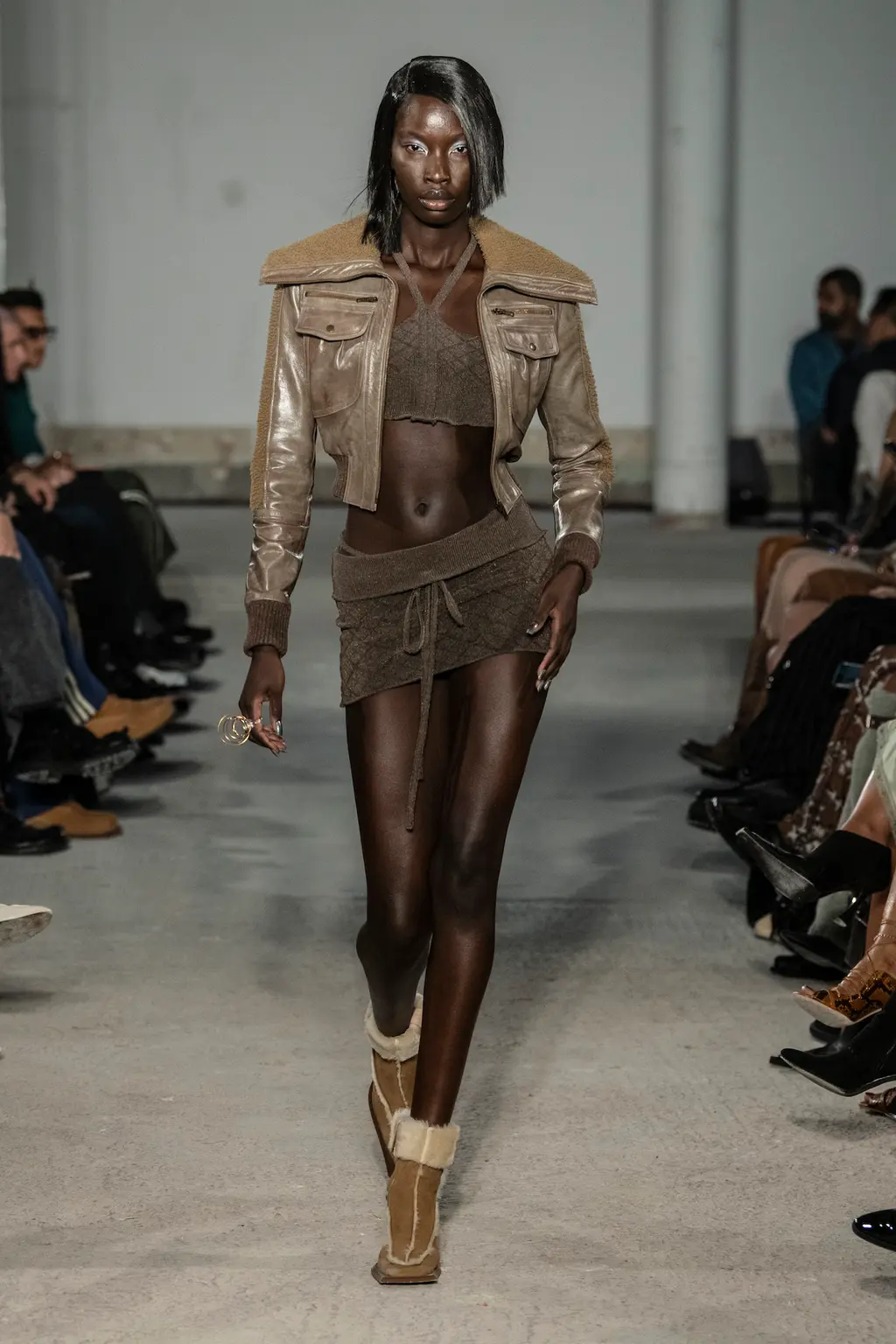 This season’s combative silhouettes and armour-like layers were peppered with seductive details: exposed thongs, corseted leotards, chunky Y2K-leaning belts, oversized twisted metal hoop earrings, embellished shearling boots in collaboration with UGG and a studded iteration of the label’s distinctive angular bag.