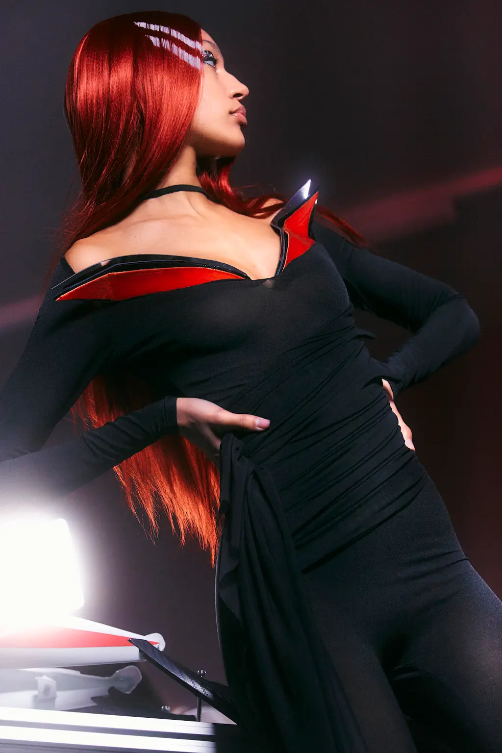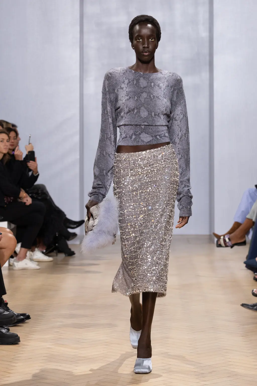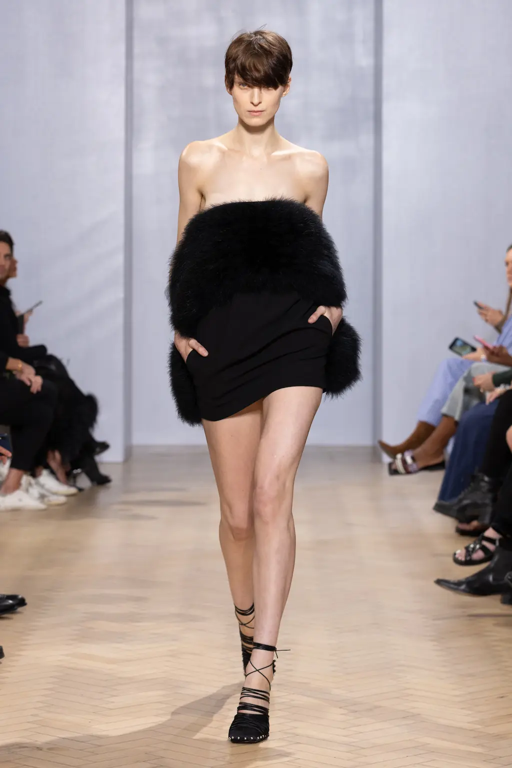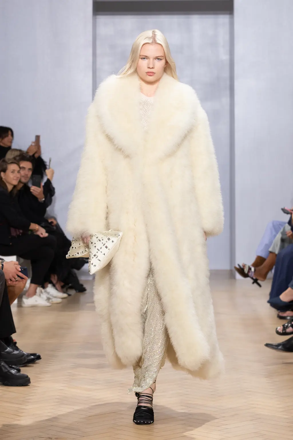 This season’s combative silhouettes and armour-like layers were peppered with seductive details: exposed thongs, corseted leotards, chunky Y2K-leaning belts, oversized twisted metal hoop earrings, embellished shearling boots in collaboration with UGG and a studded iteration of the label’s distinctive angular bag.