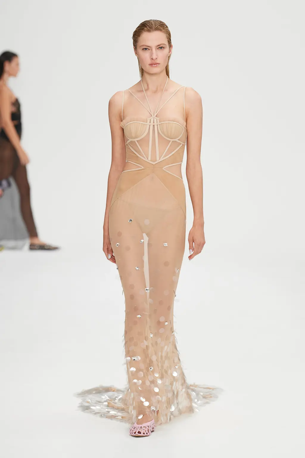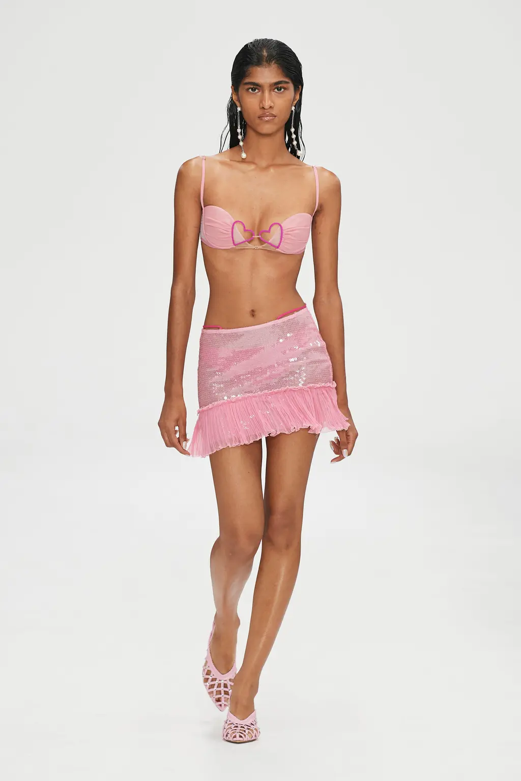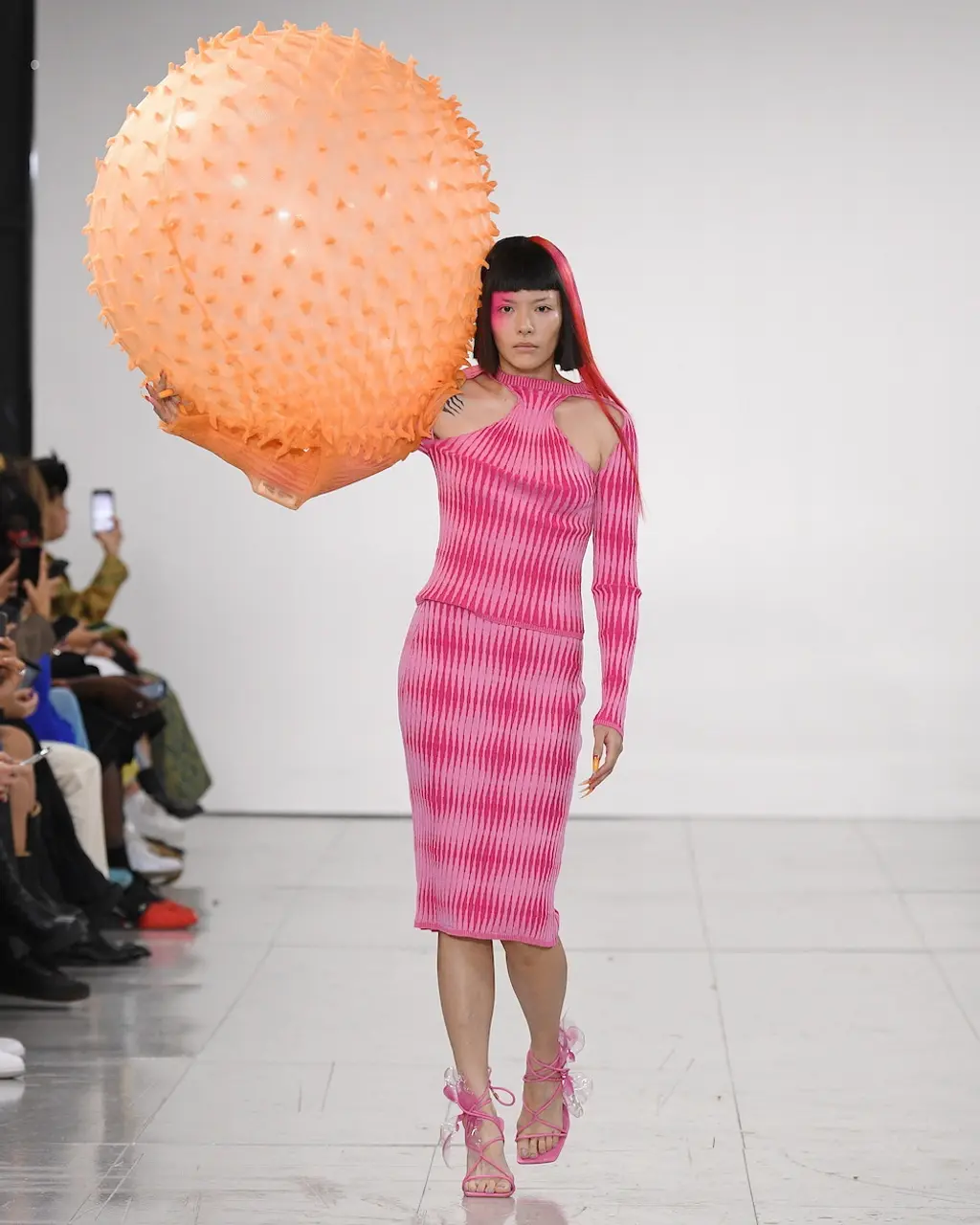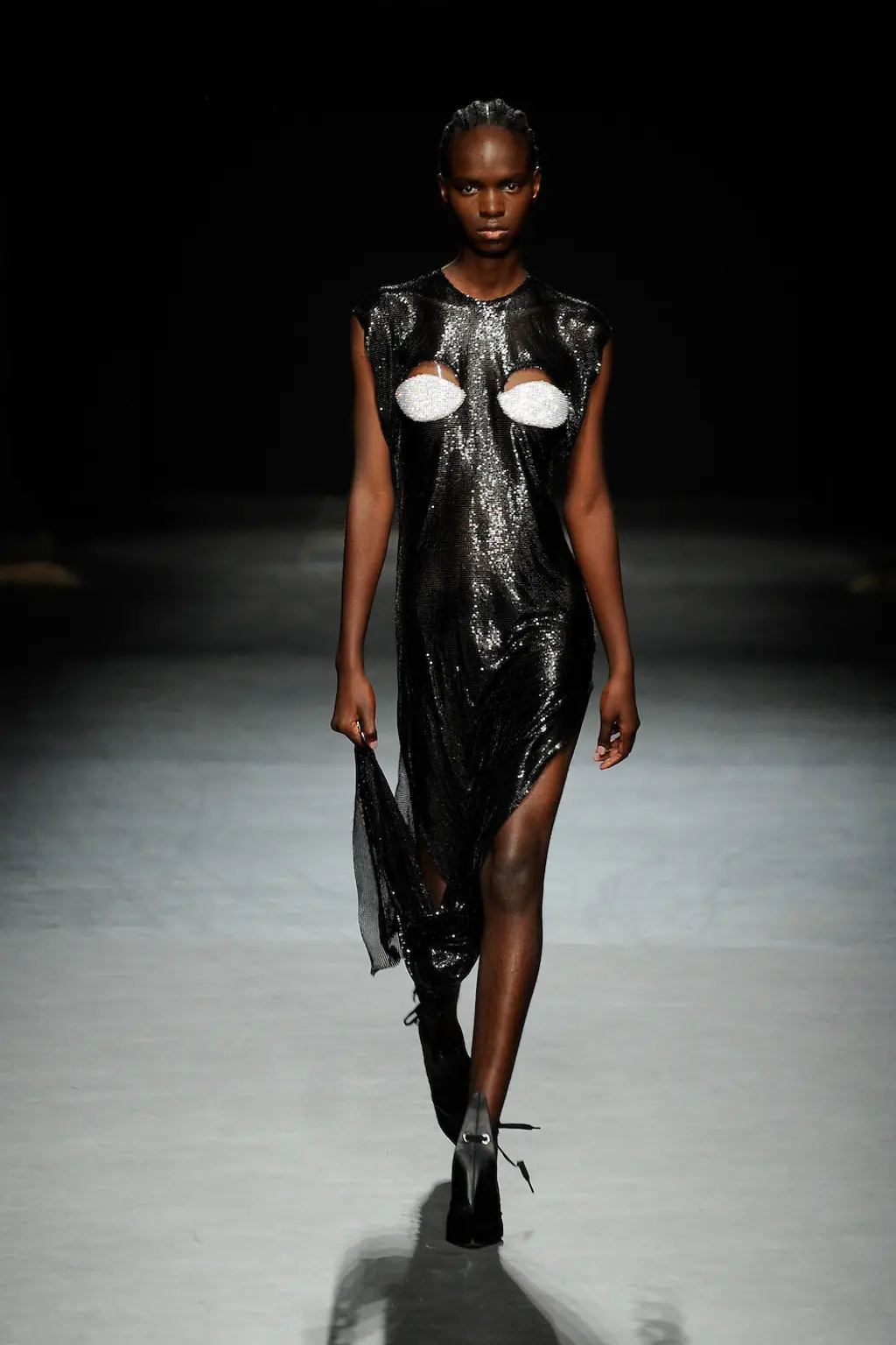 Nensi Dojaka, a previous winner of the LVMH Prize, has produced a winning streak of collections since debuting with Fashion East just two years ago, receiving high praise for the complexity of her designs, subtle sexiness and sophistication. All was full of love this season, with the signature monochrome pieces spiked with romantic pinks, lilacs and reds, and heart-shaped clasps sat on the cleavage. Slick suiting and thigh-high slits felt ultra-modern, retaining the crisp, late-’90s-influenced tailoring that the designer has reworked over her past collections. And the body – a critical component for Nensi Dojaka – was revealed in new ways: a nude dress swept the floor, while frilly skirts with tulle detailing and a cut-out pink sequin gown were a lively addition to yet another big win for the designer. TJ