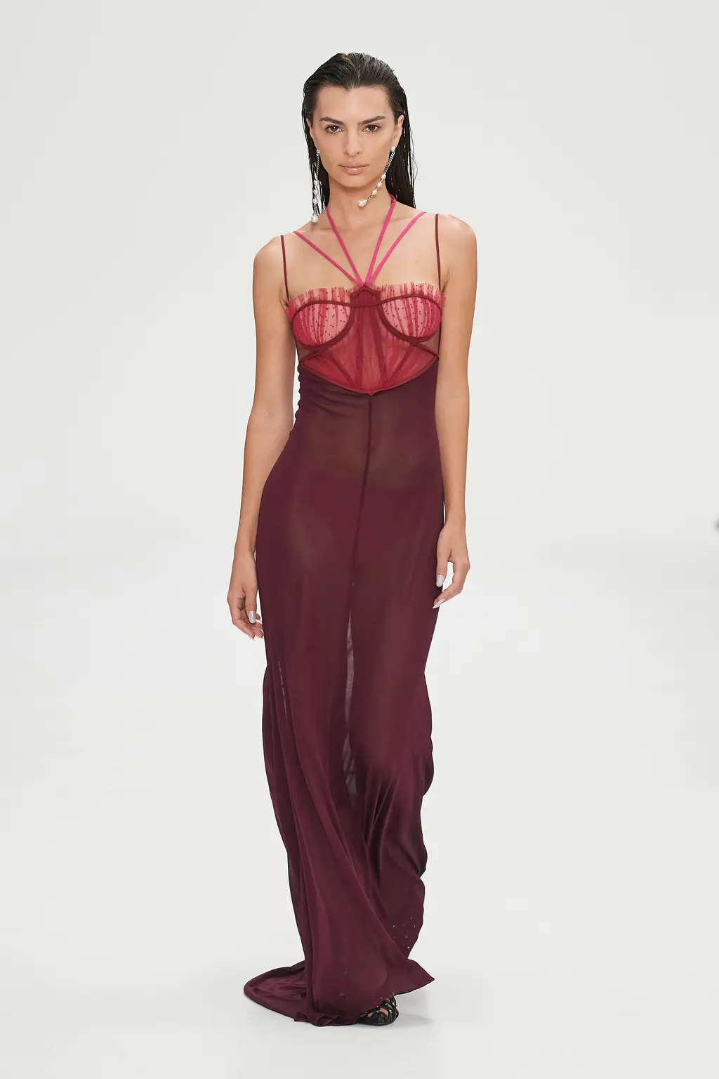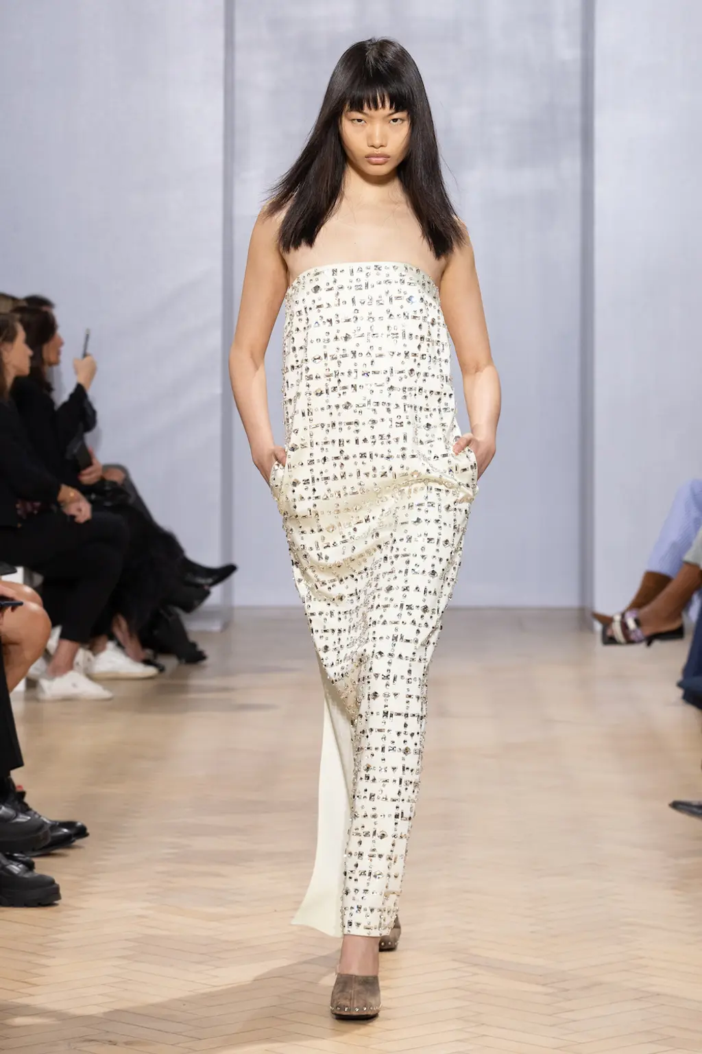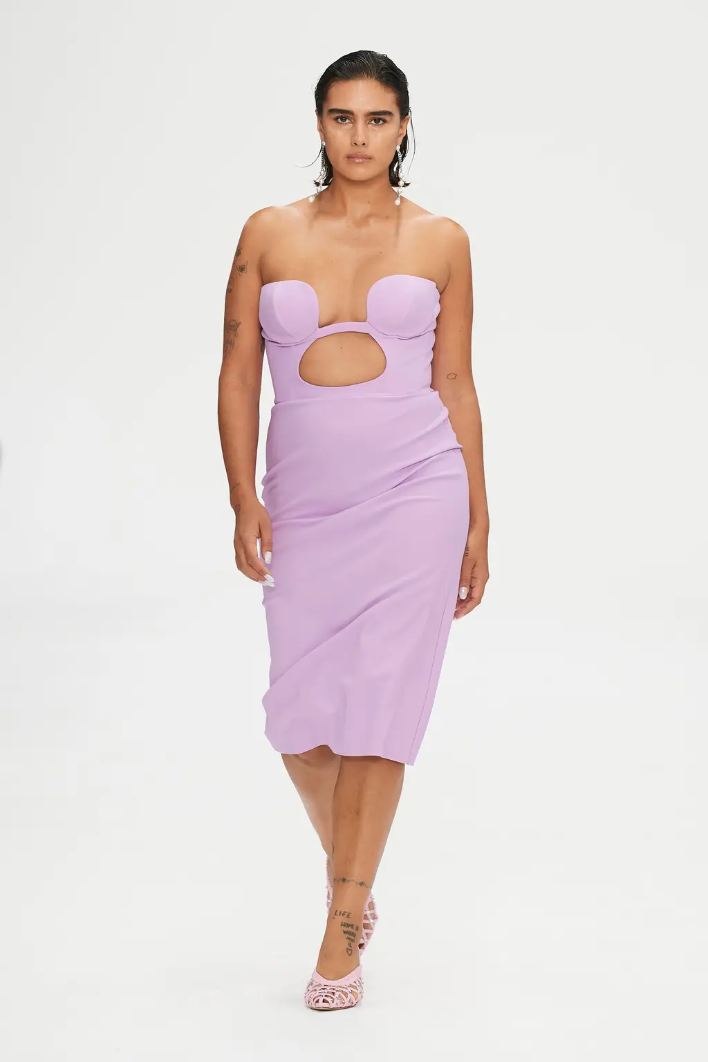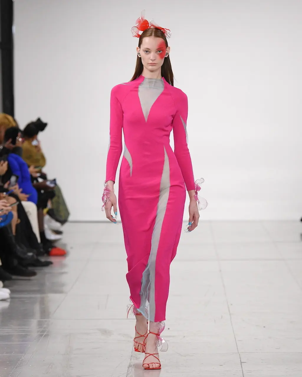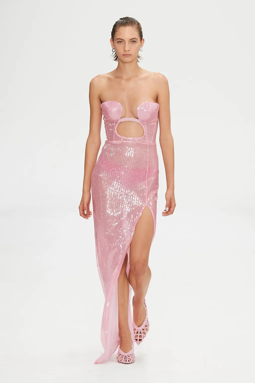 Nensi Dojaka, a previous winner of the LVMH Prize, has produced a winning streak of collections since debuting with Fashion East just two years ago, receiving high praise for the complexity of her designs, subtle sexiness and sophistication. All was full of love this season, with the signature monochrome pieces spiked with romantic pinks, lilacs and reds, and heart-shaped clasps sat on the cleavage. Slick suiting and thigh-high slits felt ultra-modern, retaining the crisp, late-’90s-influenced tailoring that the designer has reworked over her past collections. And the body – a critical component for Nensi Dojaka – was revealed in new ways: a nude dress swept the floor, while frilly skirts with tulle detailing and a cut-out pink sequin gown were a lively addition to yet another big win for the designer. TJ