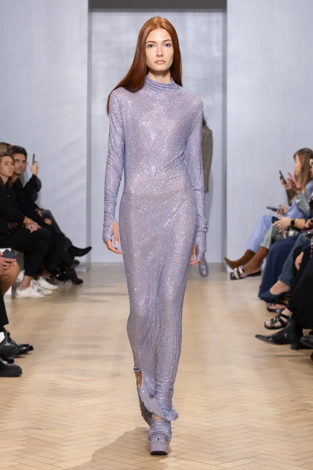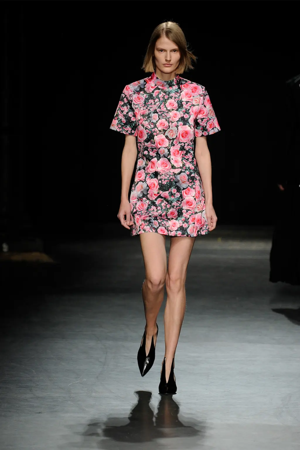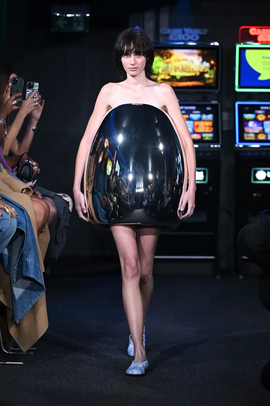 The questioning continued into the clothes, where dresses collided with giant keyboard keys and items were printed with stock, screensaver imagery: palm trees, dolphins and sunsets (noteworthy for being digital interpretations of nature). A shining mirror orb dress reflected, quelle surprise, a room full of phones, while a dress shaped like a plastic bag with a goldfish inside was what? A comment on privacy in an age of digital surveillance? A statement on the fashion industry’s goldfish-like memory? Or just a prize won on an arcade slot machine? Anderson needn’t worry: his shows are always richly, rewardingly interesting.