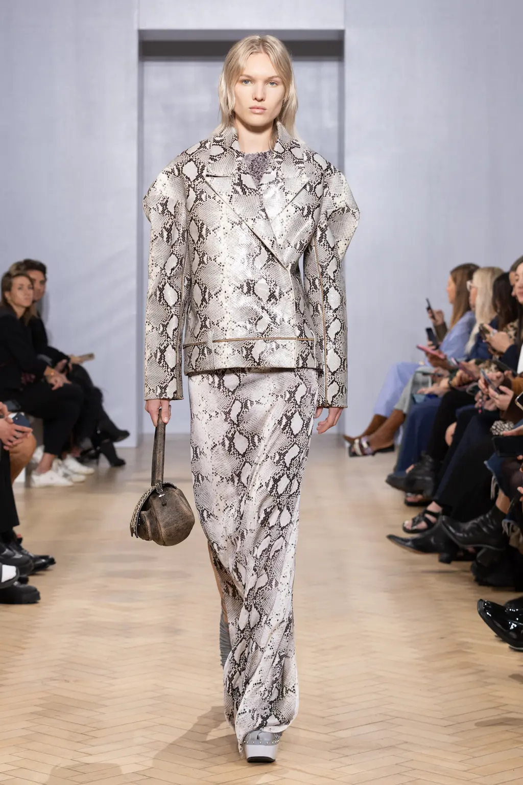 Since 2017, 16Arlington – founded by Marco Capaldo and the late Federica “Kikka” Cavenati – has curated a world of mornings after. Clothes that take you from the taxi to the party to the hazy conversations the next day. This season, the London-based brand presented a subversive take on power dressing: sharp shoulders, voluminous marabou coats and tough snakeskin prints on leather. And in its sensual mini dresses, satin coats and sequin embroideries, the brand retains its badge of honour as London’s go-to partywear. It’s clothes for making noise. The 16Arlington woman is never a wallflower – even with a hangover the next day. TJ