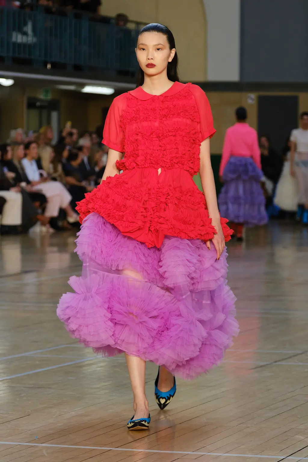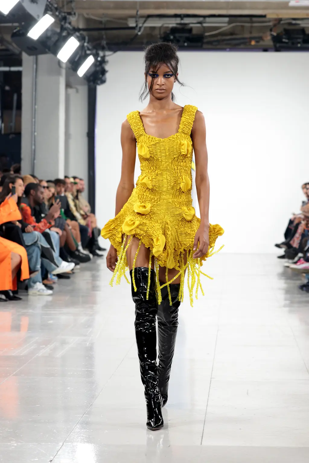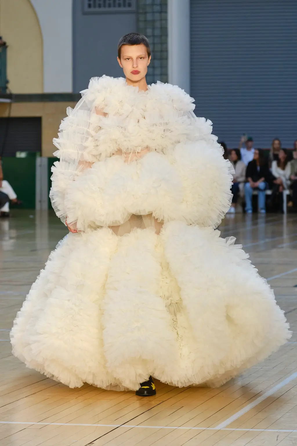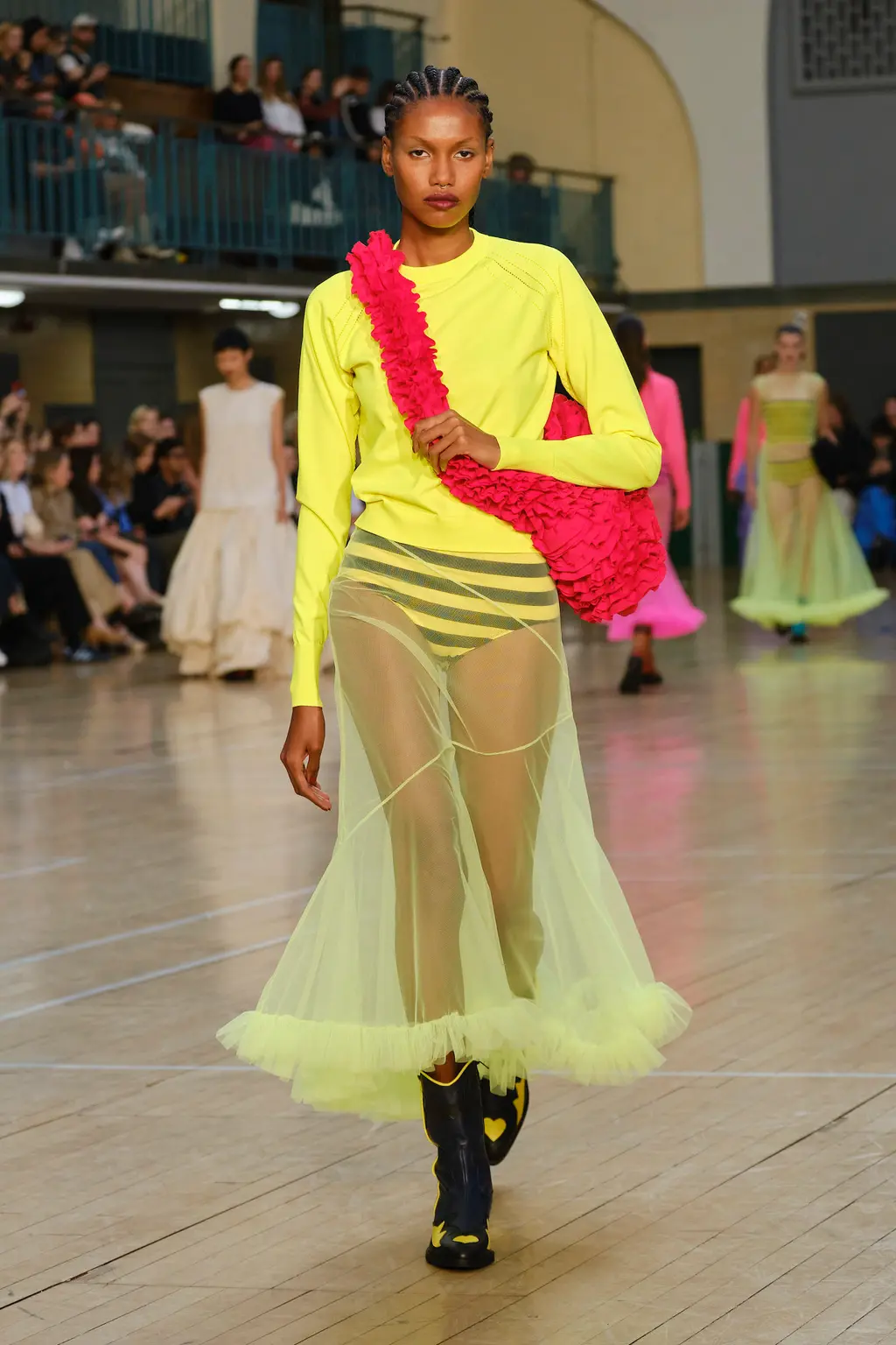 Molly Goddard returned to the Seymour Leisure Centre in West London for her SS23 show, first used in 2019 – a vast space that, for some, could swallow a garment whole. But not for Goddard, whose collection was spiked with feel-good hits of acid yellows, pinks and purples, and a brilliant, nostalgic house soundtrack which, set against the beaming sunshine from the rooftop window, was pure joy. And that’s one of the designer’s greatest strengths: bringing a sense of community, optimism and lightness. With models wearing cowboy boots and light Western touches on the cuts – as well as her signature maxed-out tulle pieces, this time in cloud-like white iterations – this season felt ecstatically freeing. Once again, Goddard invites us all to the dancefloor for a little light relief. TJ