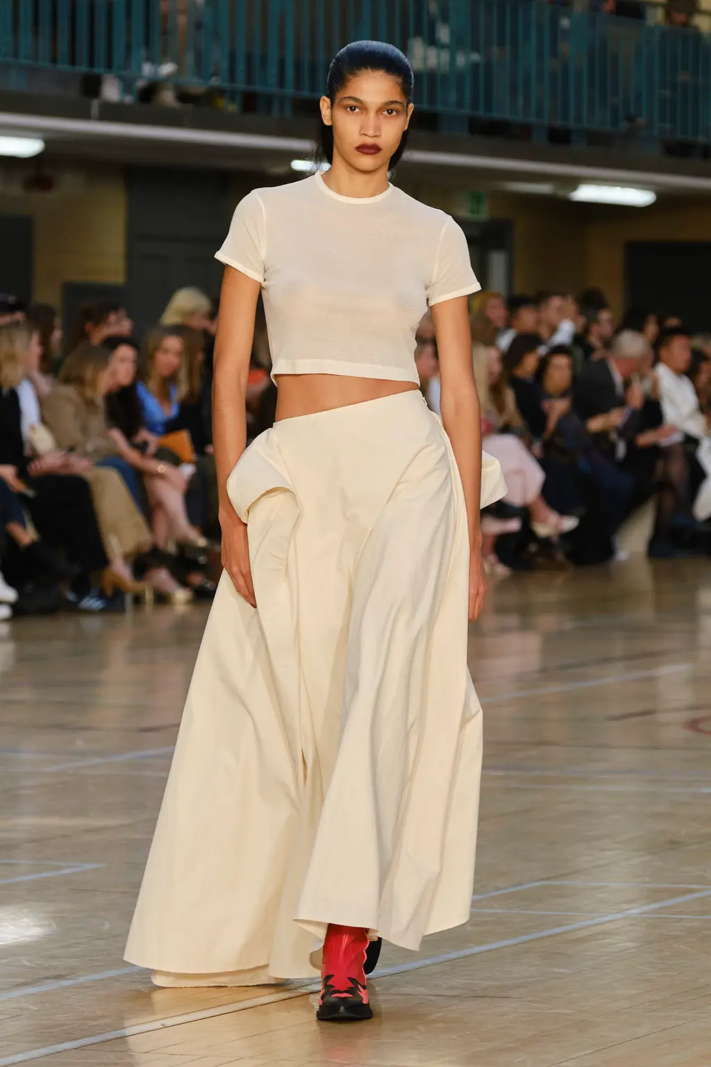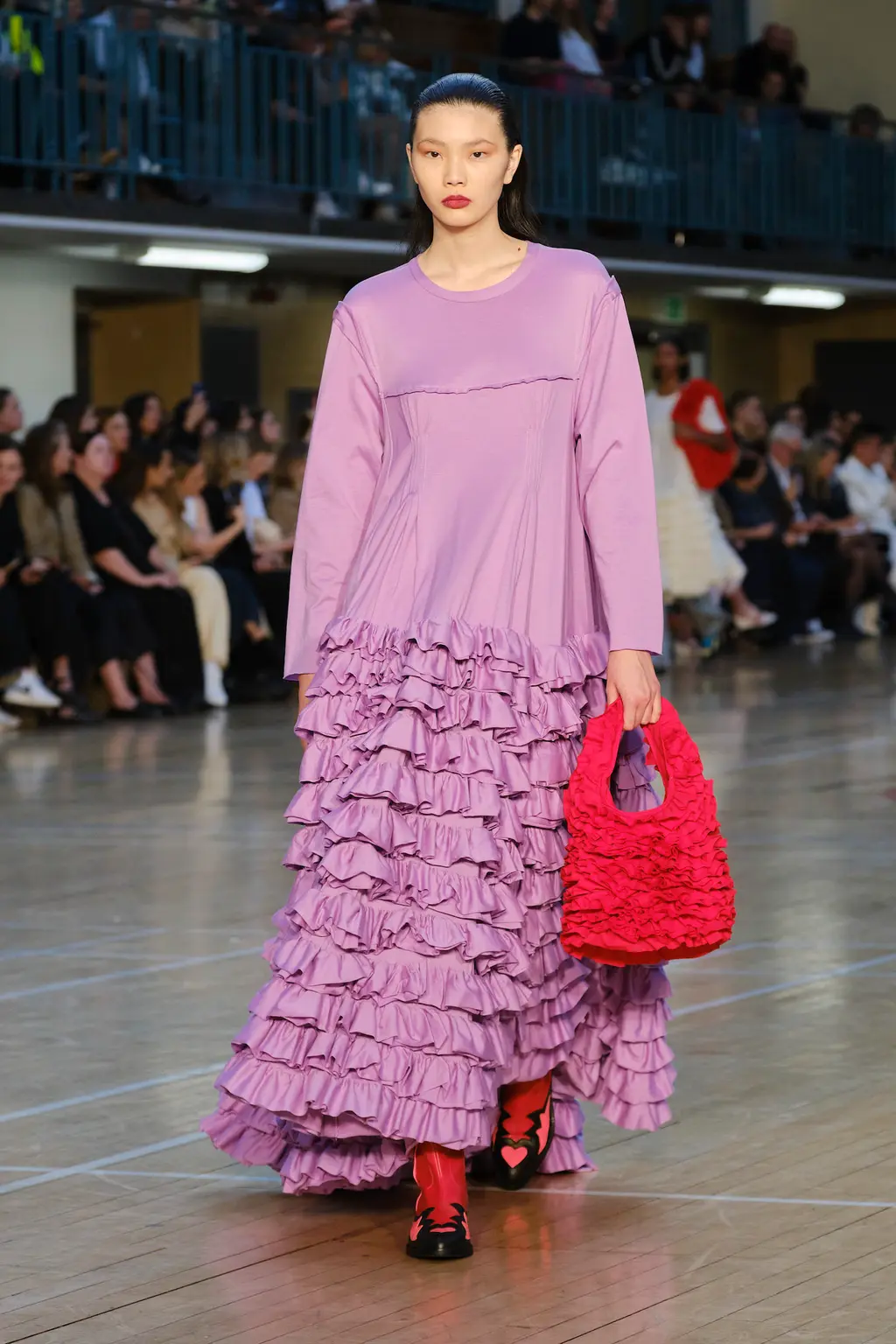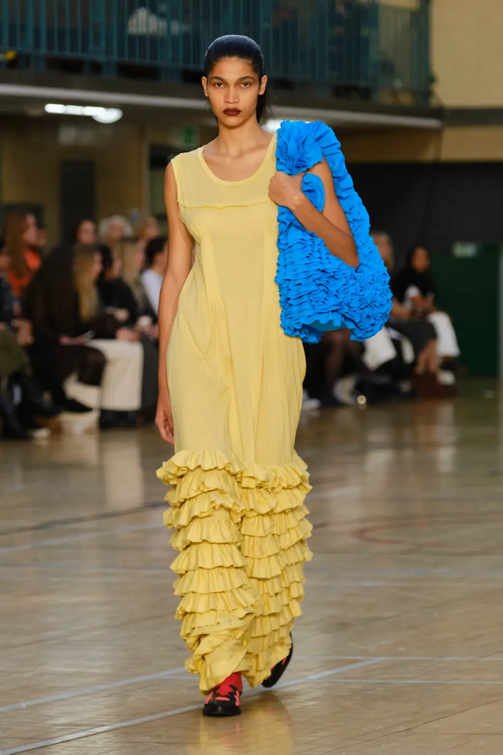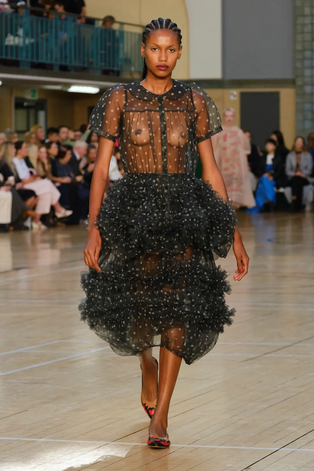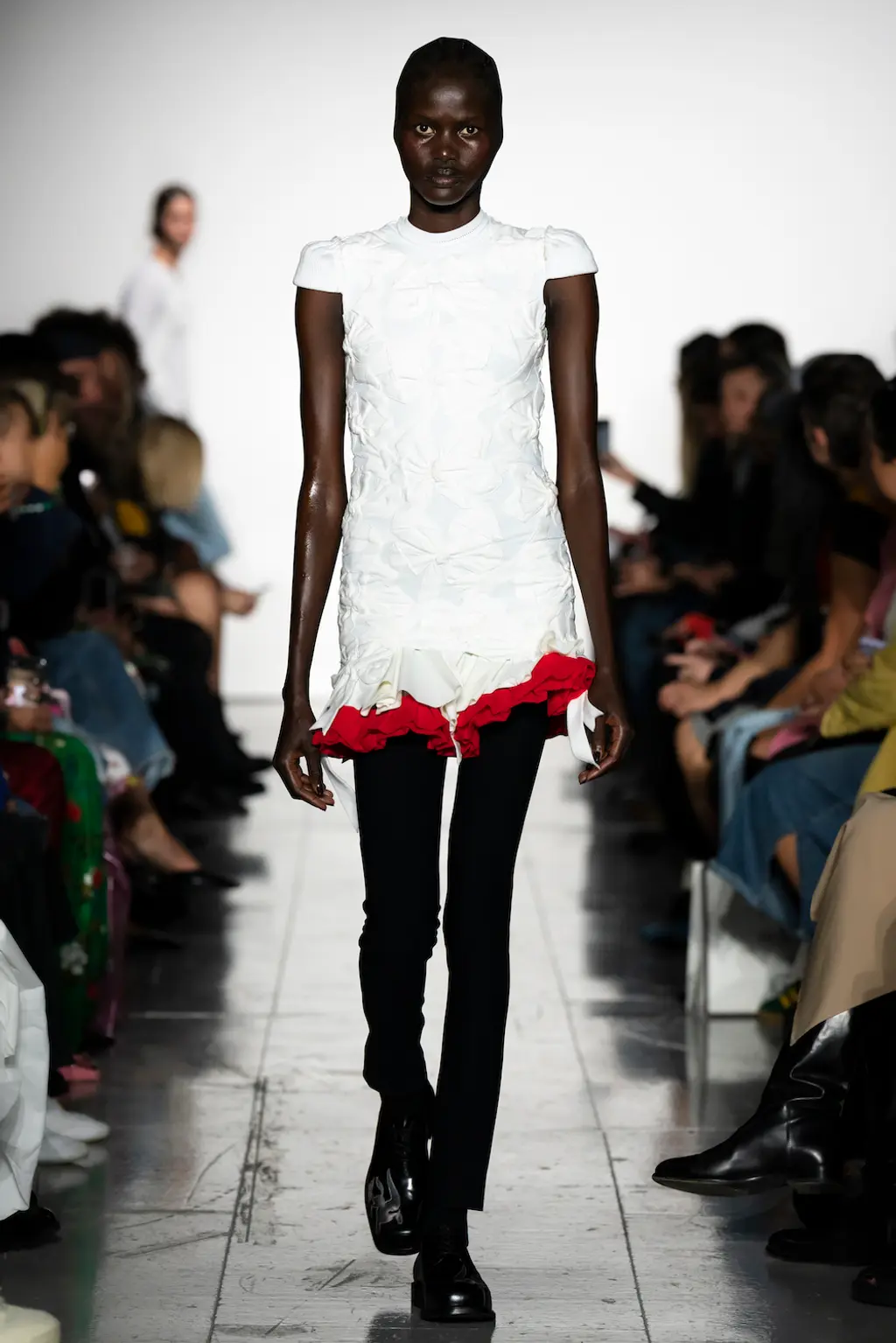 Molly Goddard returned to the Seymour Leisure Centre in West London for her SS23 show, first used in 2019 – a vast space that, for some, could swallow a garment whole. But not for Goddard, whose collection was spiked with feel-good hits of acid yellows, pinks and purples, and a brilliant, nostalgic house soundtrack which, set against the beaming sunshine from the rooftop window, was pure joy. And that’s one of the designer’s greatest strengths: bringing a sense of community, optimism and lightness. With models wearing cowboy boots and light Western touches on the cuts – as well as her signature maxed-out tulle pieces, this time in cloud-like white iterations – this season felt ecstatically freeing. Once again, Goddard invites us all to the dancefloor for a little light relief. TJ