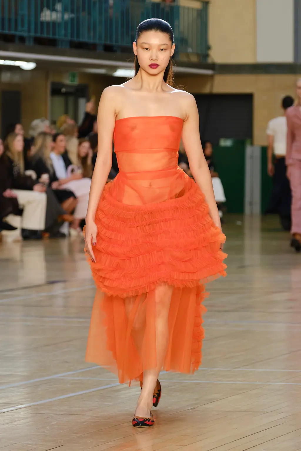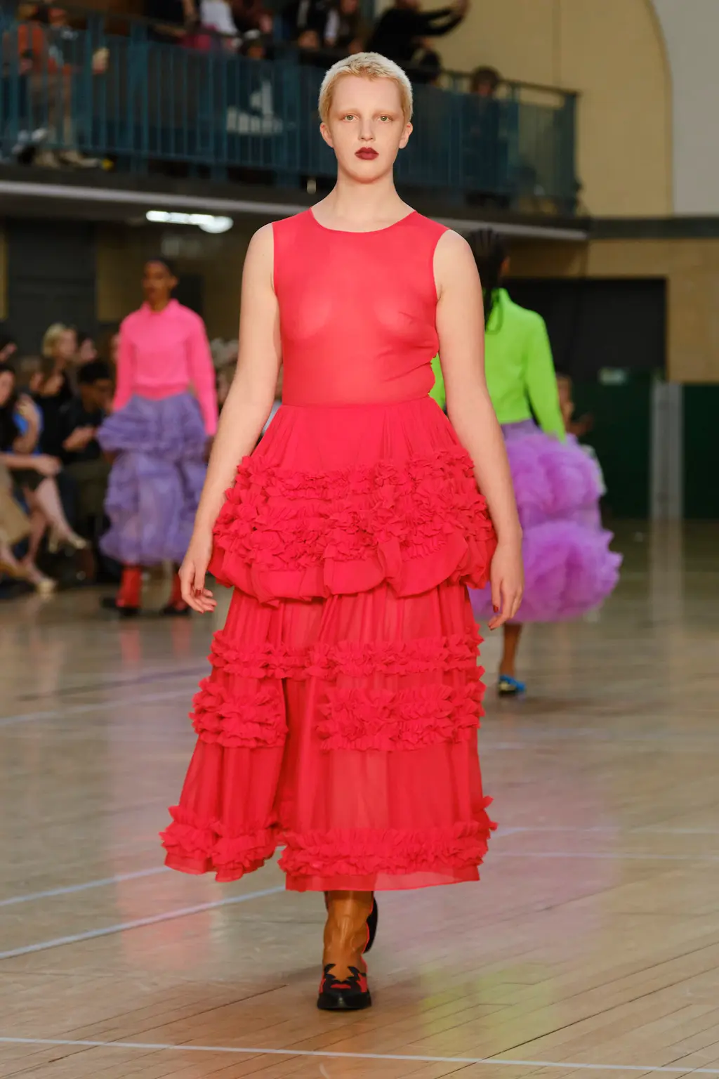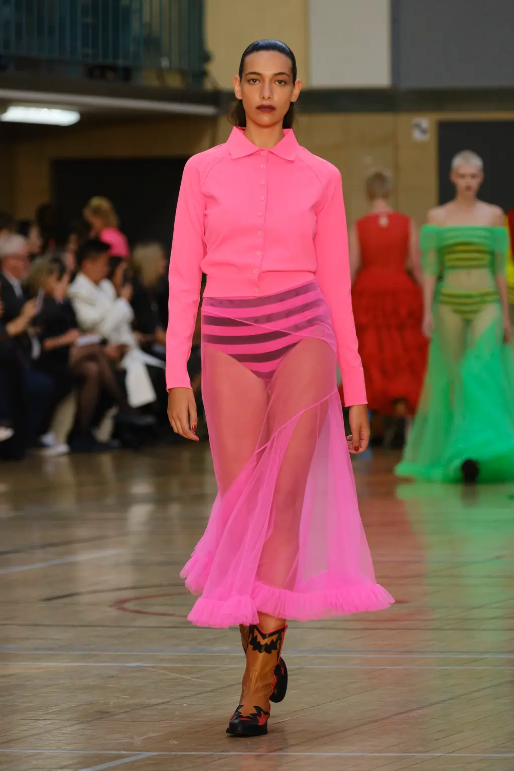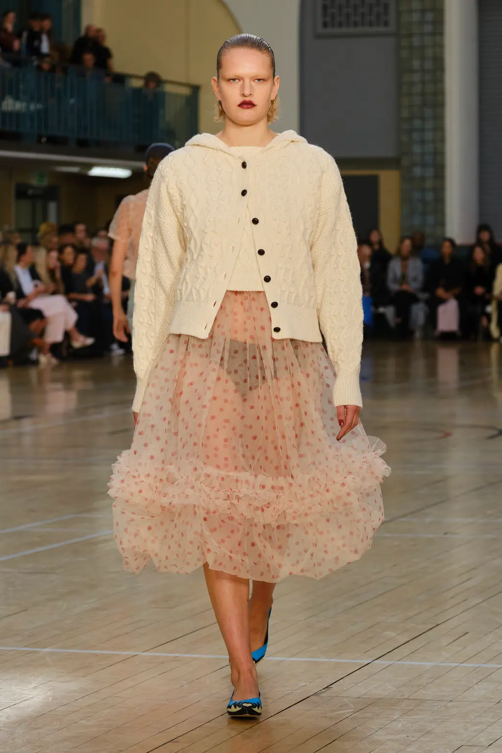 Molly Goddard returned to the Seymour Leisure Centre in West London for her SS23 show, first used in 2019 – a vast space that, for some, could swallow a garment whole. But not for Goddard, whose collection was spiked with feel-good hits of acid yellows, pinks and purples, and a brilliant, nostalgic house soundtrack which, set against the beaming sunshine from the rooftop window, was pure joy. And that’s one of the designer’s greatest strengths: bringing a sense of community, optimism and lightness. With models wearing cowboy boots and light Western touches on the cuts – as well as her signature maxed-out tulle pieces, this time in cloud-like white iterations – this season felt ecstatically freeing. Once again, Goddard invites us all to the dancefloor for a little light relief. TJ