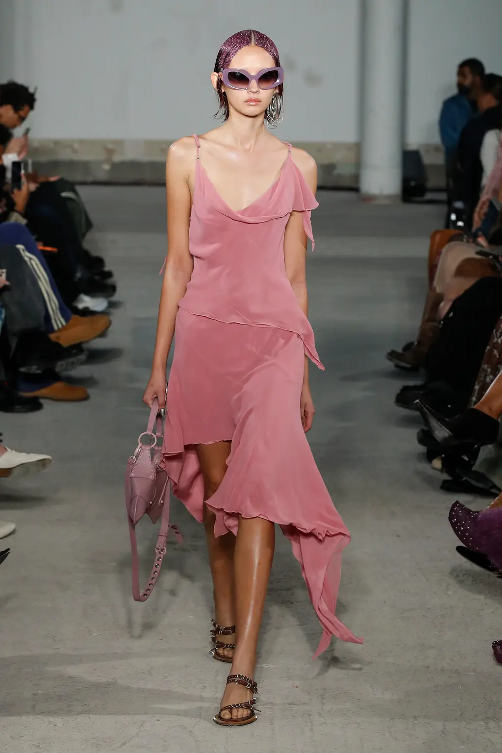These heavy duty ensembles were offset with a series of softer looks featuring delicate floral prints and floaty dresses in burnt peach and Pepto-Bismol pink chiffon, satin and buttery leather. The hair and make-up deserves a special mention, too: all intricately woven plaits, super-straight gelled sections and glitter-covered partings. BM