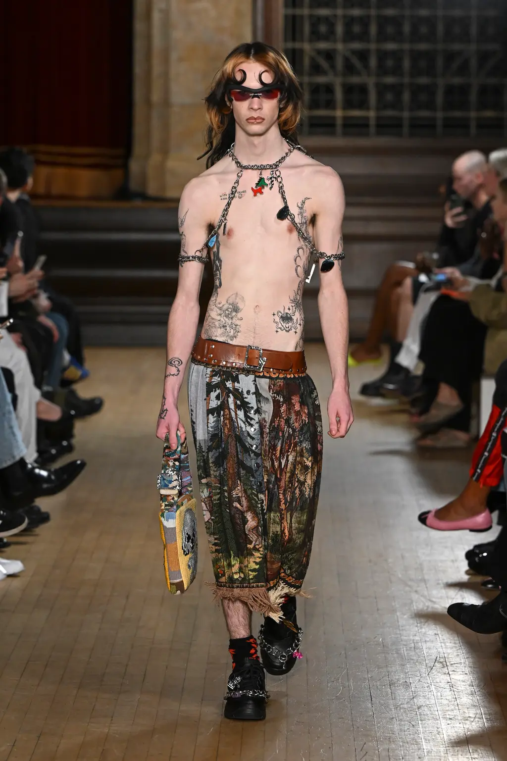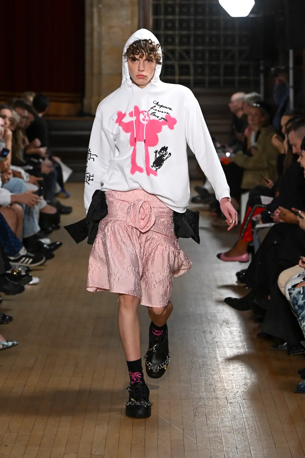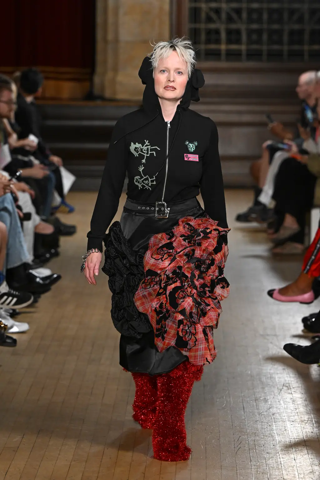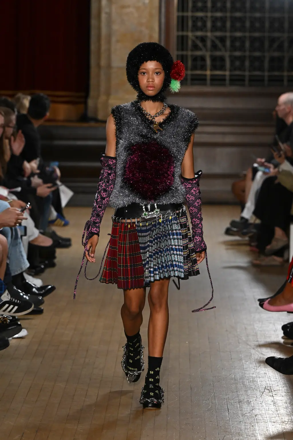 The pieces in the collection embraced both the strangeness of pageantry and the tackiness and tenderness of the tradition. There were signature kilts hung from leather belts, corsets crafted from traditional tapestries, screen-printed T‑shirts, floral-printed denim, tinsel cardigans, chunky cartoon charm necklaces, cheerleader pom-pom boots and smock dresses patchworked from mismatched prints.