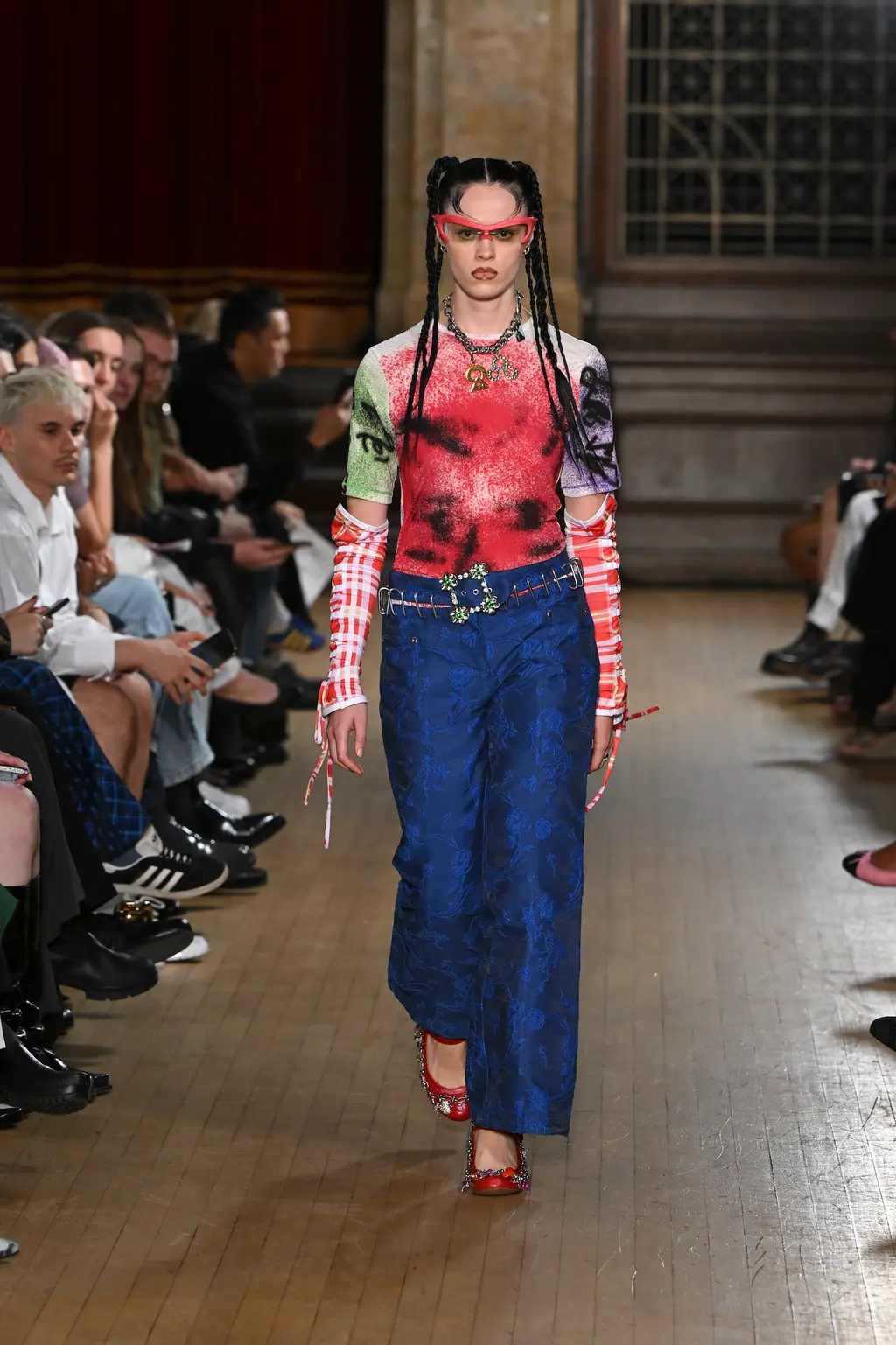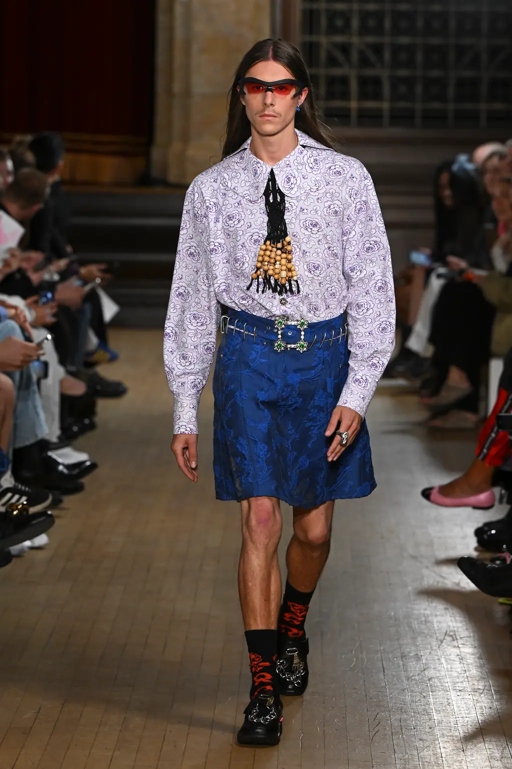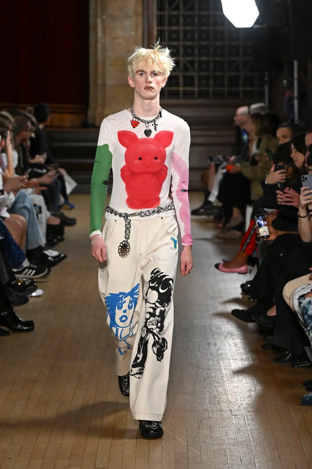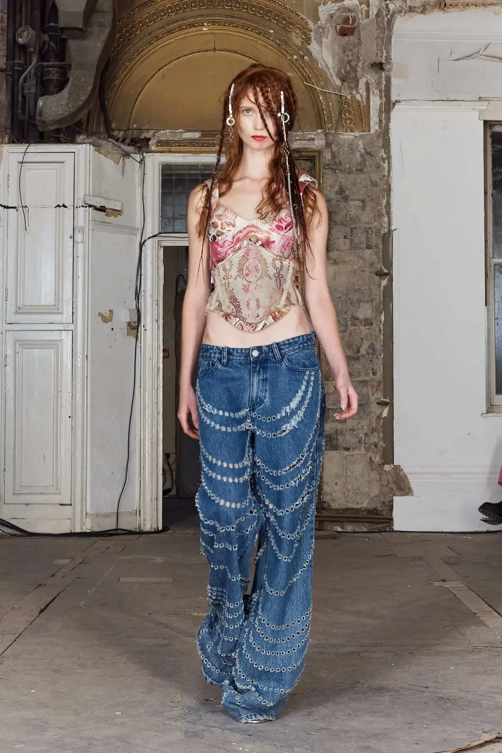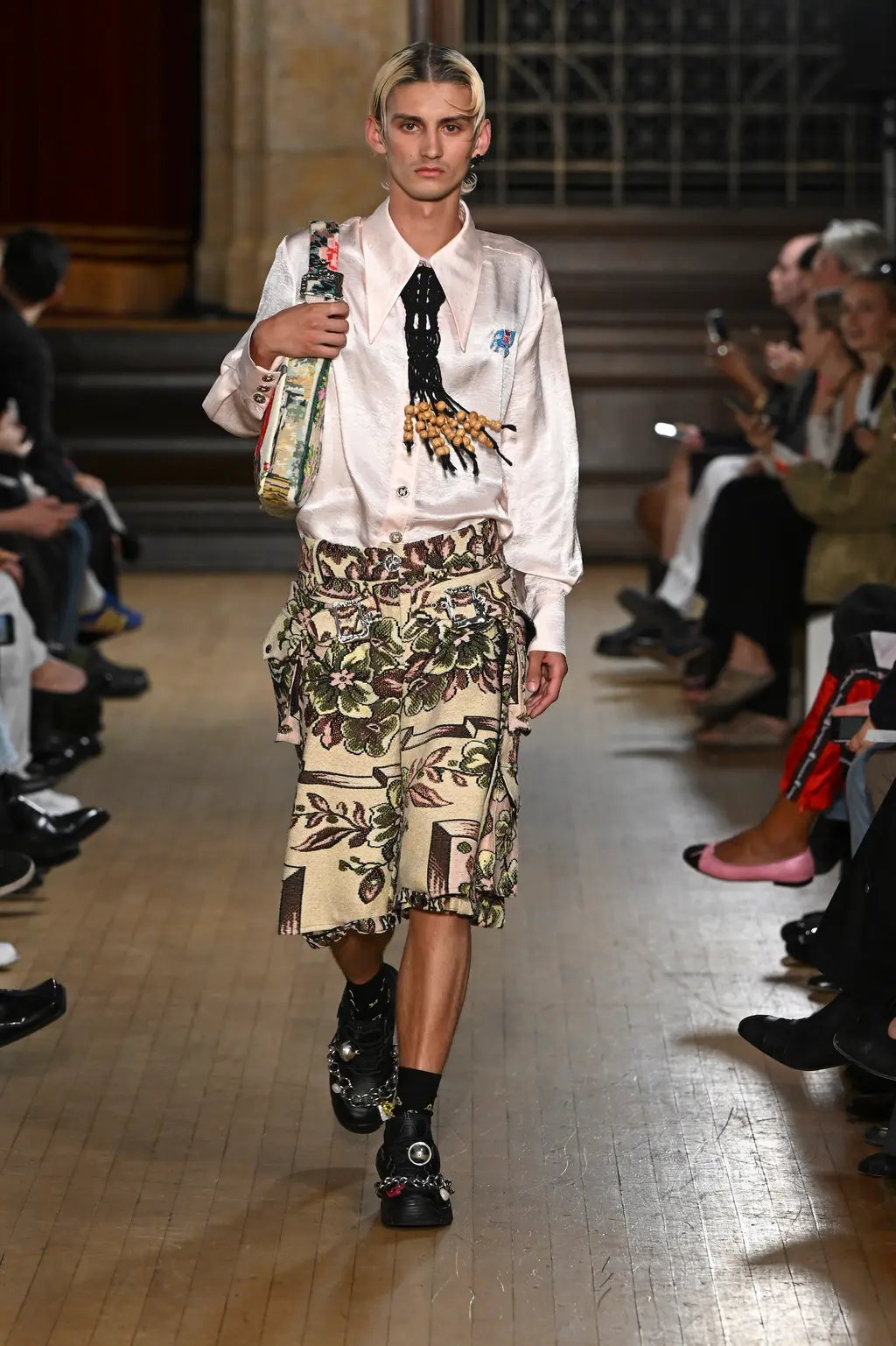 The pieces in the collection embraced both the strangeness of pageantry and the tackiness and tenderness of the tradition. There were signature kilts hung from leather belts, corsets crafted from traditional tapestries, screen-printed T‑shirts, floral-printed denim, tinsel cardigans, chunky cartoon charm necklaces, cheerleader pom-pom boots and smock dresses patchworked from mismatched prints.