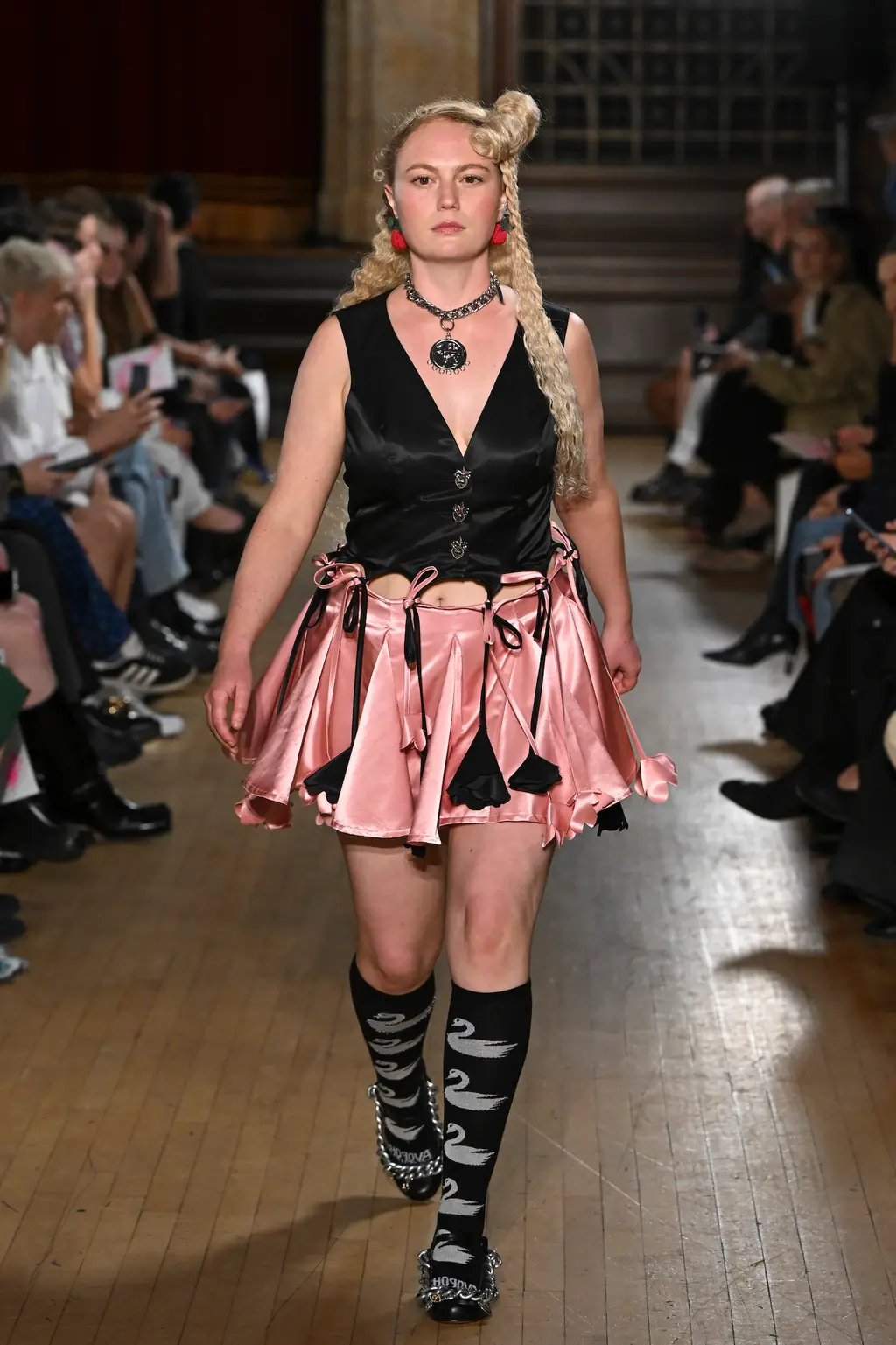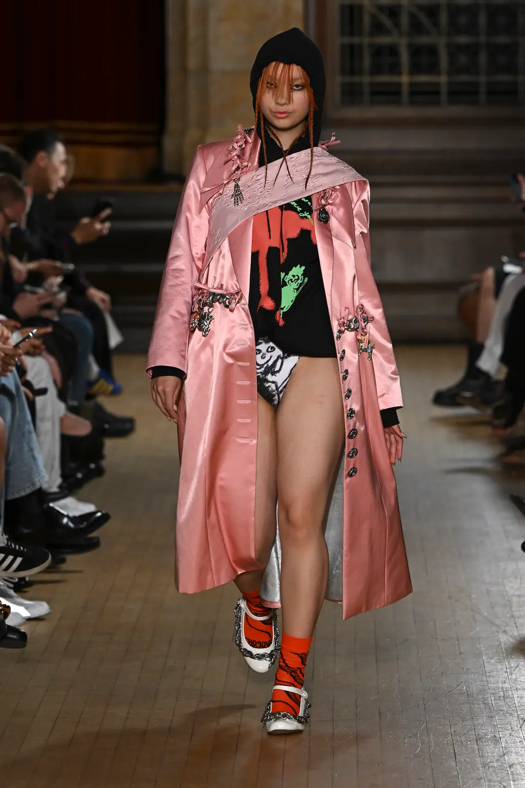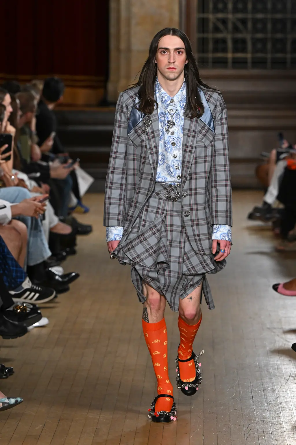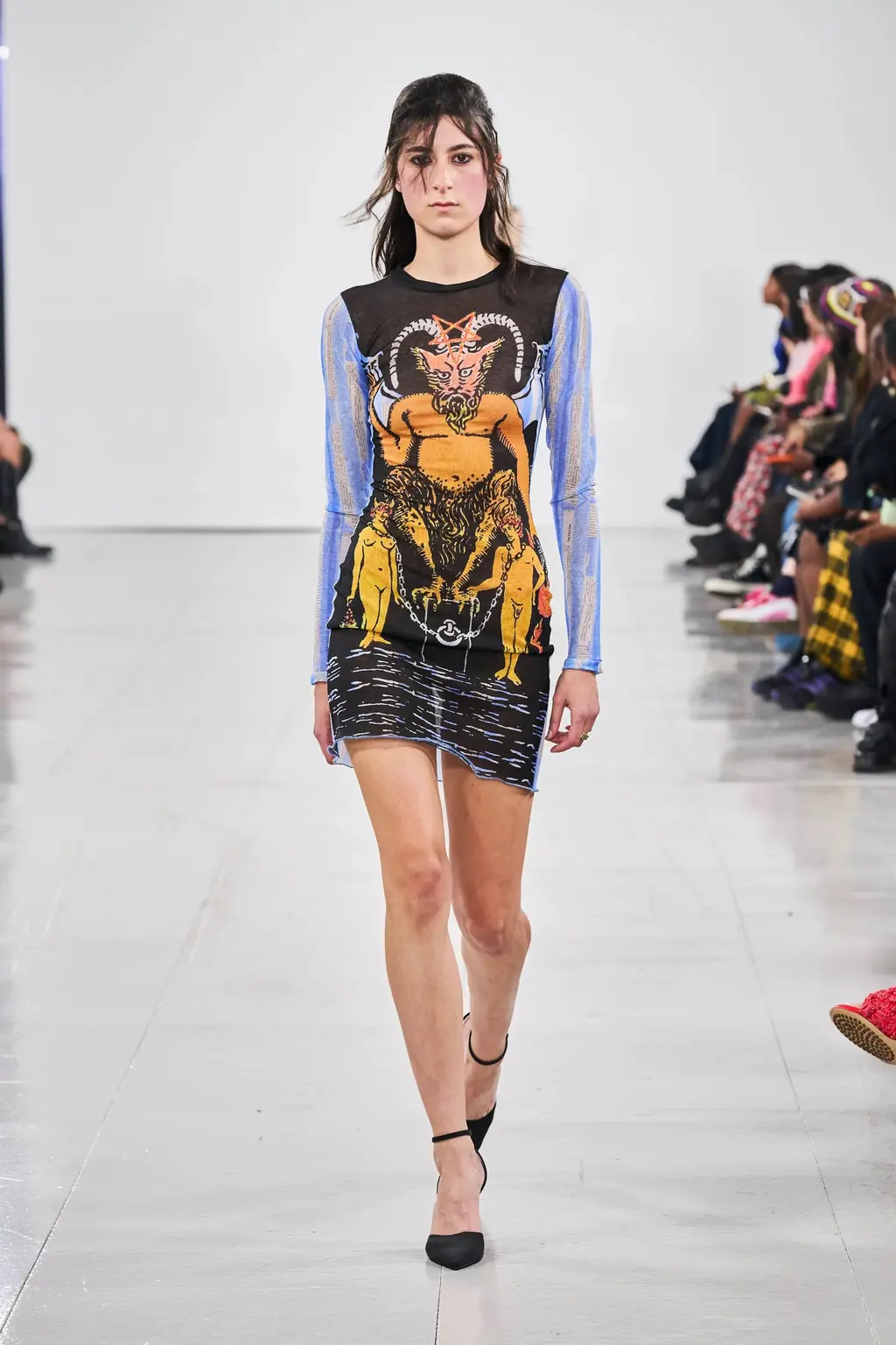 The pieces in the collection embraced both the strangeness of pageantry and the tackiness and tenderness of the tradition. There were signature kilts hung from leather belts, corsets crafted from traditional tapestries, screen-printed T‑shirts, floral-printed denim, tinsel cardigans, chunky cartoon charm necklaces, cheerleader pom-pom boots and smock dresses patchworked from mismatched prints.