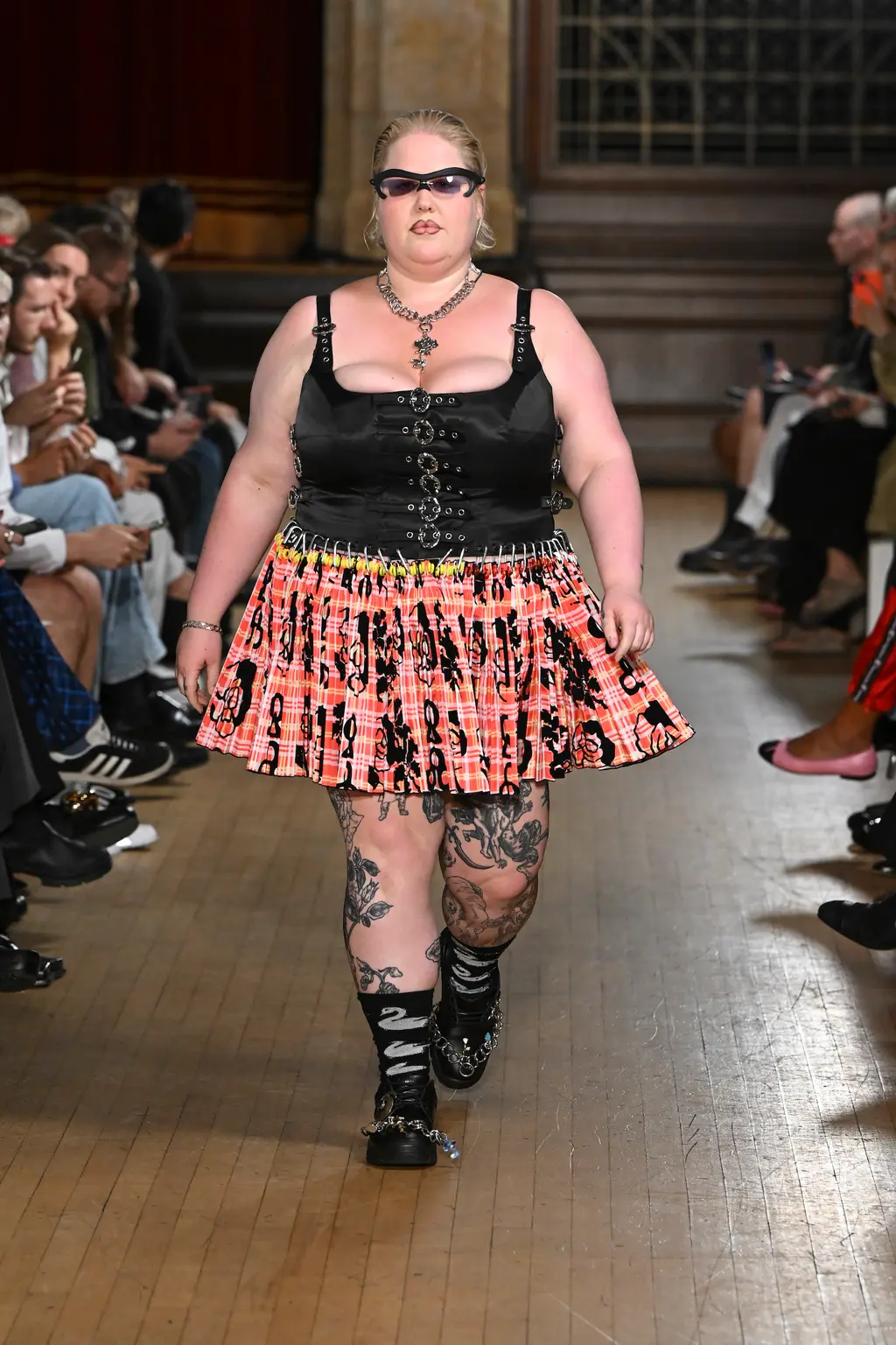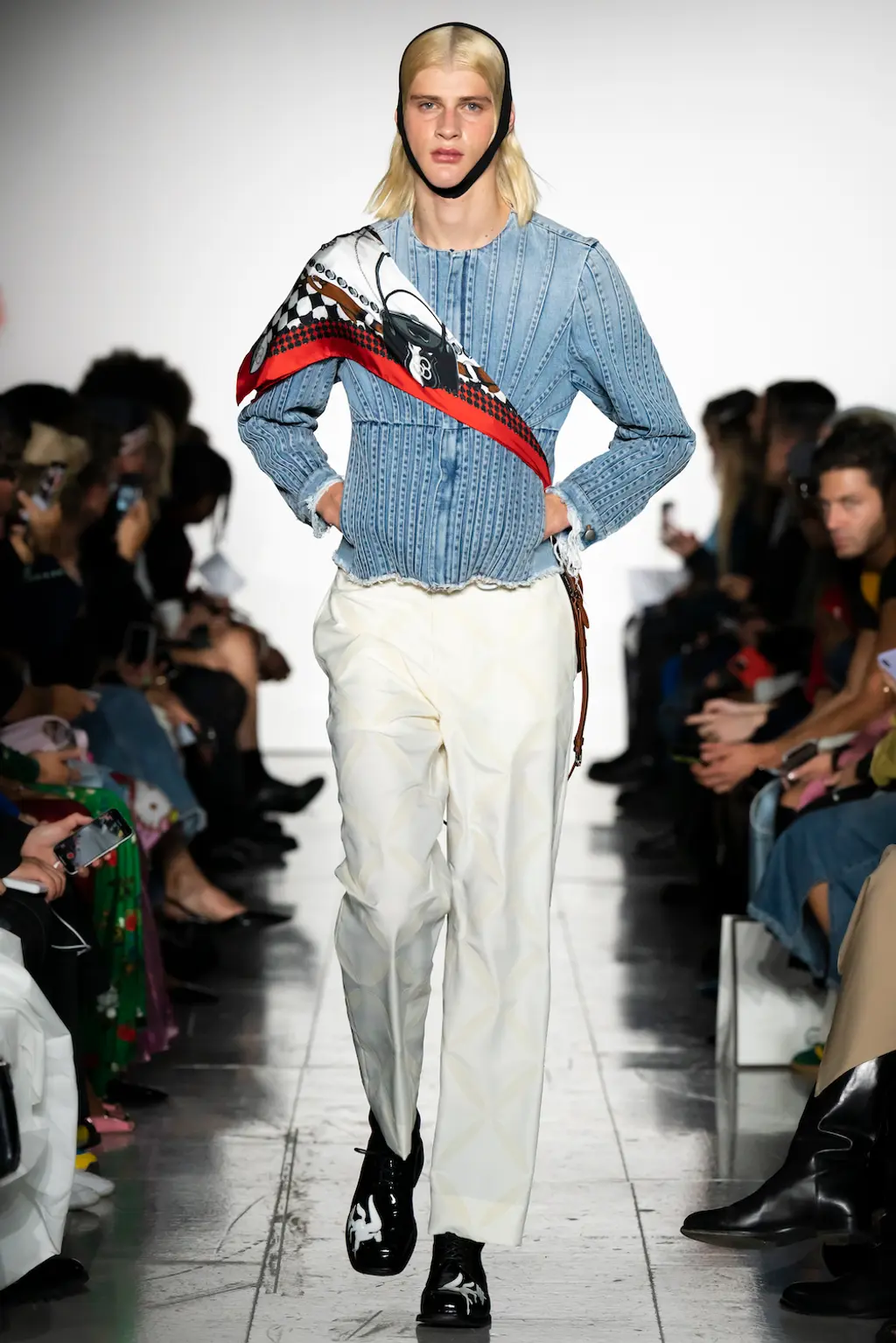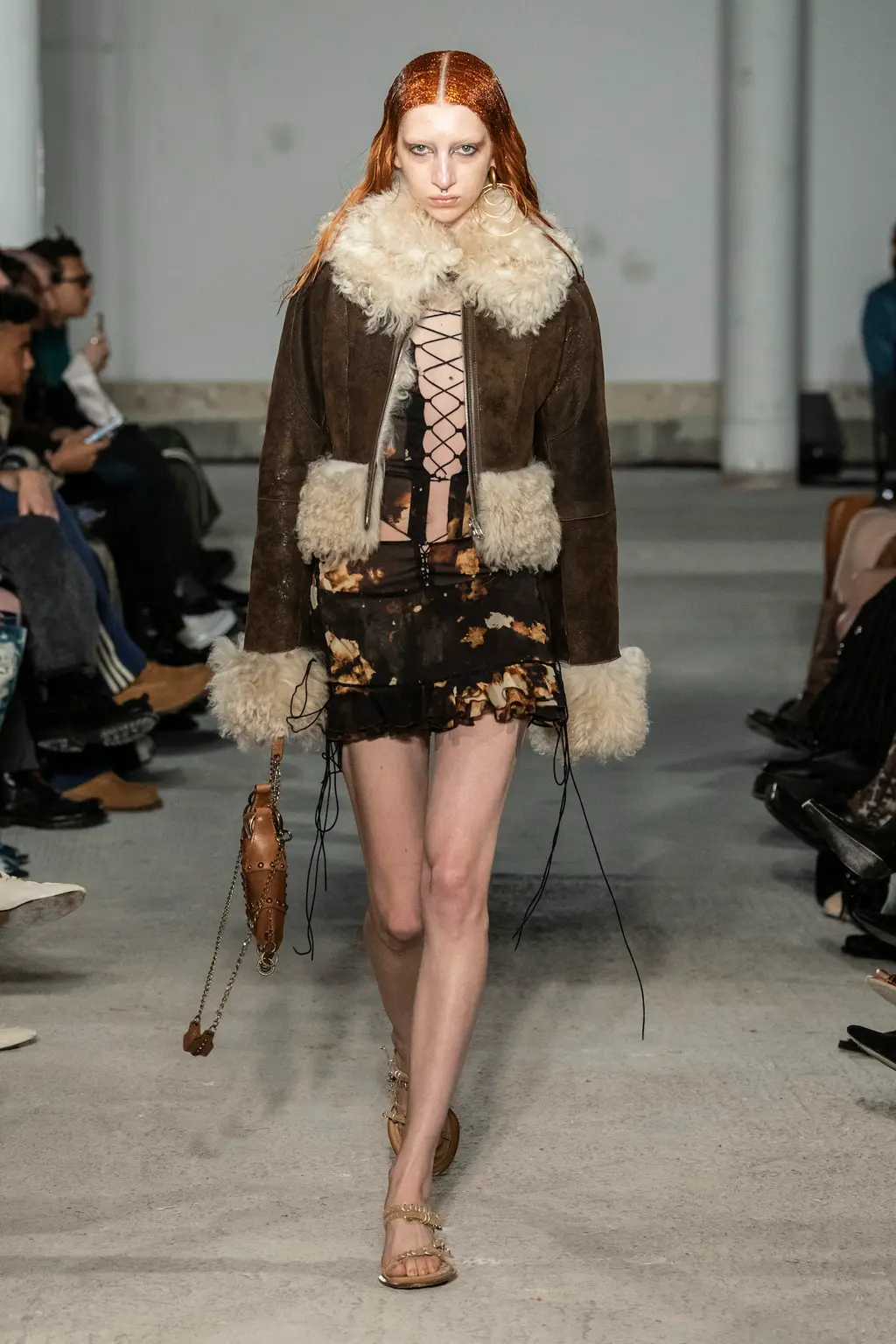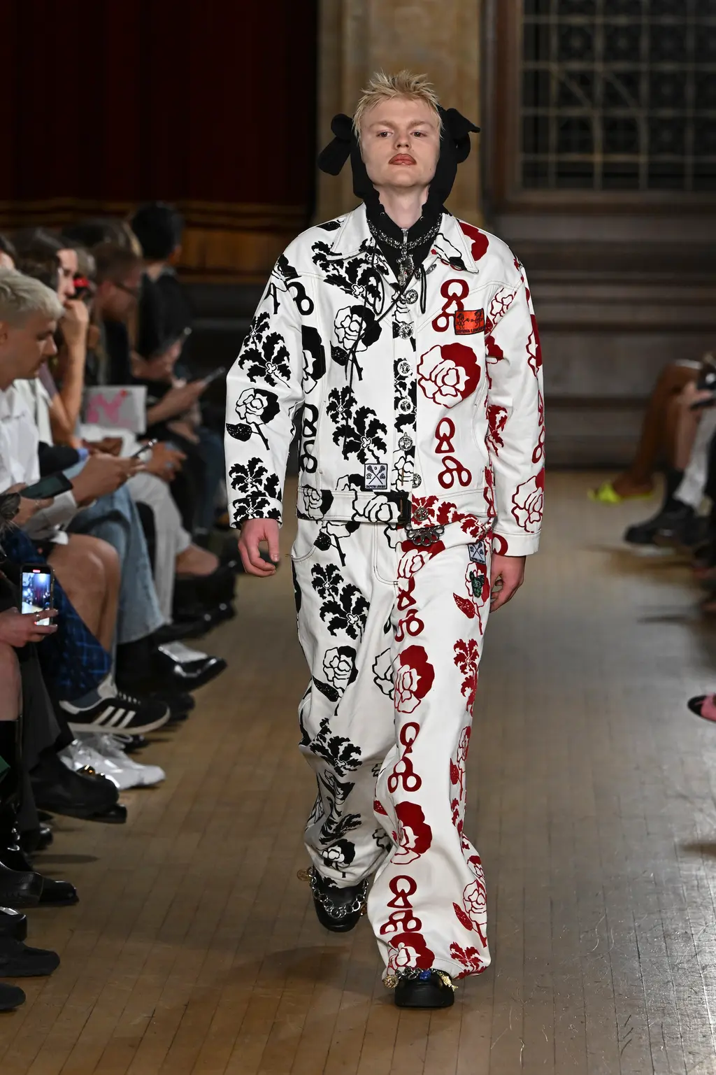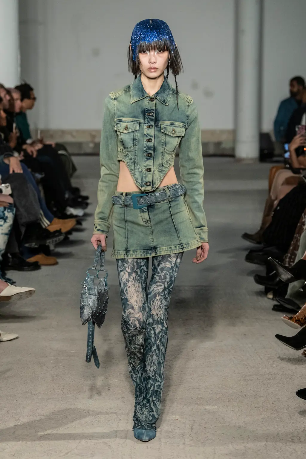 The pieces in the collection embraced both the strangeness of pageantry and the tackiness and tenderness of the tradition. There were signature kilts hung from leather belts, corsets crafted from traditional tapestries, screen-printed T‑shirts, floral-printed denim, tinsel cardigans, chunky cartoon charm necklaces, cheerleader pom-pom boots and smock dresses patchworked from mismatched prints.