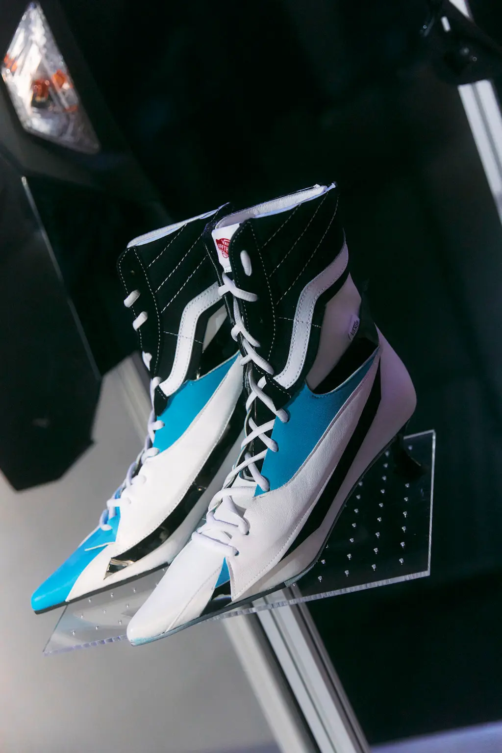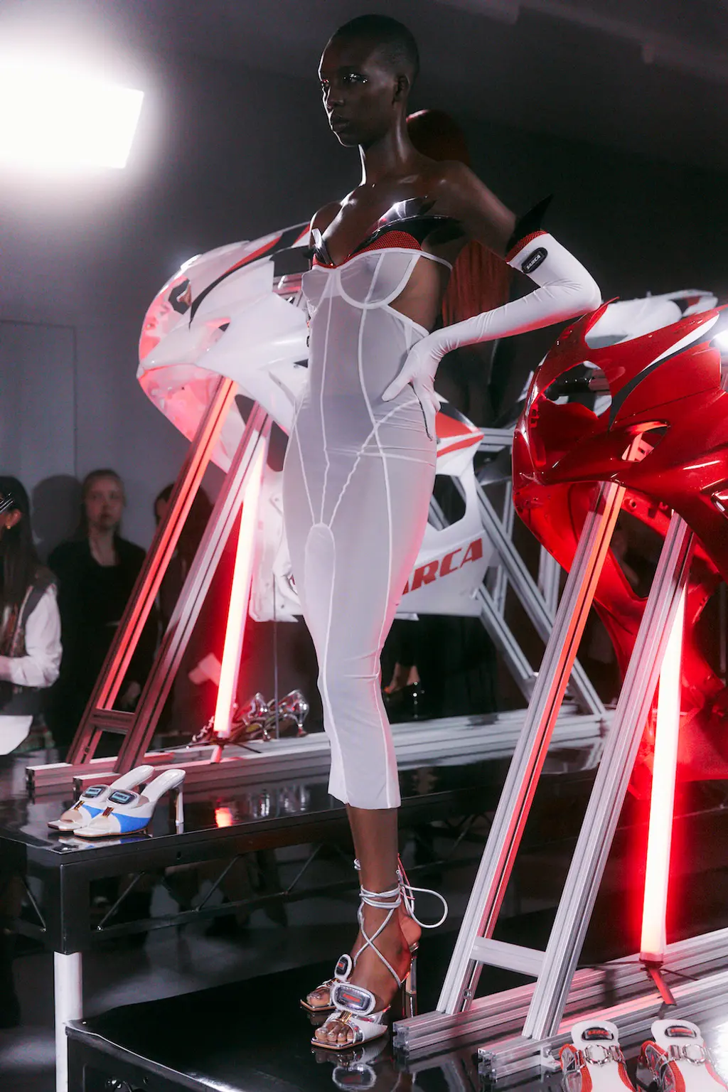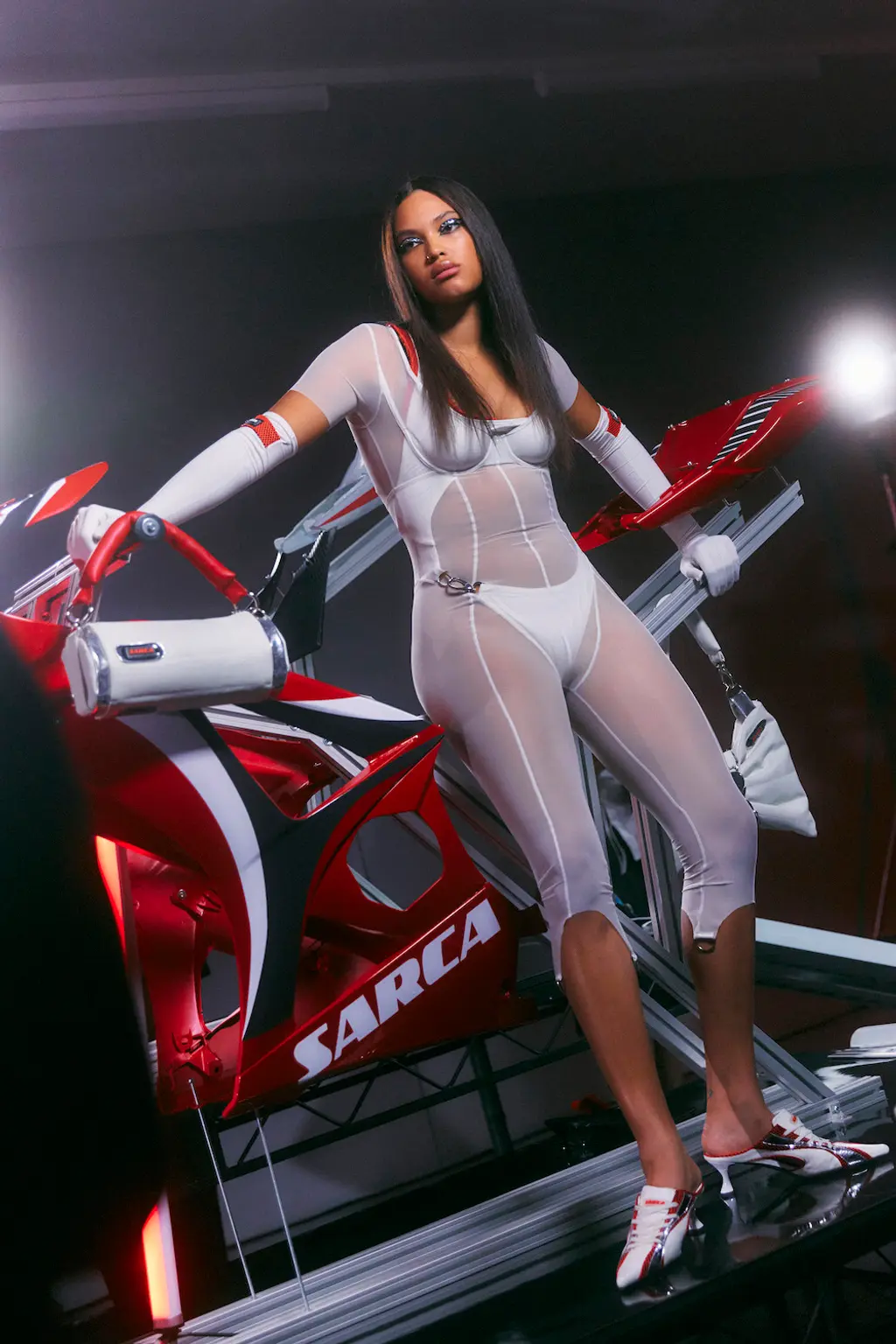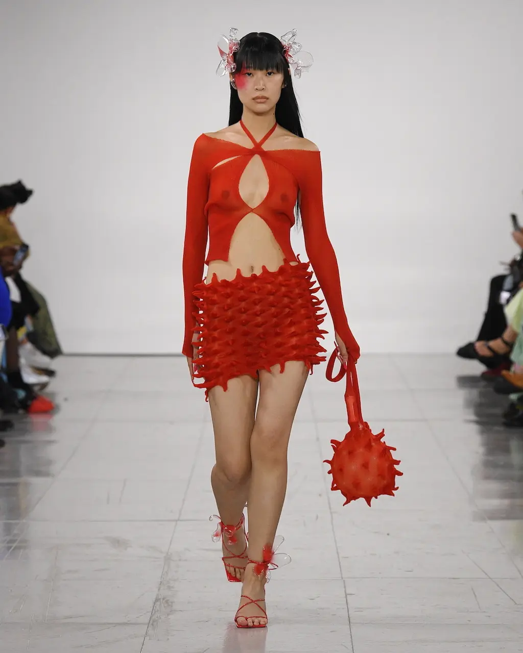 Since her time as part of Fashion East’s line-up in 2019, Romanian footwear designer Ancuta Sarca has subverted the way we see sustainability in fashion: it can be sexy, glamorous and, as she’s proven, extremely popular. This season, Sarca referenced Formula 1 cars, retaining the athleticism of her past designs (she’s often played around with upcycled Nike trainers), but elevating it for designs altogether new: strappy mules, unisex clogs and devilish knee-high black and red ombre boots referencing the smoothness of hosed-down racecar body. As well for SS23, Sarca introduced bags made out of repurposed wigs – a merit to the designer’s ingenious take on repurposing. Partnering with both Vans and SKIMS, Sarca’s collection feels riotous and, as her F1 influences would suggest, turbo-fuelled. TJ