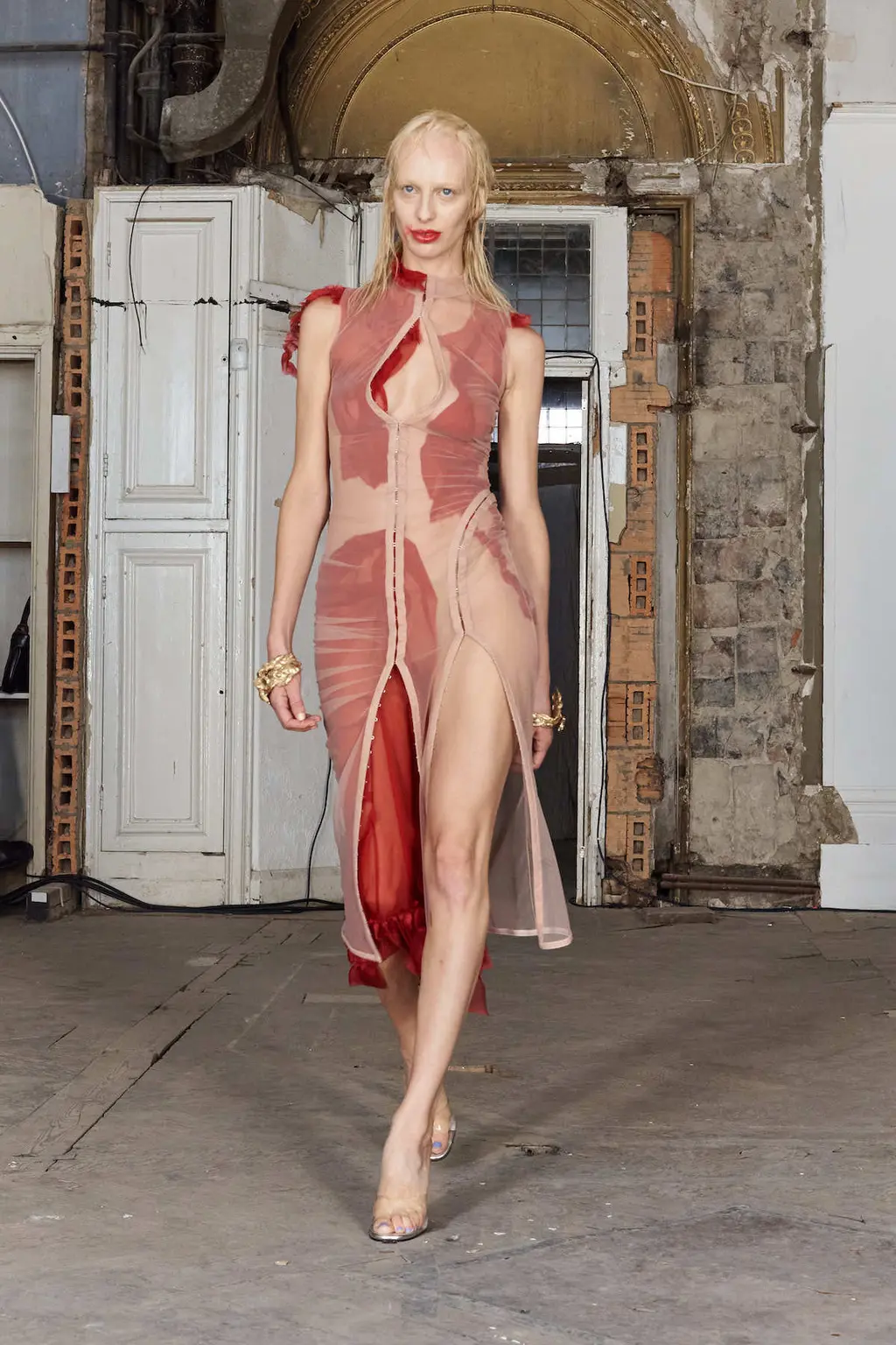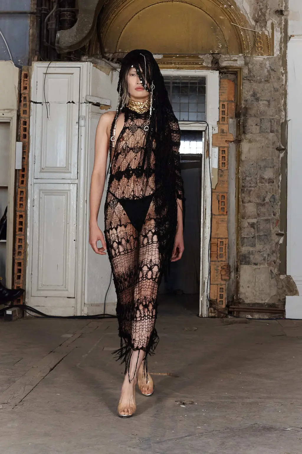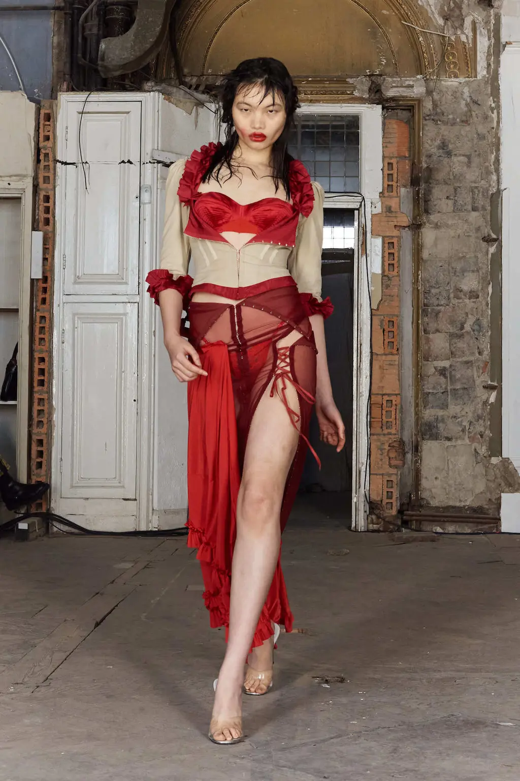 In a crumbling building in West London, her show featured no music – a knife-edge backdrop for a collection which delved into the designer’s antique treasure chest of subversive references: religion, sex, death and horror – as well as her past and present lives.