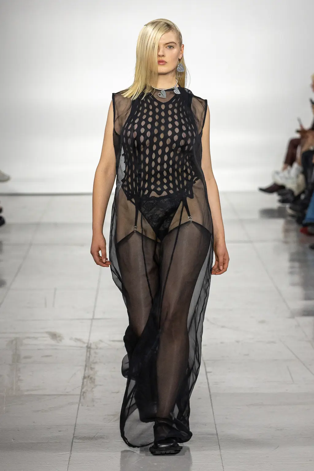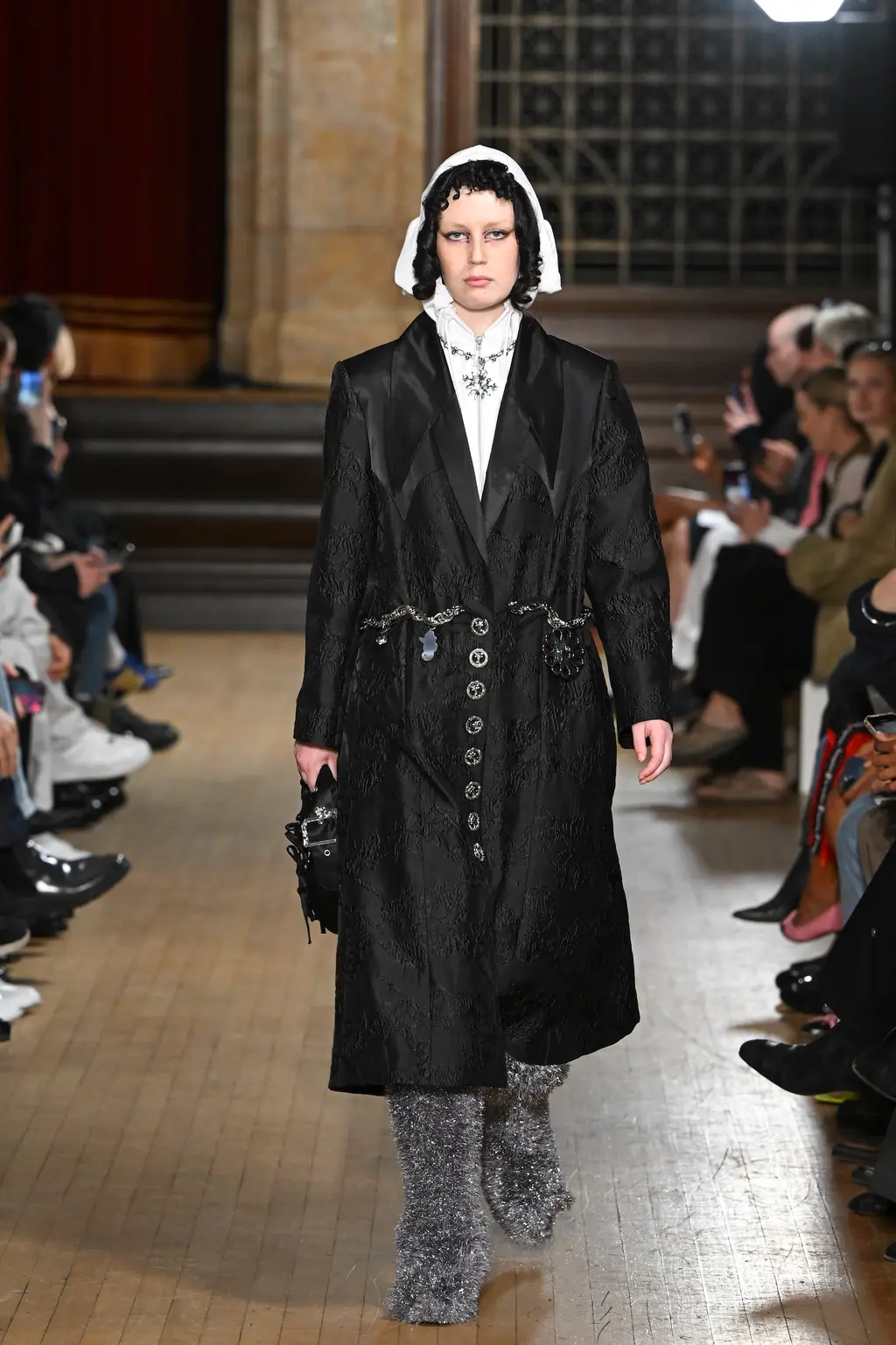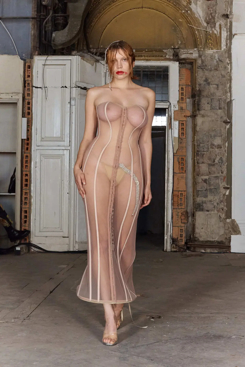 In a crumbling building in West London, her show featured no music – a knife-edge backdrop for a collection which delved into the designer’s antique treasure chest of subversive references: religion, sex, death and horror – as well as her past and present lives.
