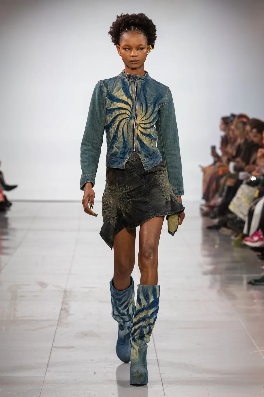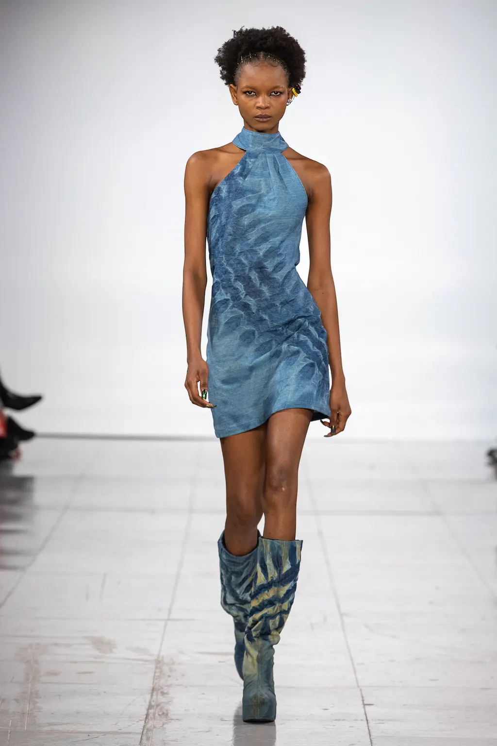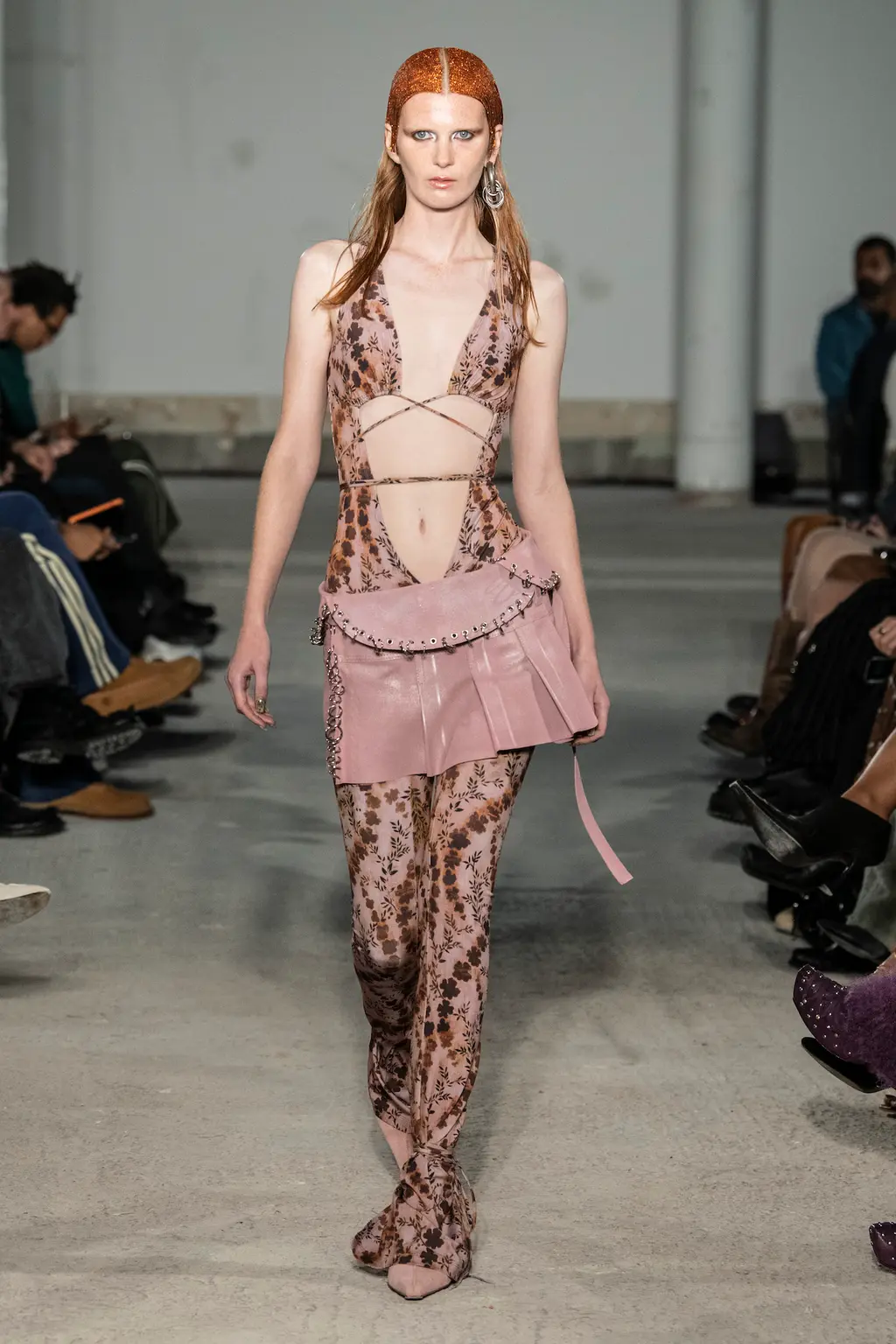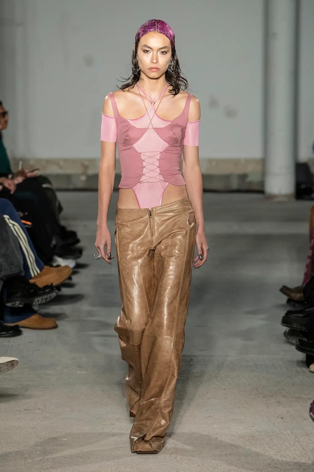 The KNWLS staples were all present and correct – a uniform of printed Lycra tops, zig-zag-laced layers and hip-hugging pants – alongside a series of stand-out statement looks crafted from distressed leather and dip-dyed denim.