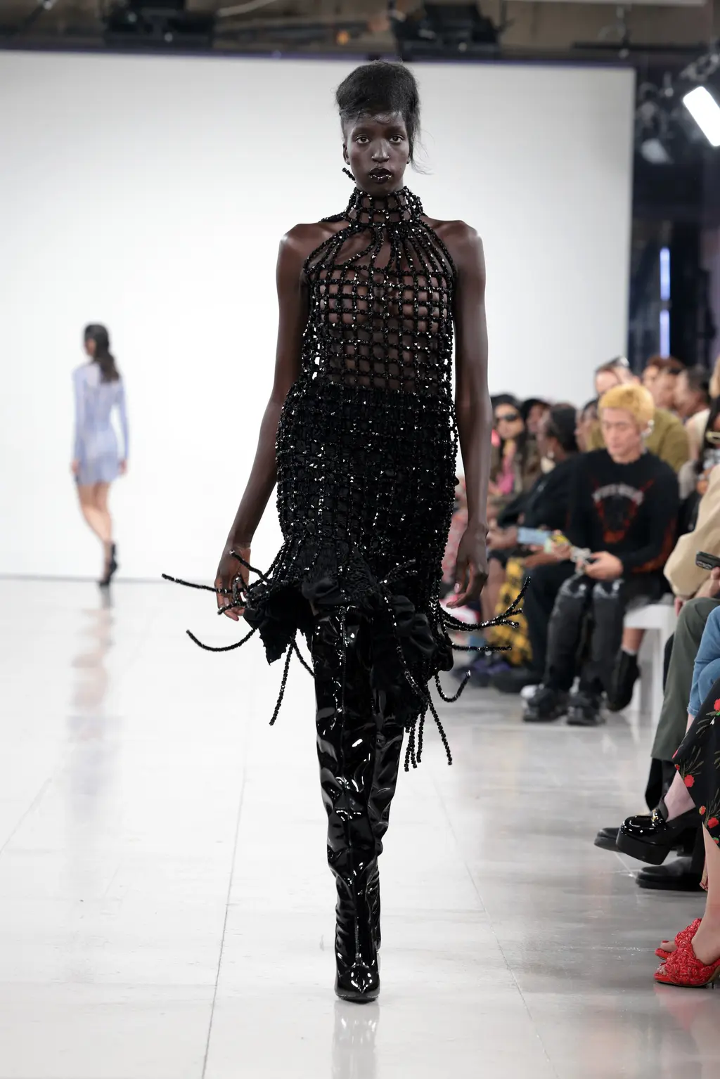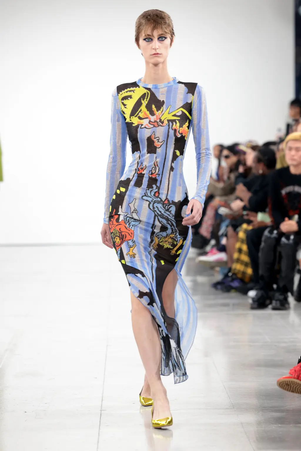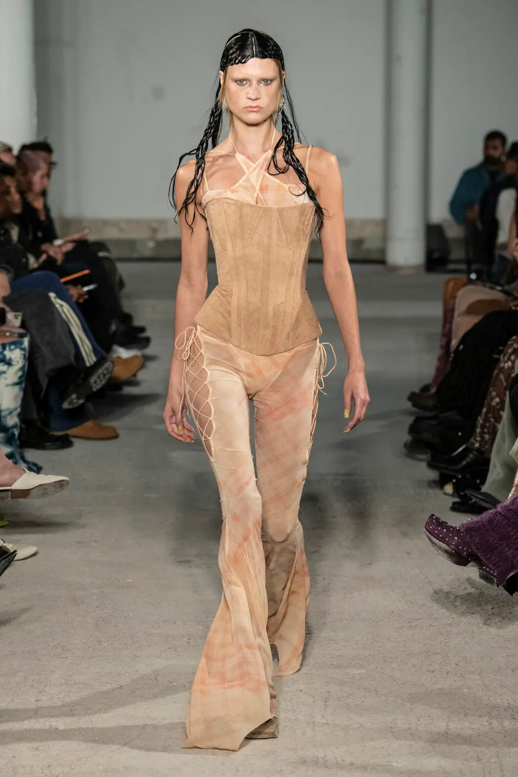 The KNWLS staples were all present and correct – a uniform of printed Lycra tops, zig-zag-laced layers and hip-hugging pants – alongside a series of stand-out statement looks crafted from distressed leather and dip-dyed denim.