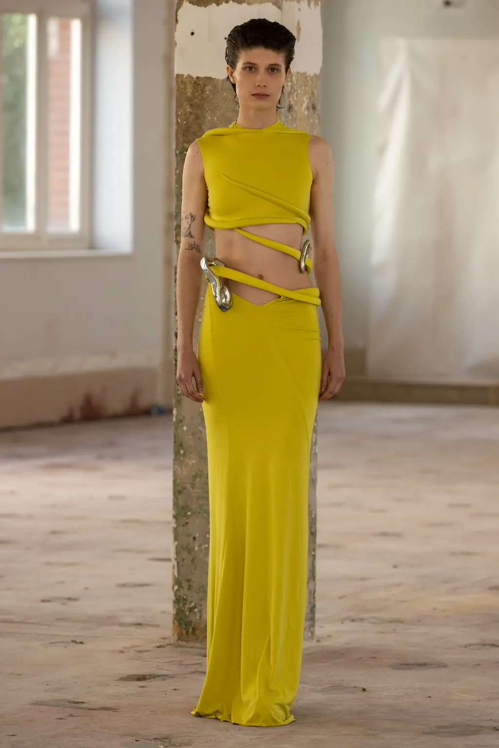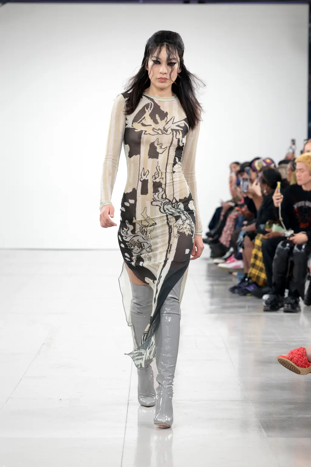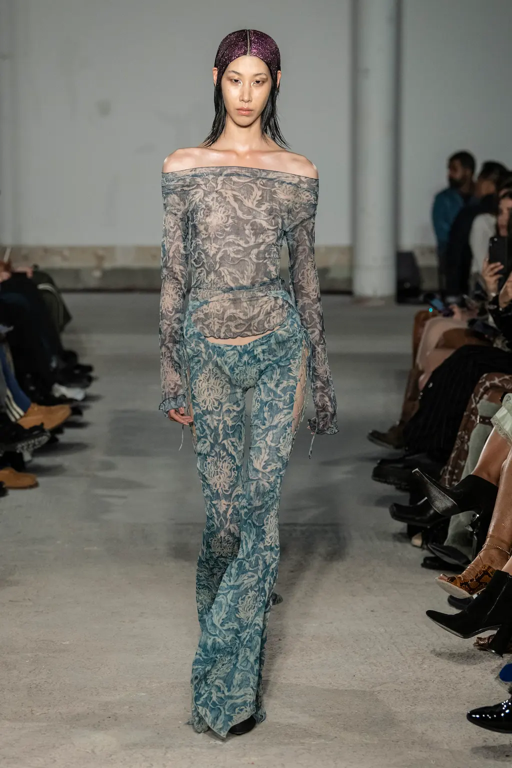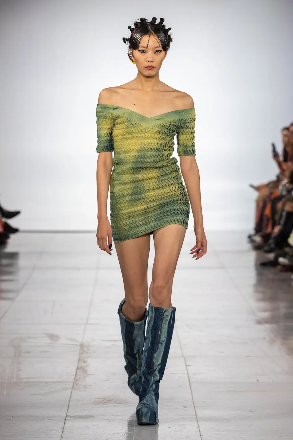 The KNWLS staples were all present and correct – a uniform of printed Lycra tops, zig-zag-laced layers and hip-hugging pants – alongside a series of stand-out statement looks crafted from distressed leather and dip-dyed denim.