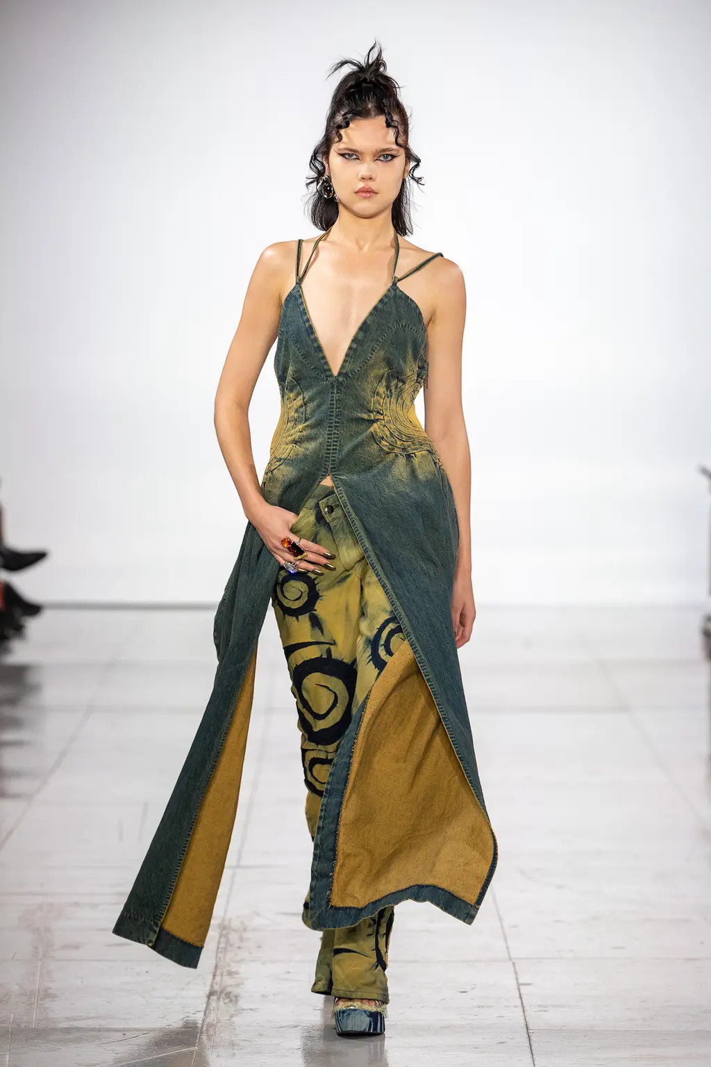 Only a few collections in, the Ukrainian designer, who graduated from Central Saint Martins in 2018 and has interned at Maison Margiela, has become synonymous for her high-octane optimism: flared jeans, thong detailing and denim maxi skirts are like a shot of healthy nostalgia. But she retains a killer attitude in tyre-mark graphics, monster platform boots and care-free low-rise cuts. As resilient as it is sexy. TJ