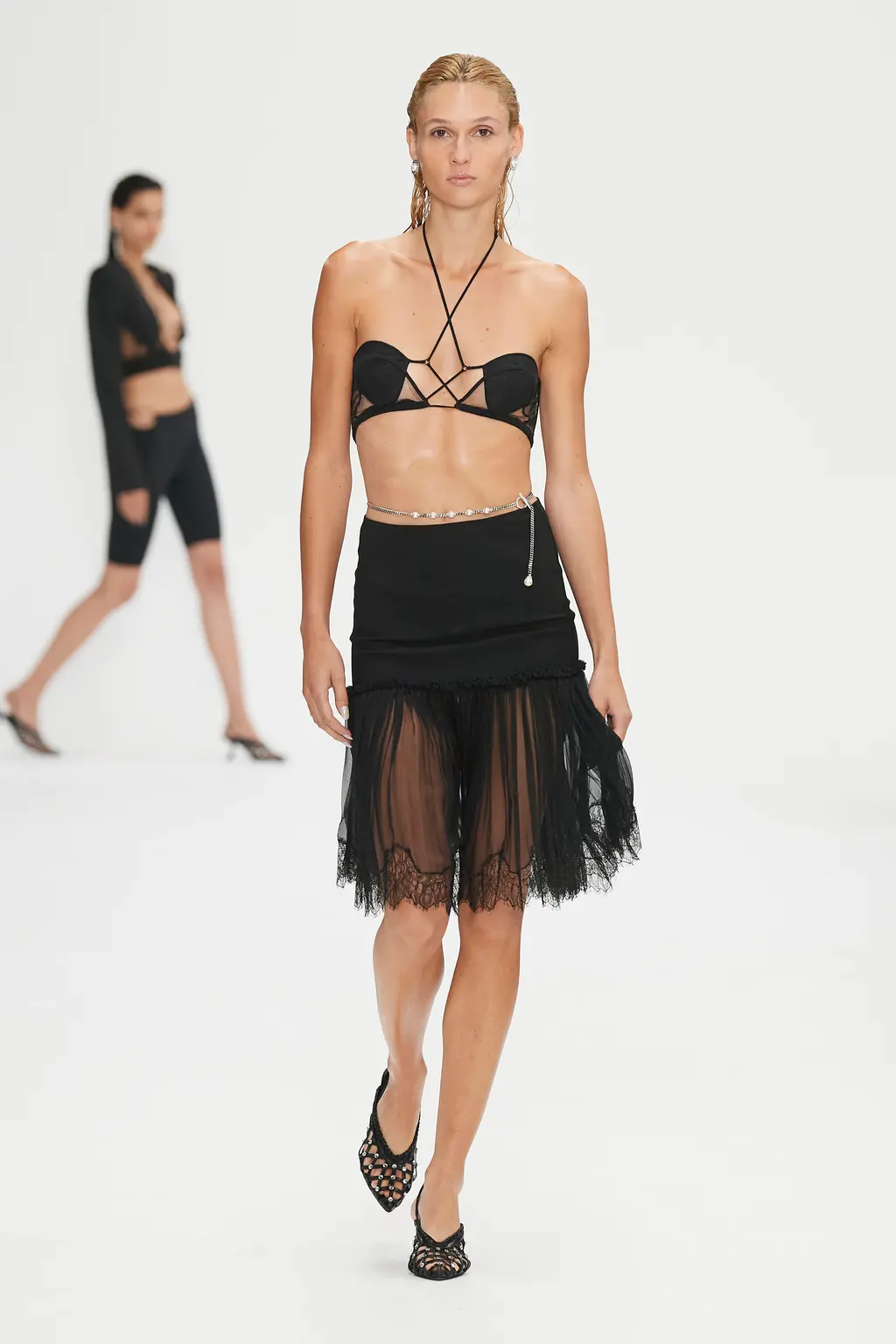 Returning to the runway for the first time since the pandemic, Christopher and Tammy Kane’s SS23 collection was something of a whistle stop tour through the brand’s archives, from the nods to fetish wear and anatomical references, to the fabrics that spanned tacky-but-not-tacky lace, lashings of clear vinyl and glittering chain mail.