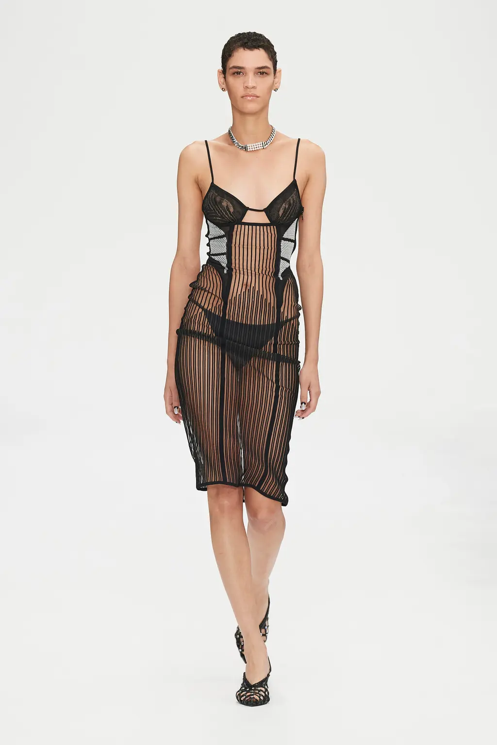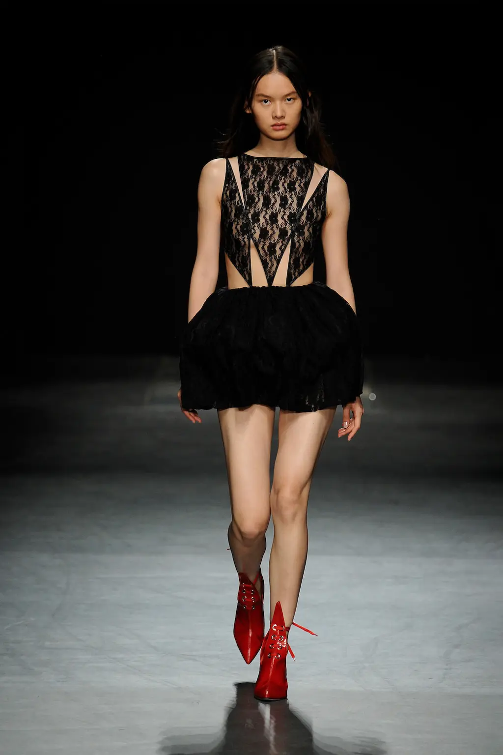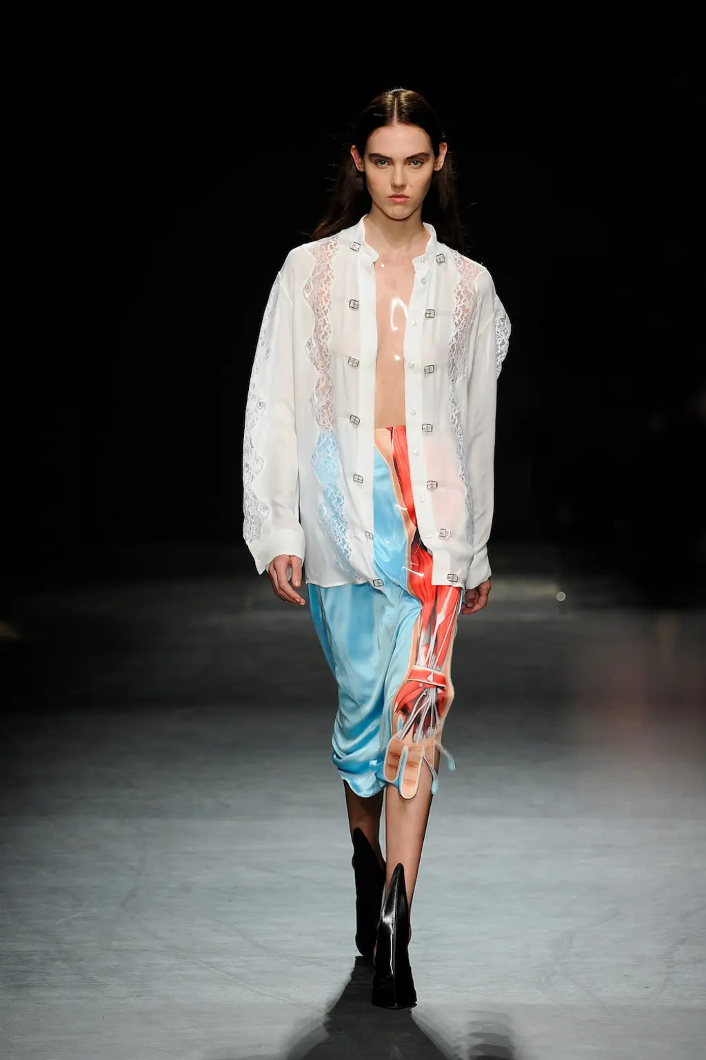 This collection did exactly that: lace-trimmed dresses in sugared almond pastel hues were cut with clear vinyl panelling and see-through, skeletal straps that caged the abdominal area; suit trousers were anything but sensible, now spliced at the seams; tops were appliquéd with anatomical drawings of hands, arms and legs; geometric panelled lace dresses were juxtaposed with playful, sculptural peplum skirts.